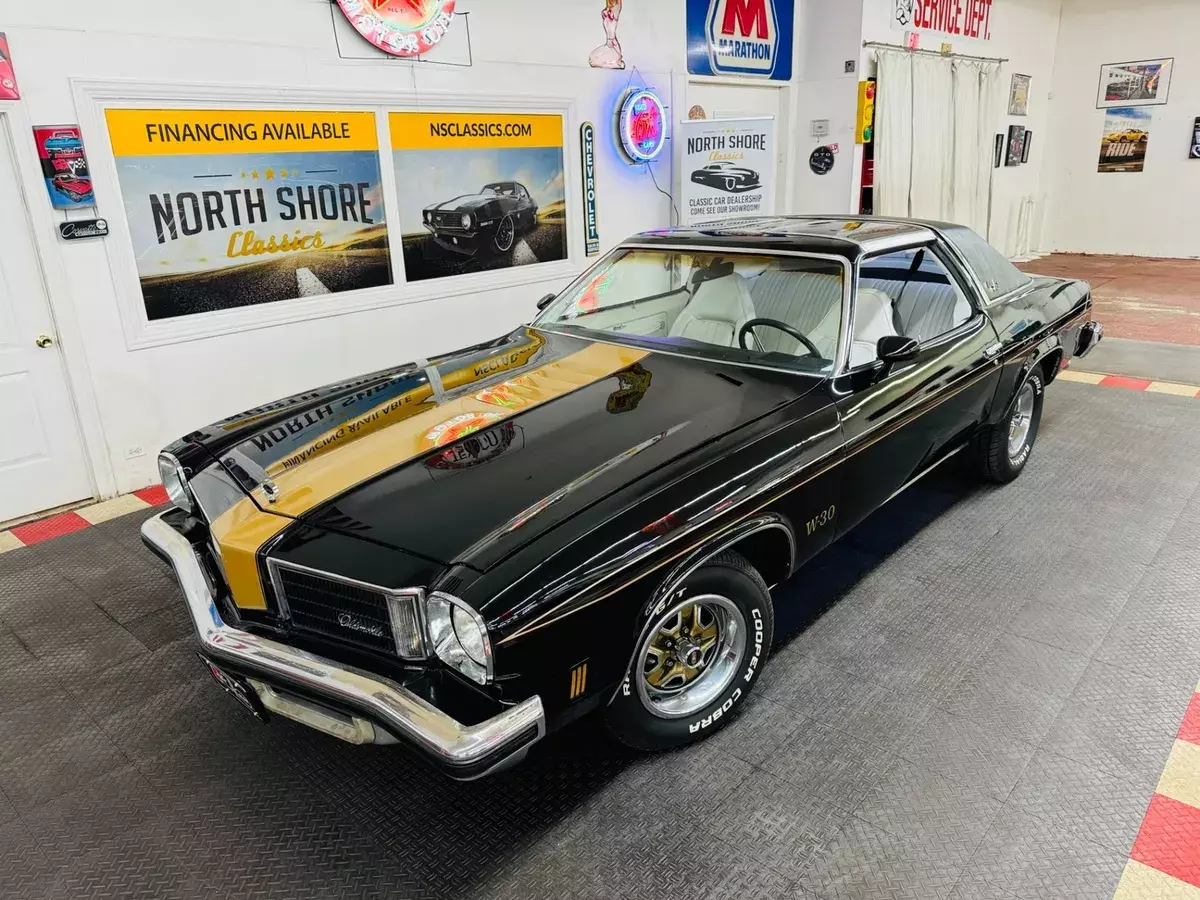 *1975 OLDSMOBILE CUTLASS*REAL HURST OLDS W-30*BLACK EXTERIOR*WHITE INTERIOR*T-TOPS (one is cracked, but does not leak)*WAS ORIGINALLY A 455 C.I. ENGINE*NOW HAS A 350 C.I. ENGINE*AUTOMATIC TRANS*SWIVEL BUCKETS W/CENTER CONSOLE*HURST DUAL GATE SHIFTER*SPECIAL LOUVERED HOOD*POWER STEERING*POWER BRAKES*NEW TIRES*RECENT TUNE-UP AND OIL CHANGE**CALL US TODAY844-652-8767**ASK ABOUT OUR EASY FINANCE OPTIONS**WE SHIP WORLD WIDE