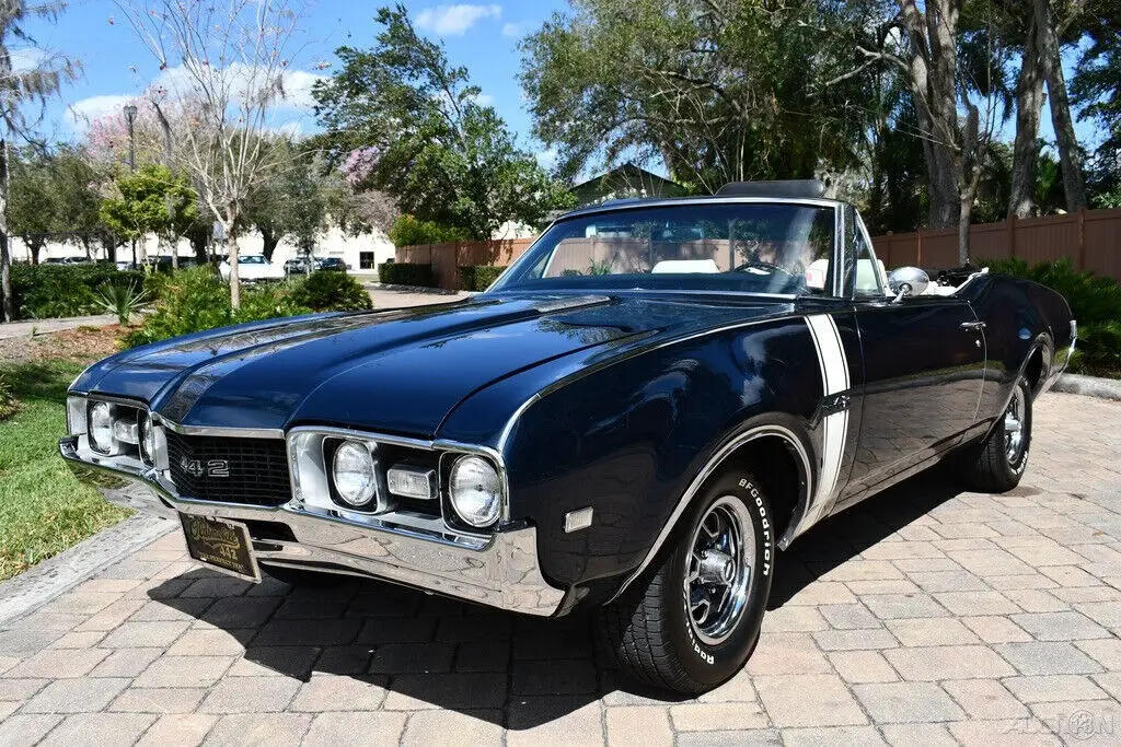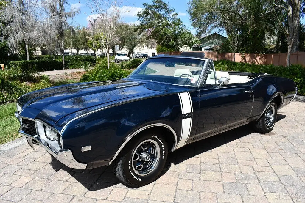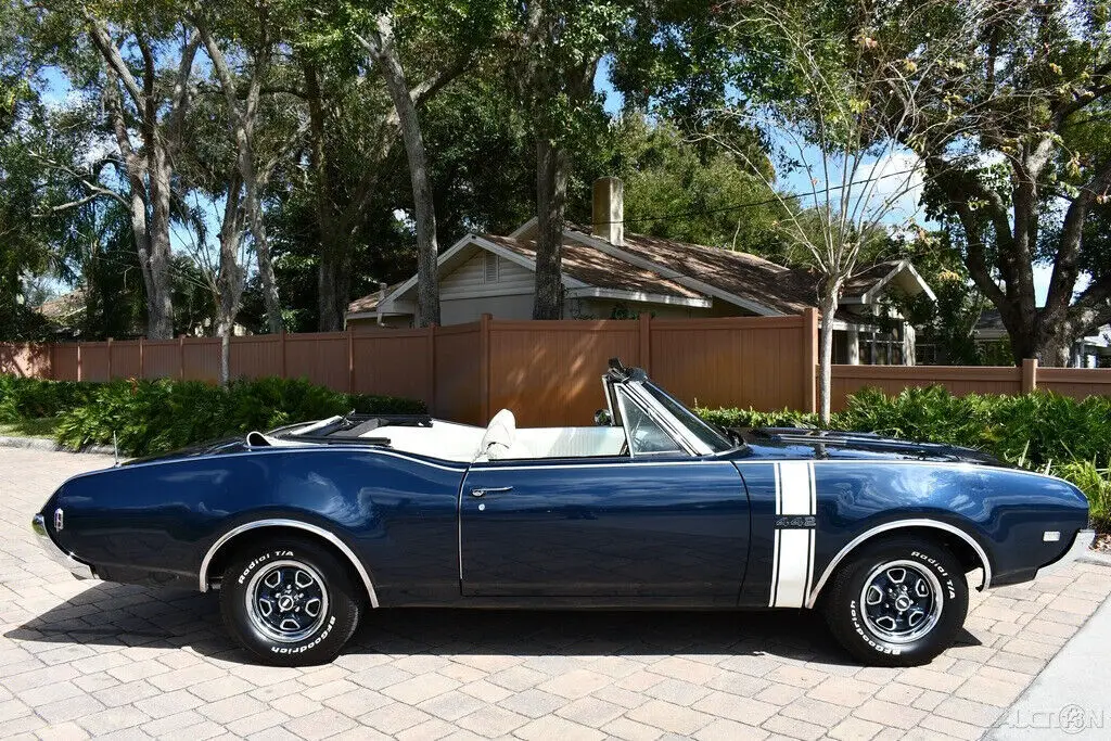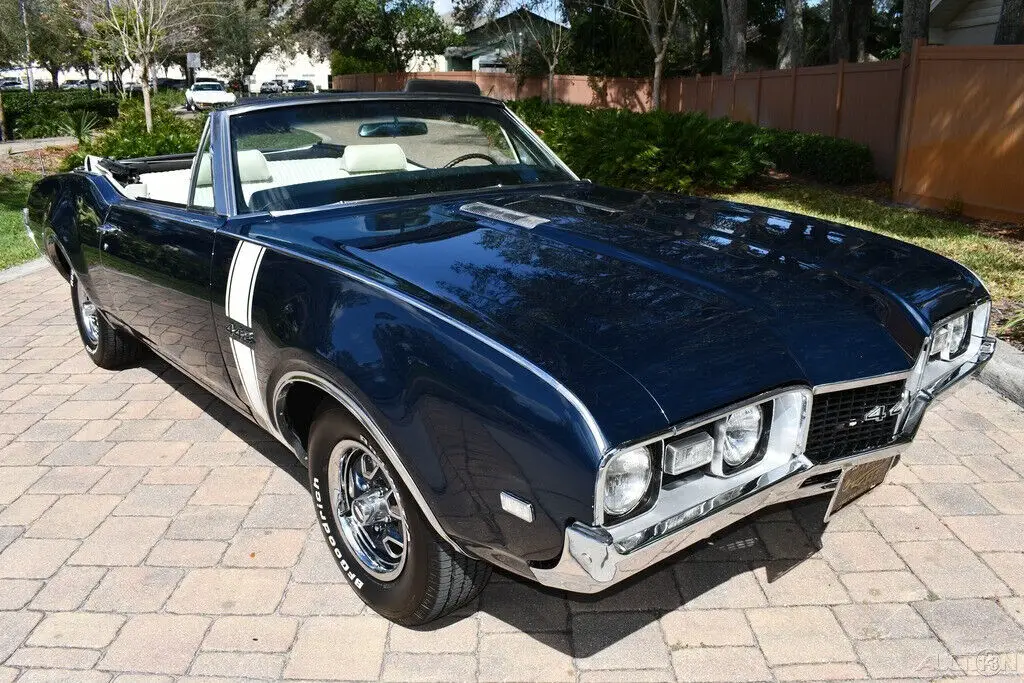 Remarkable 1968 Oldsmobile 442 Convertible Numbers Matching 400ci V8 Engine 4 Speed Muncie Transmission Posi Traction Rear end Blue Exterior Tilt Wheel White Bucket Seats Power Steering Power Brakes Power Trunk Release &