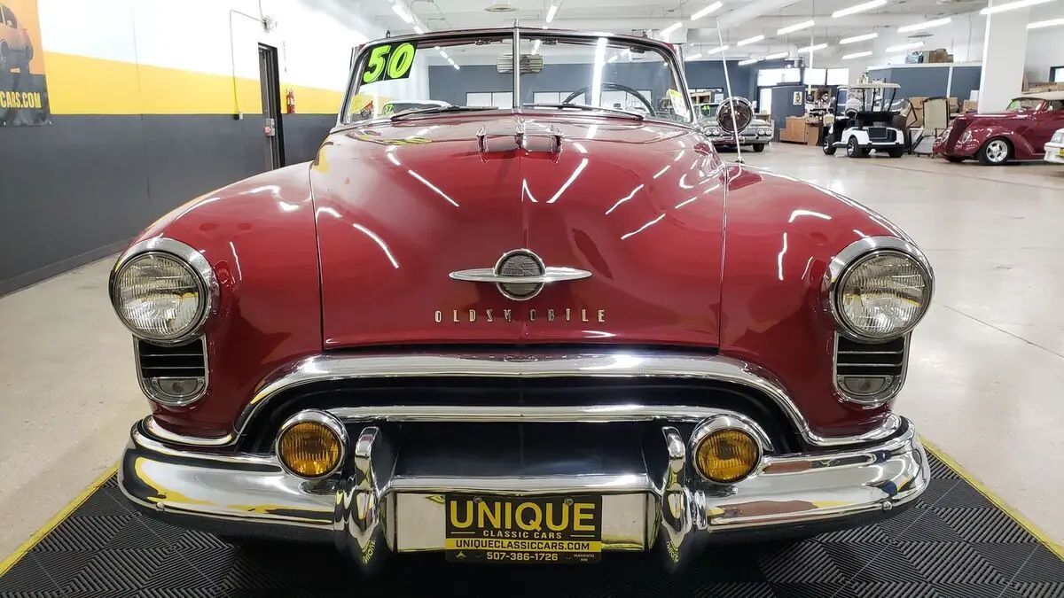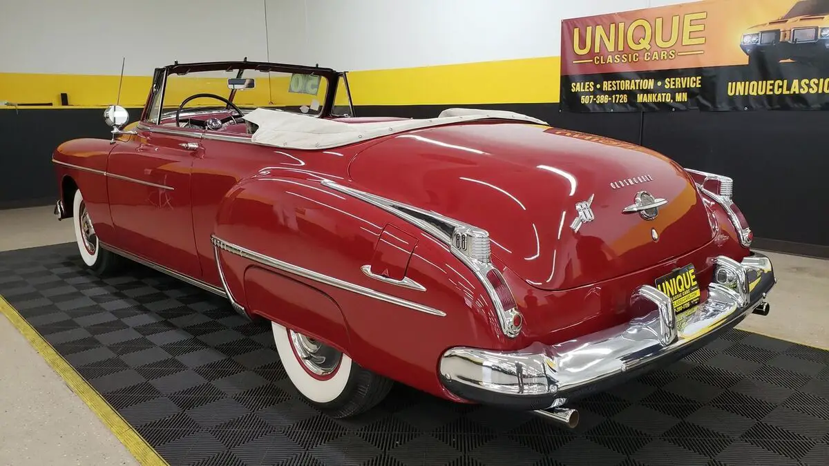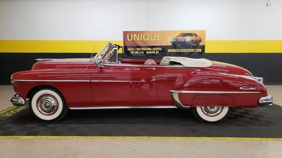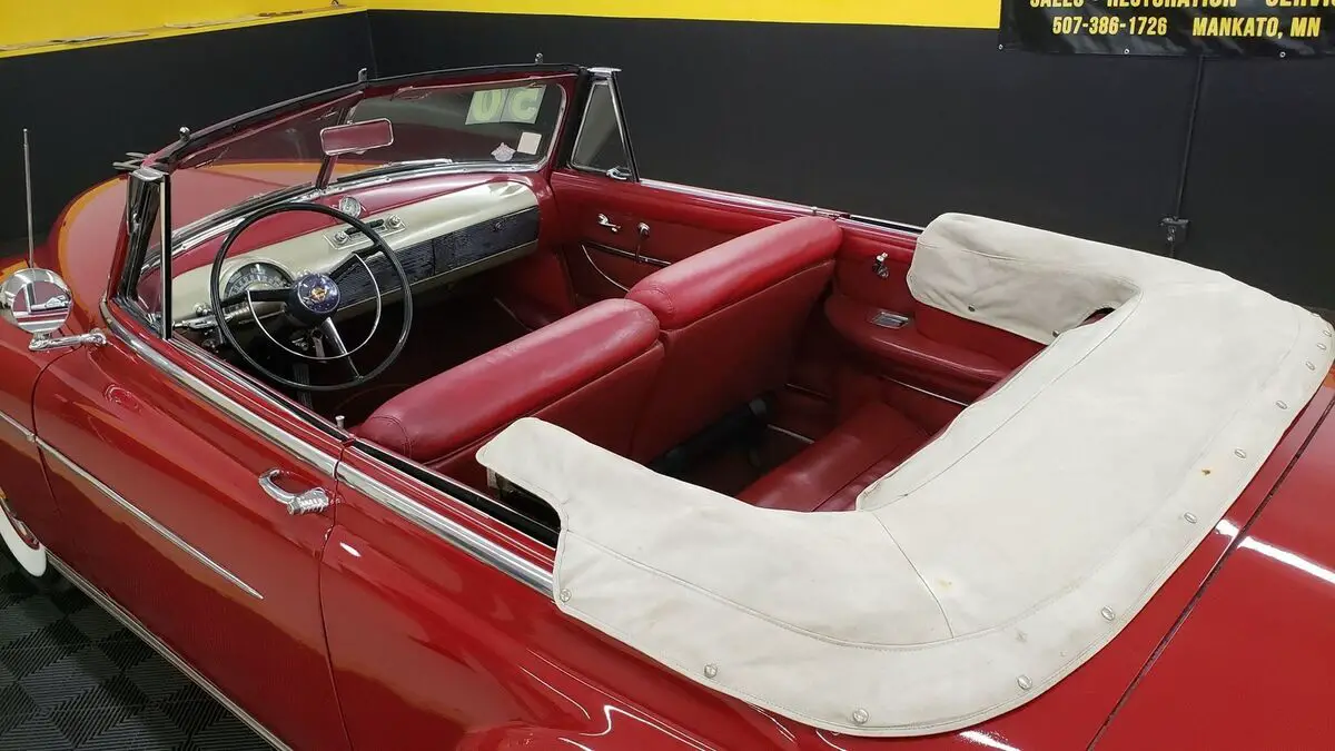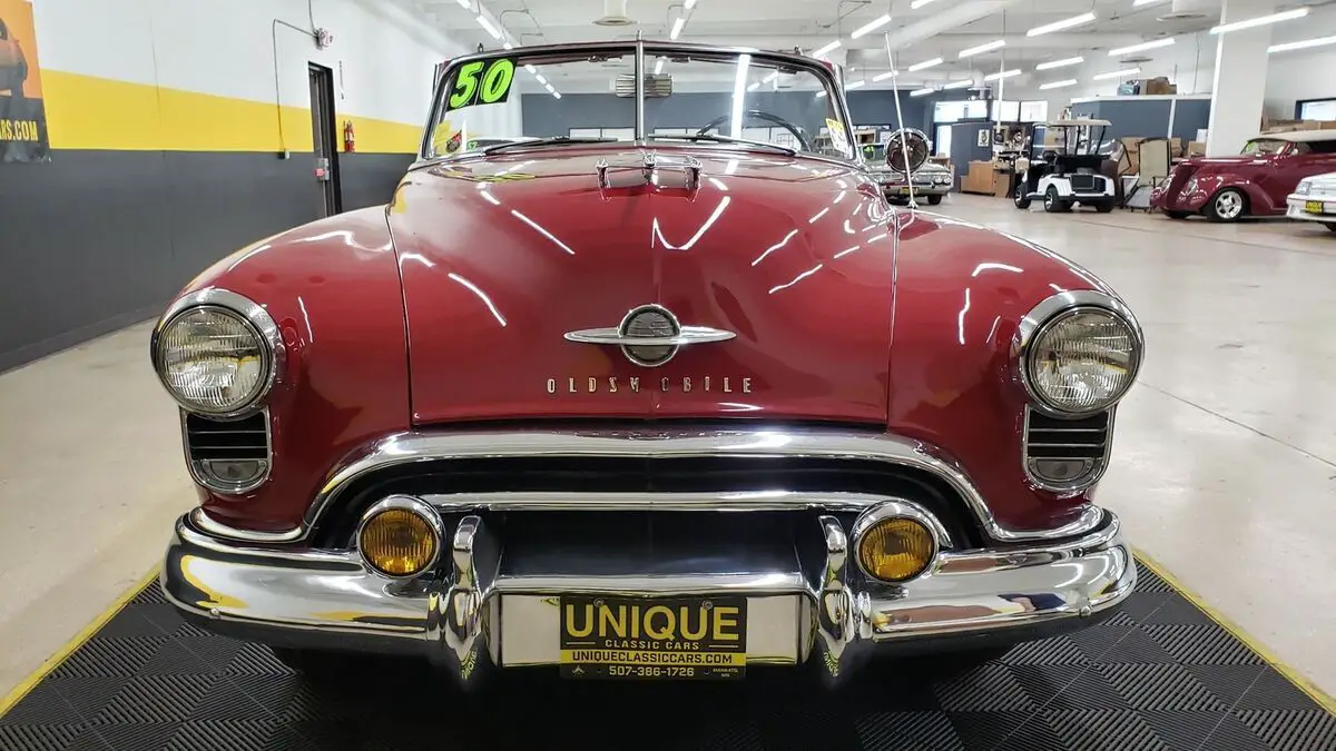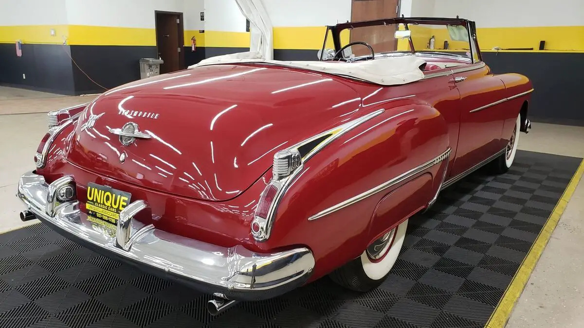 1950 Oldsmobile 88 Convertible in Red paint. This one has a 303 Rocket V8 under the hood with a 4-speed Hydramatic auto transmission. Riding on red steel wheels with wheel covers and wide whitewall bias ply tires - a killer look on this classic Olds. Rear fender skirts included with purchase. Red leather bench seat interior with tan colored dash. Tan parade boot included as well. Combo spotlight rear view mirror on the drivers side. Seats in good shape overall with seat belts up front. Power convertible top does work but it is slow going up and down. Starting procedure while in neutral: push two chrome switches under dash to the right, turn the key on, wait 20-30 seconds, pump the gas pedal a couple times, then hit the push button starter on the dash. Caramel colored top with glass rear window - fits well and appears to be newer!