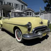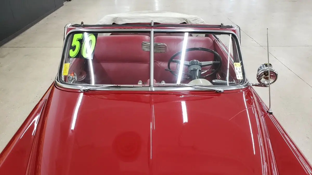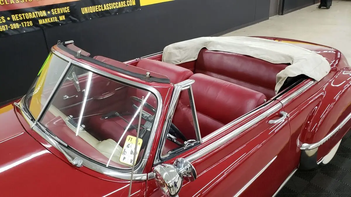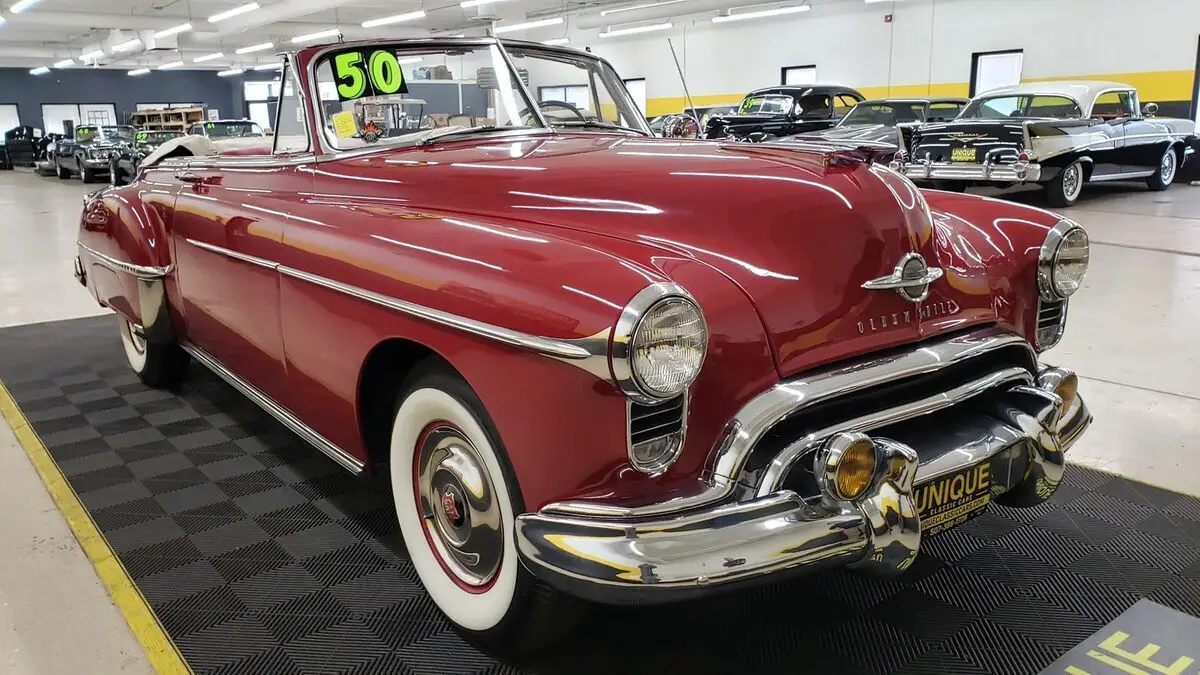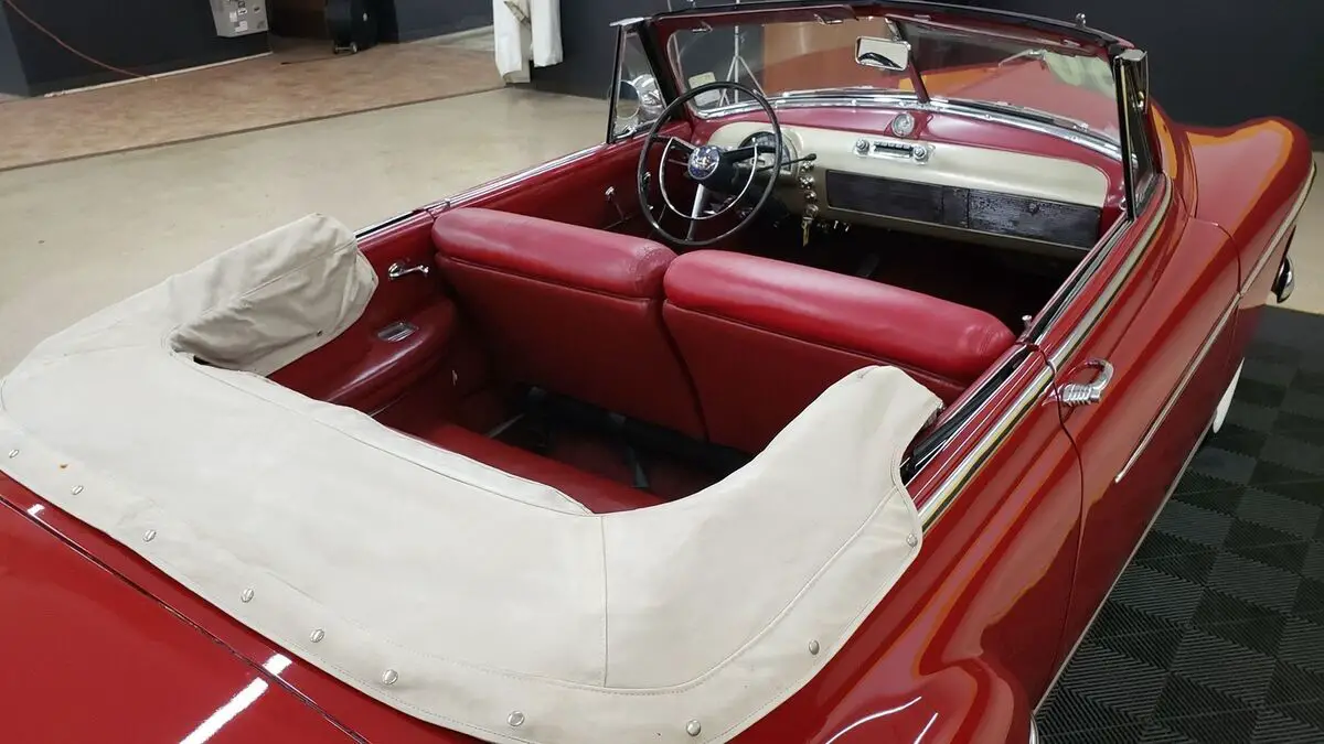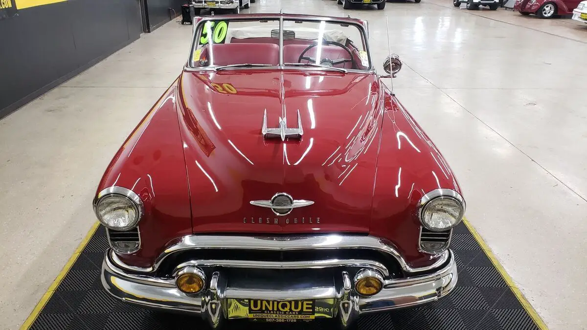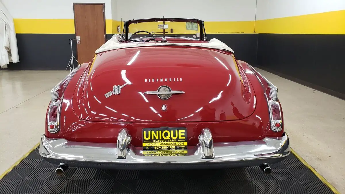 1950 Oldsmobile 88 Convertible in Red paint. This one has a 303 Rocket V8 under the hood with a 4-speed Hydramatic auto transmission. Riding on red steel wheels with wheel covers and wide whitewall bias ply tires - a killer look on this classic Olds. Rear fender skirts included with purchase. Red leather bench seat interior with tan colored dash. Tan parade boot included as well. Combo spotlight rear view mirror on the drivers side. Seats in good shape overall with seat belts up front. Power convertible top does work but it is slow going up and down. Starting procedure while in neutral: push two chrome switches under dash to the right, turn the key on, wait 20-30 seconds, pump the gas pedal a couple times, then hit the push button starter on the dash. Caramel colored top with glass rear window - fits well and appears to be newer!