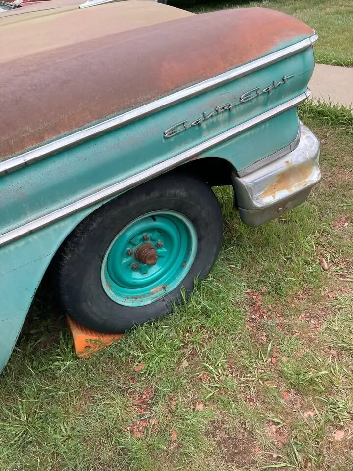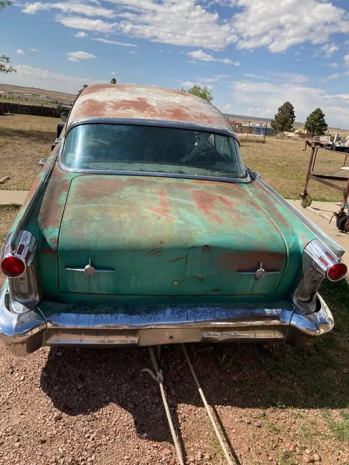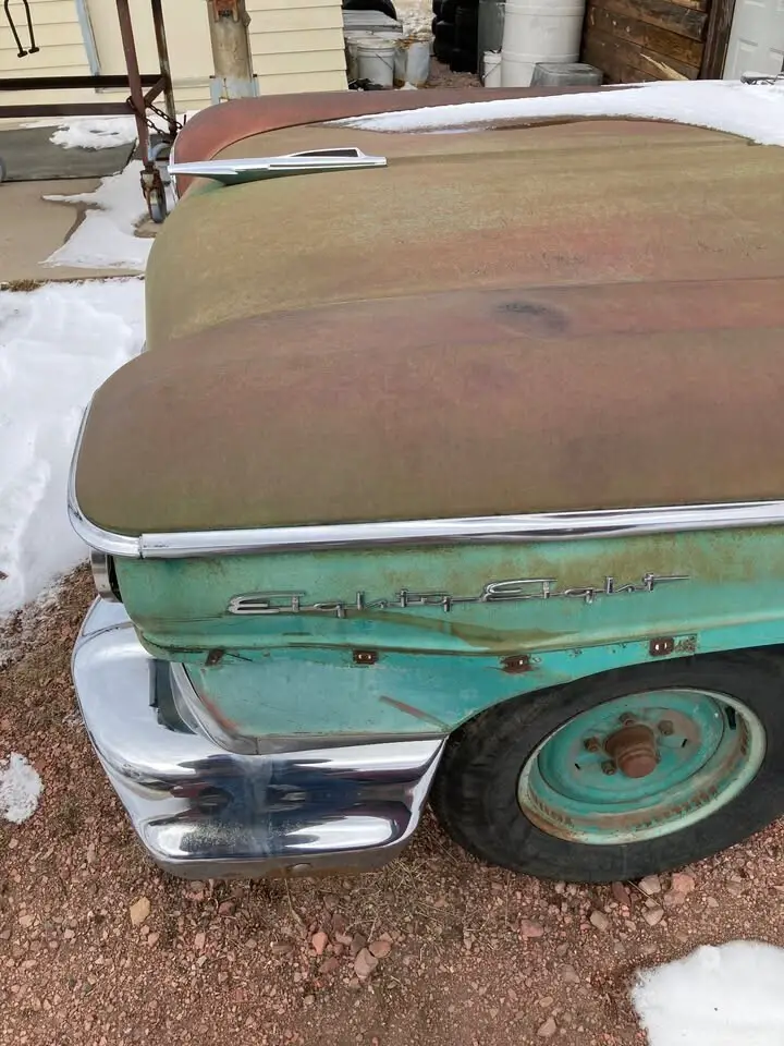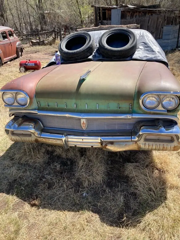 For Sale is one used 1958 Oldsmobile Dynamic 88 Four Door hardtop. This car was purchased new in 1958 by my Grandmother. It is an Arizona car. I have a clear Wyoming title for it. All original and mostly complete in non- running condition. Has the original 371 Rocket V-8 engine with the original four speed Hydra-Matic automatic transmission. The engine is not locked up and will turn over with the starter. The starter was recently rebuilt at a local Auto Electric shop. I believe the engine will run if a new set of spark plugs, spark plug wires, and points are installed. The water pump will need to be freed up or replaced. The engine and transmission were working when the car was parked many years ago. The body is mostly straight with some dents and scrapes. The chrome is good and mostly complete. The front left fender is damaged and it's lower chrome is missing. The front bumper is damaged. Solid floors, trunk, and frame. No rust through on the fenders or floors. Overall rust free, some rust around the left rear inside sill plate and surface rust. The passenger front window is broken out. The glass is mostly good, the windshield has some chips. The original radio antenna comes with the car. The interior is poor, both seats need reupholstered. Needs new door panels, carpet, head liner, and dash pad. The instrument panel and radio have not been altered and are complete except for a missing cigarette lighter. The tires are in fair condition. The car has five original rims(one is the spare) and the four original hubcaps. Also, the original jack and lug wrench come with the car. Two ignition and two trunk keys come with the car. Great builder to restore or install a special engine and drivetrain. Four door cars are underrated. Payment with cash, bank draft, cashier's check or personal check. The vehicle will not be released until payment with cash or check clears. Buyer responsible to bring a trailer to my location and remove the vehicle within 14 days. Text me or call for questions, etc. at 1-307-680-9020. Serious buyers only! Thanks for looking!
