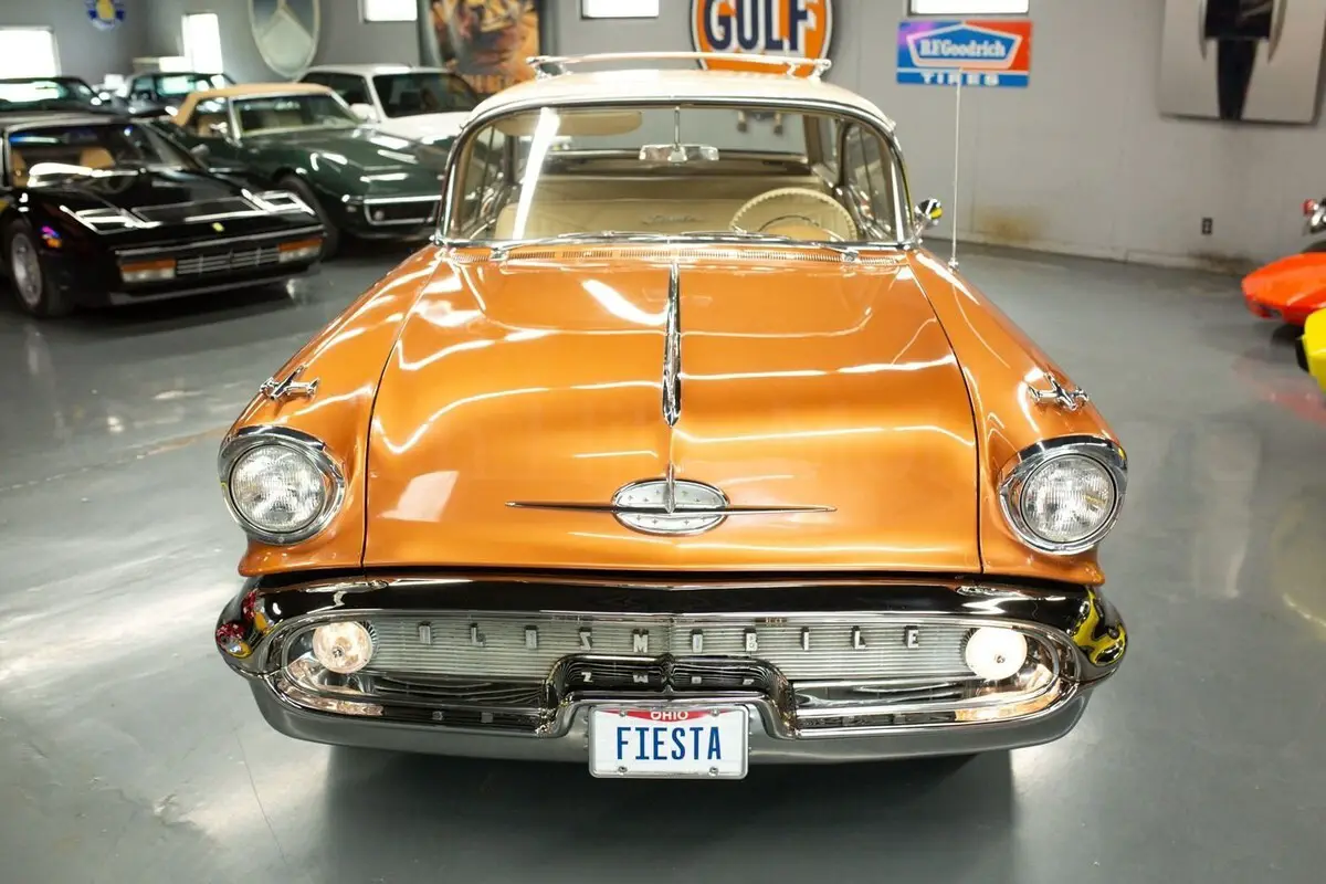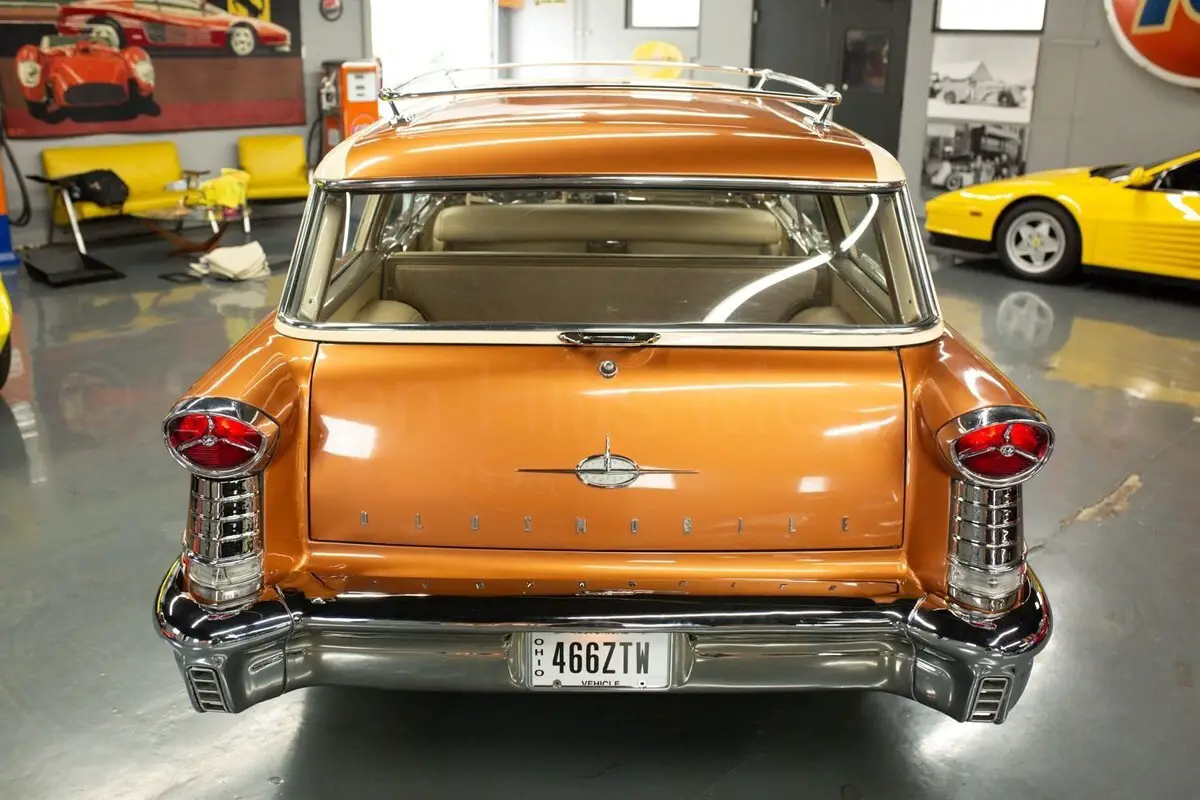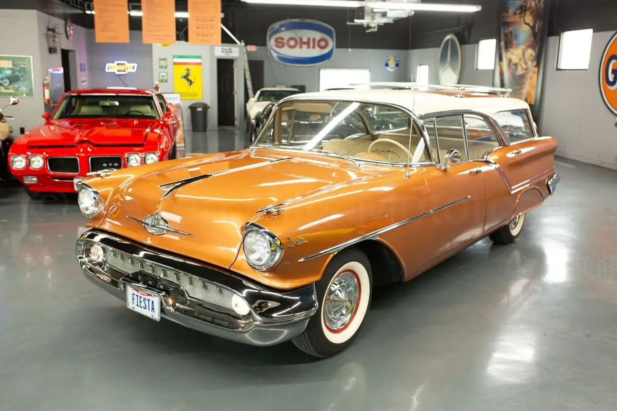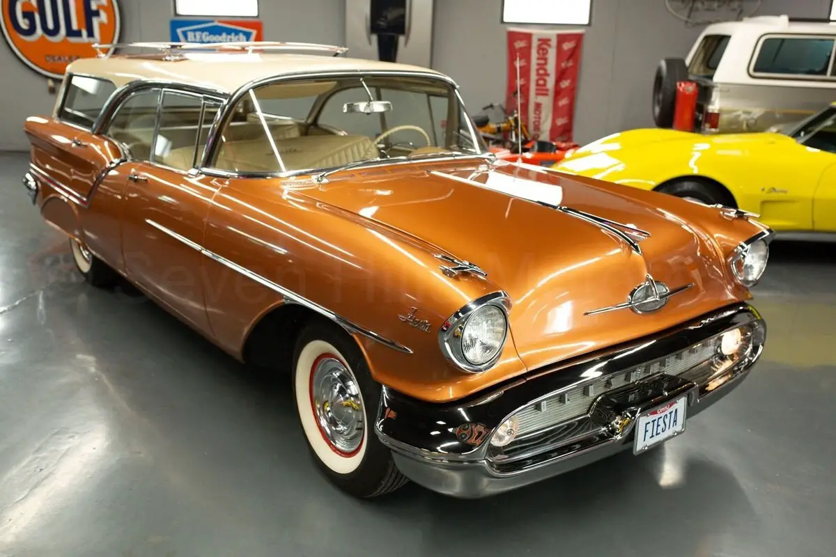 Please call Matt directly at 513-708-1468 with any questions about this wagon.Seven Hills Motorcars is very proud to offer this absolutely spectacular 1957 Oldsmobile 88 Fiesta Station Wagon, with only 79,225 original miles. This Fiesta was treated to an extremely high-quality restoration. The wagon has a stunning paintjob, brilliantly refinished chrome, and a beautiful interior and top. The wagon is finished in the beautiful and highly desirable color combination of Cutlass Bronze (64) and Shantung Beige (63) with Festival Red (20) accents. This appear to be the correct and original paint scheme as those codes appear on the trim tag, which is pictured in this ad.
