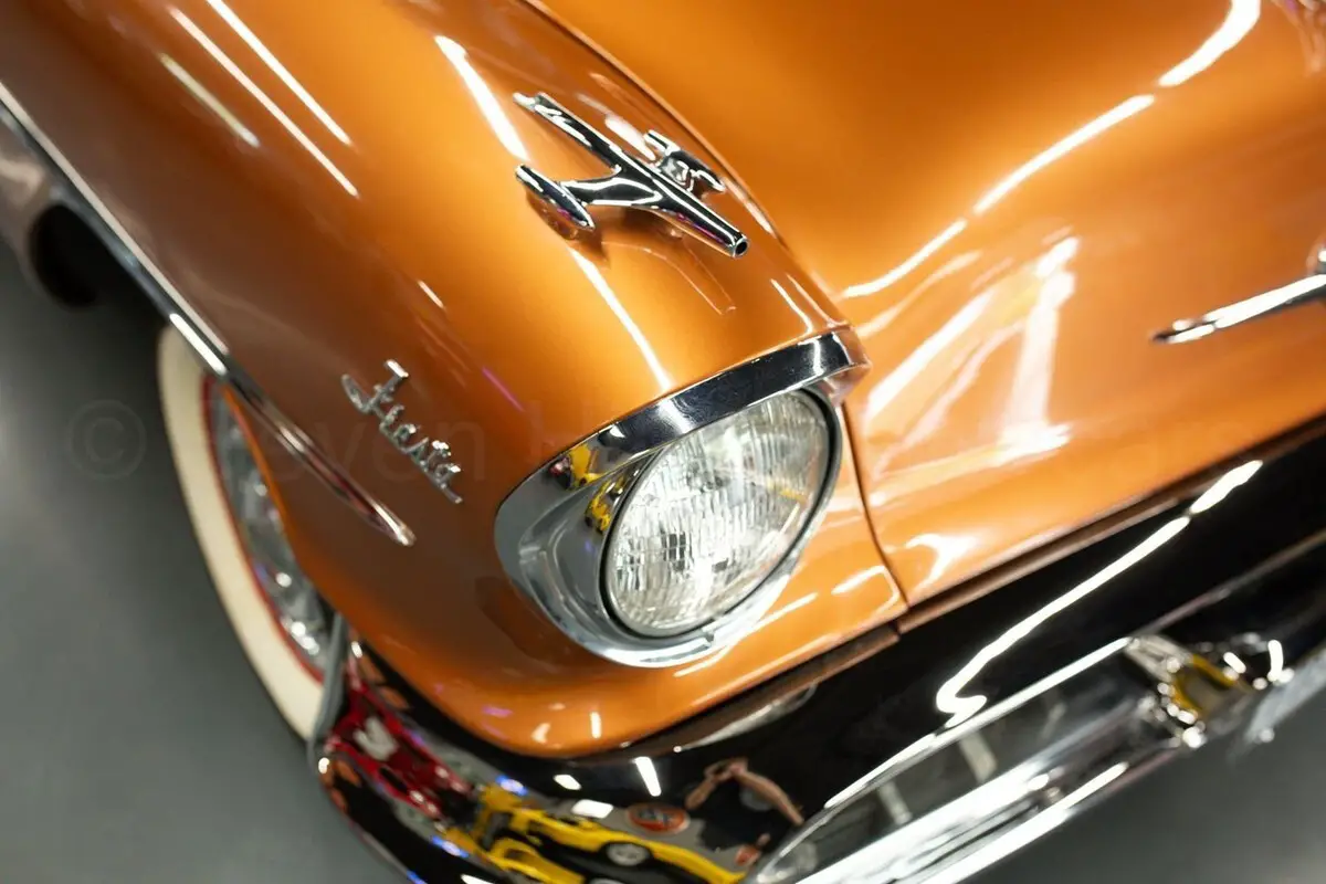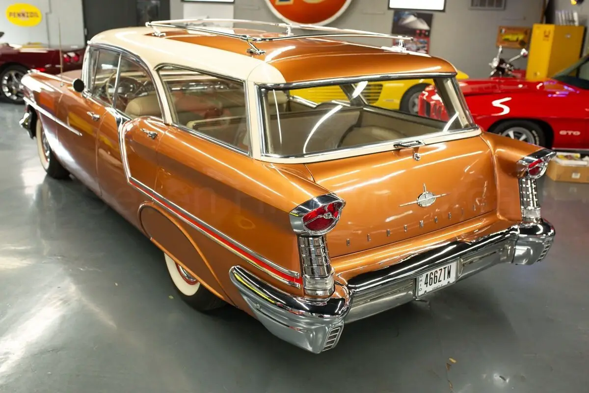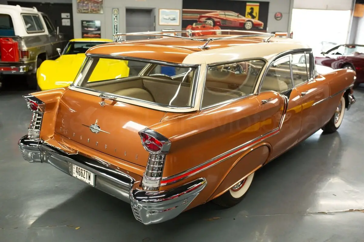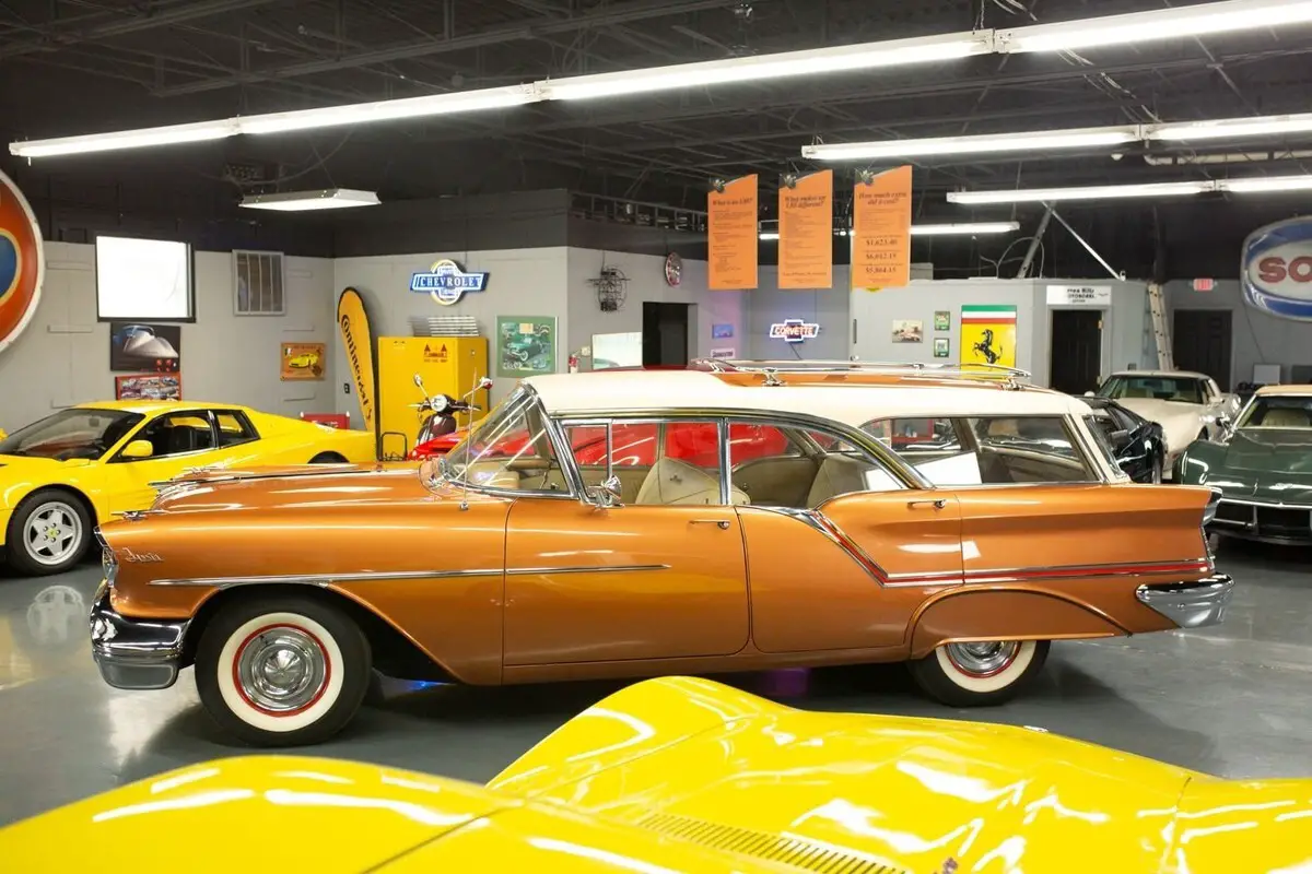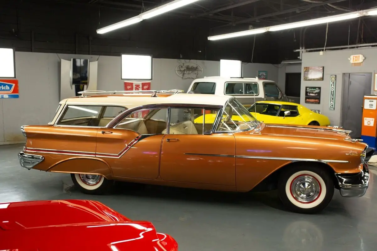 Please call Matt directly at 513-708-1468 with any questions about this wagon.Seven Hills Motorcars is very proud to offer this absolutely spectacular 1957 Oldsmobile 88 Fiesta Station Wagon, with only 79,225 original miles. This Fiesta was treated to an extremely high-quality restoration. The wagon has a stunning paintjob, brilliantly refinished chrome, and a beautiful interior and top. The wagon is finished in the beautiful and highly desirable color combination of Cutlass Bronze (64) and Shantung Beige (63) with Festival Red (20) accents. This appear to be the correct and original paint scheme as those codes appear on the trim tag, which is pictured in this ad.