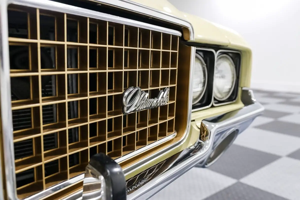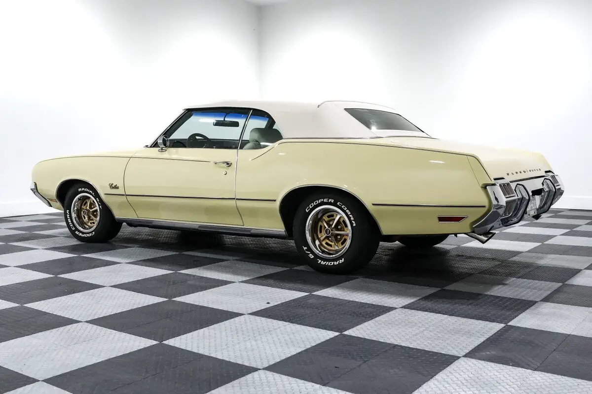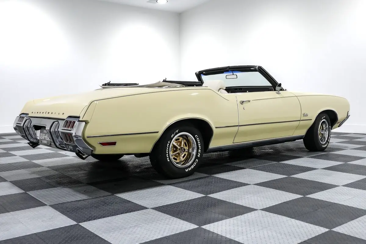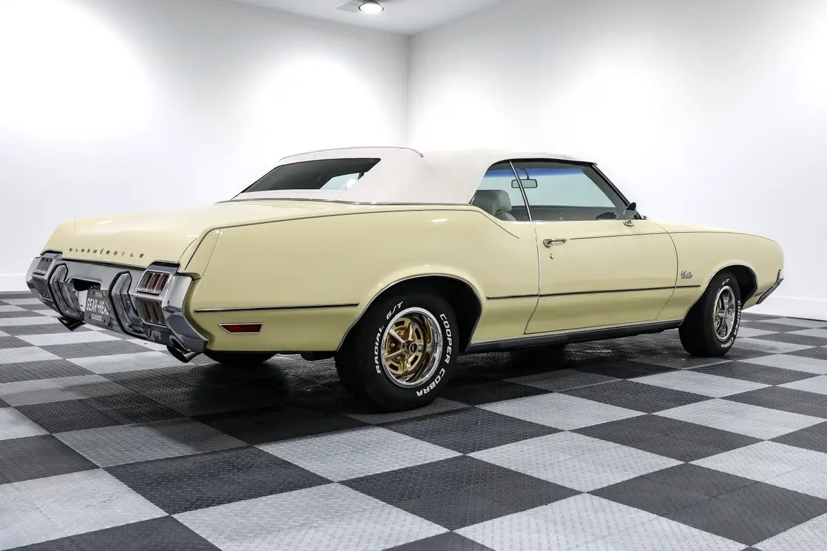 Top up or top down, it turns heads. The power convertible top drops in seconds, and the 14-inch Oldsmobile Rally wheels add a classic touch that ties the whole look together. The stance is stock, the vibe is pure '70s muscle, and the sound is all Olds.