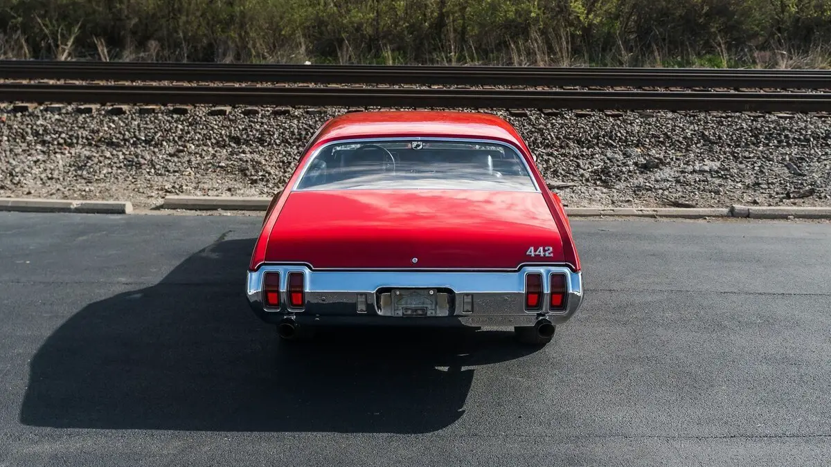 Oldsmobile's modernist, mid-century design aesthetic was no doubt a play on its engineering leadership within the GM hierarchy, and the cars that proudly carry those lines continue to weather exceptionally well. At the front of this coupe, a 442-specific grille centers monochromatic "442" lettering between stainless-trimmed headlights and a bright chrome bumper that's finished with clear parking lamps. At the top of that grille, a fiberglass ram air hood leads the eye to like-new glass that rides behind straight stainless frames. At the sides of that hood, traditional GM door handles and U35 sports styled mirrors perfectly complement clean marker lamps, dent-free wheel rings and a slick combination of "442" and of course the "W-30" fender emblems. And at the back of the car, a "442" branded decklid hangs below a second chrome bumper, silver-trimmed taillights and correct, trumpeted exhaust tips.