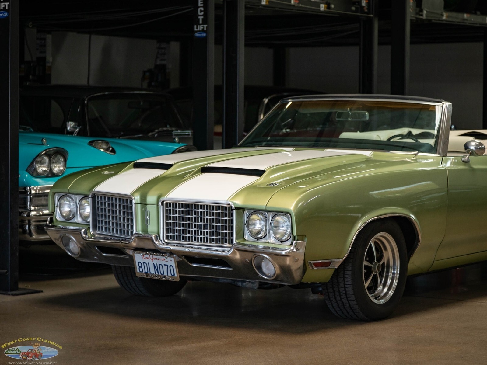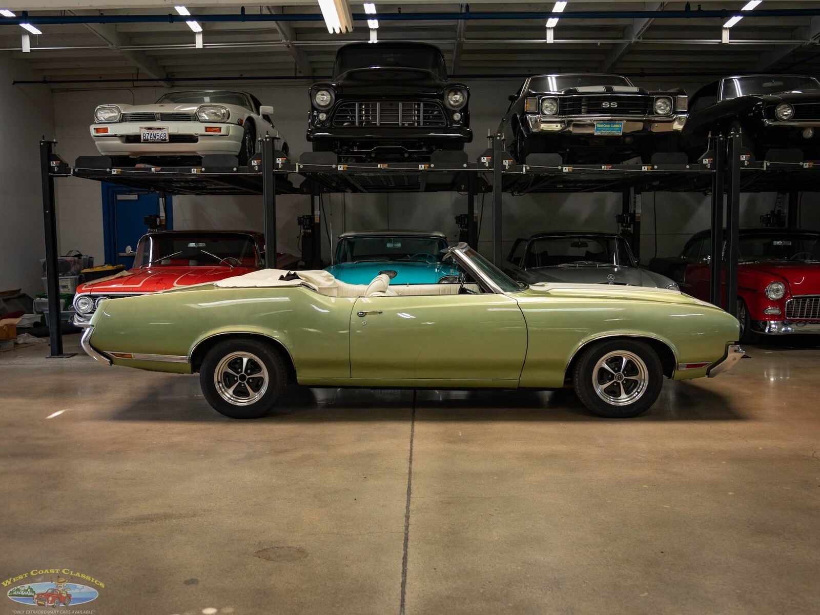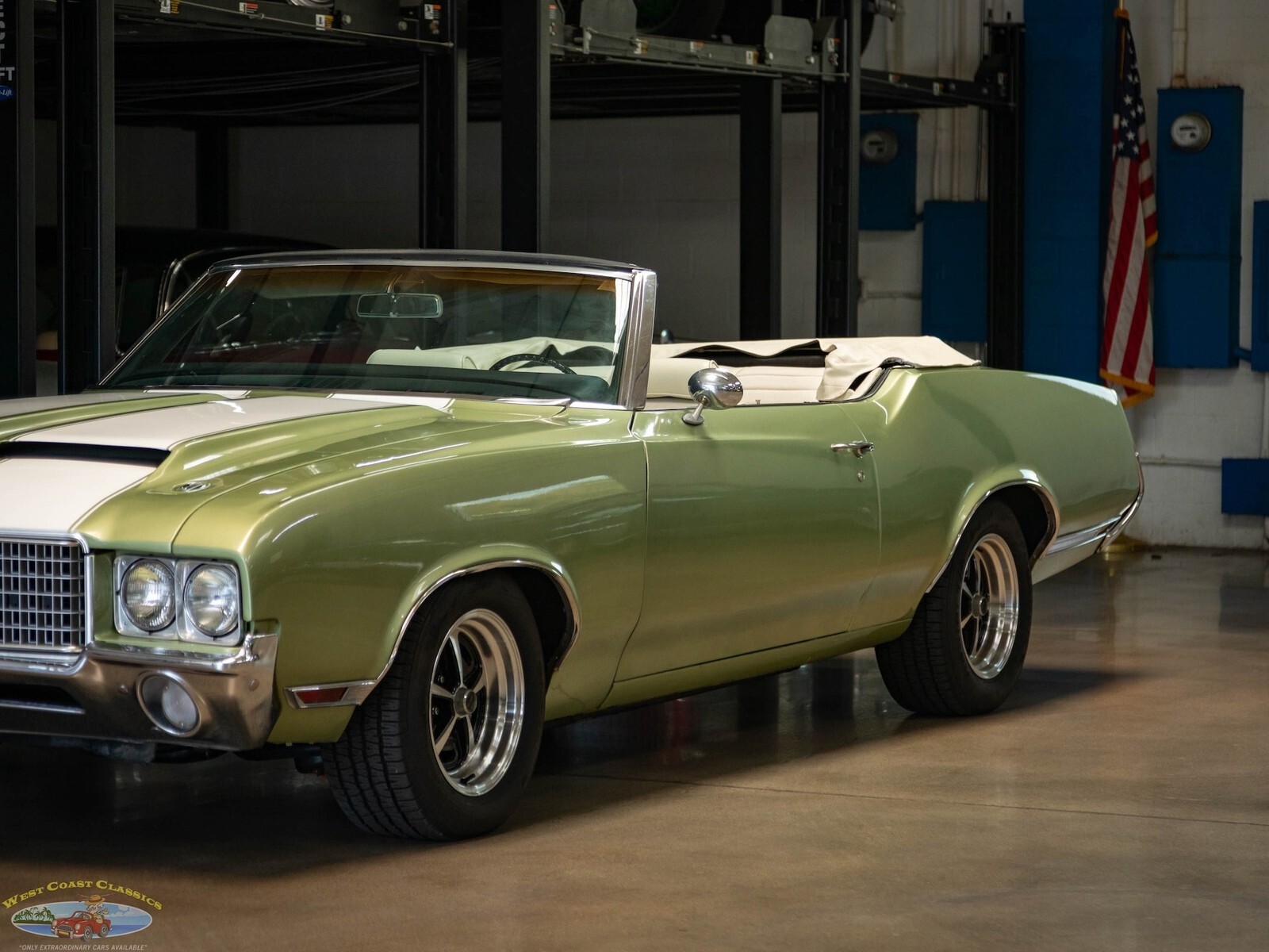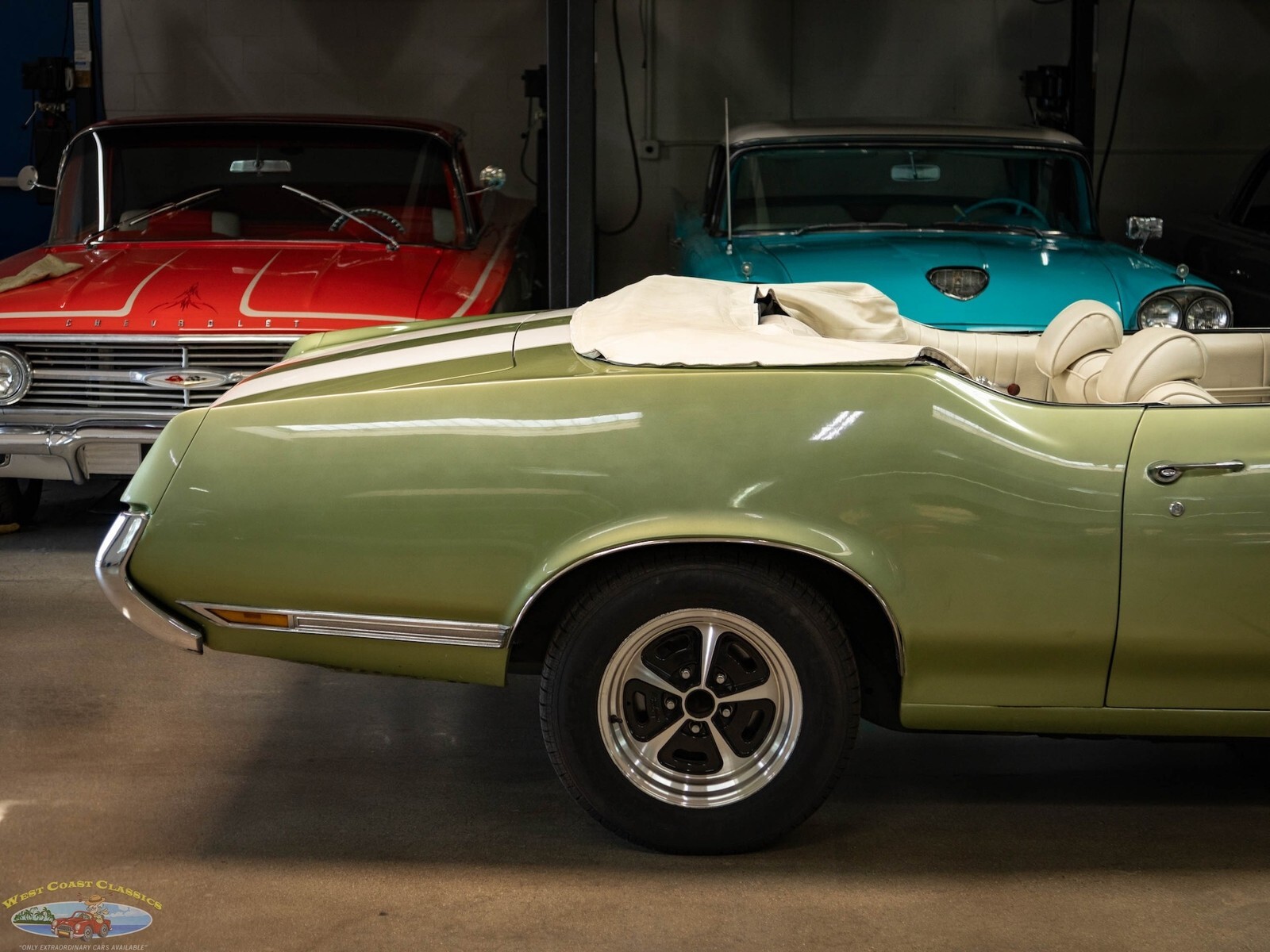 West Coast Classics are proud to present a beautiful example of this 1971 Oldsmobile Cutlass Supreme Convertible with it's original specifications and matching #'s 350 V8 Rocket engine & desirable factory 'Palm Green' (factory color code 42) paint with White Sports stripes and rare rally wheels which were optional. The car has its original factory 'White' (color code A) power soft top and original 'White' bench seat interior (Trim code 987) and significant factory options include: