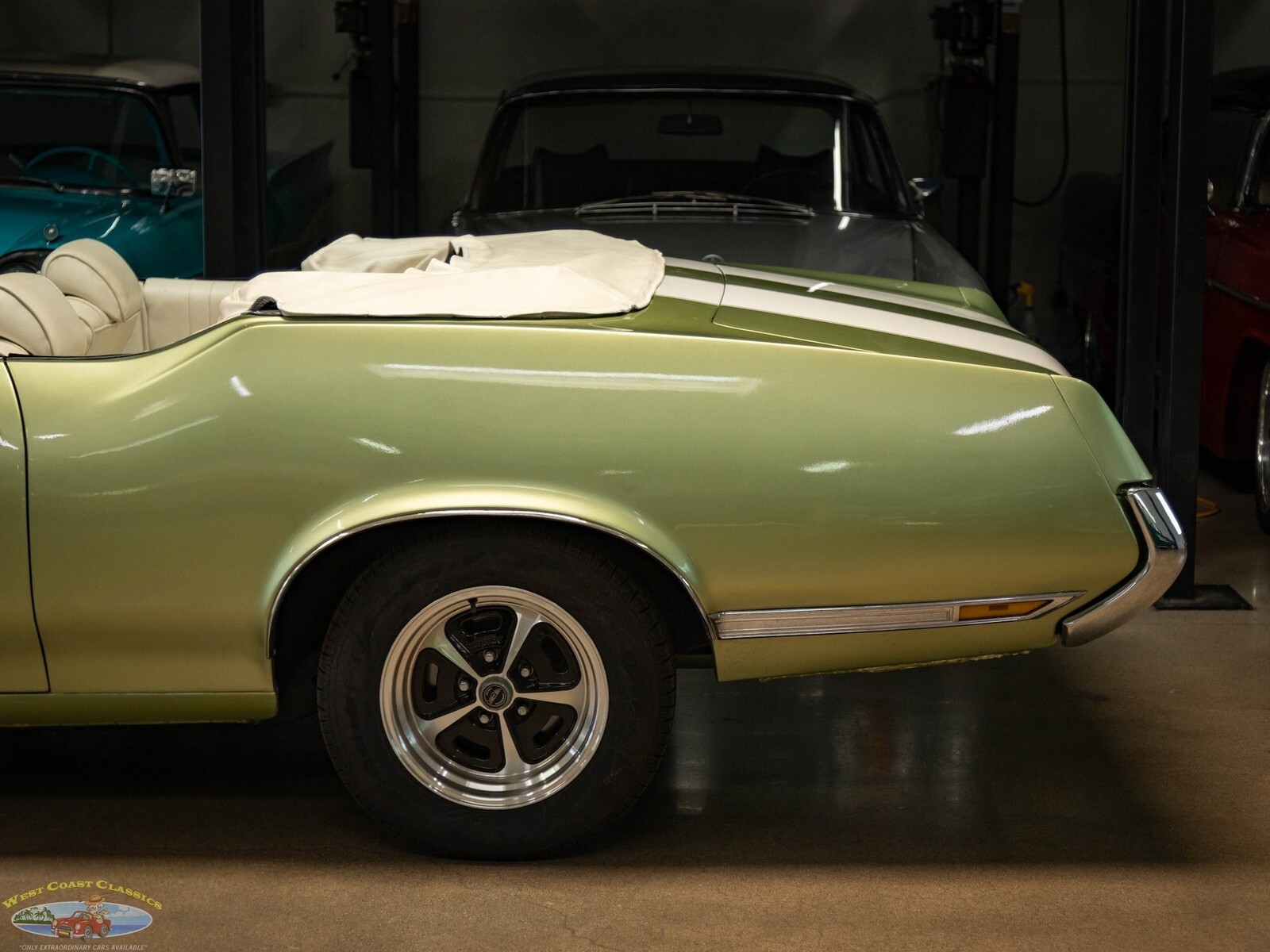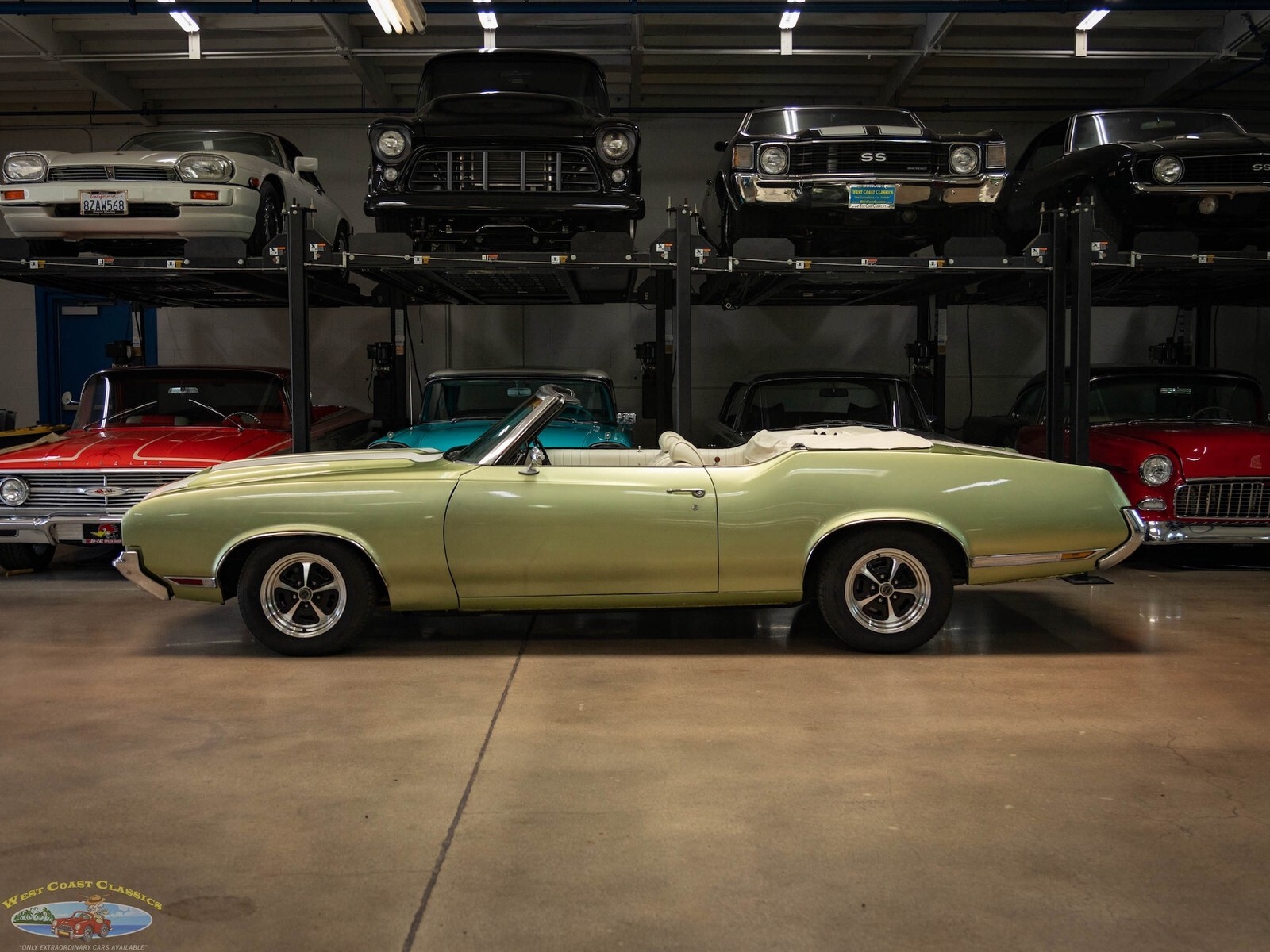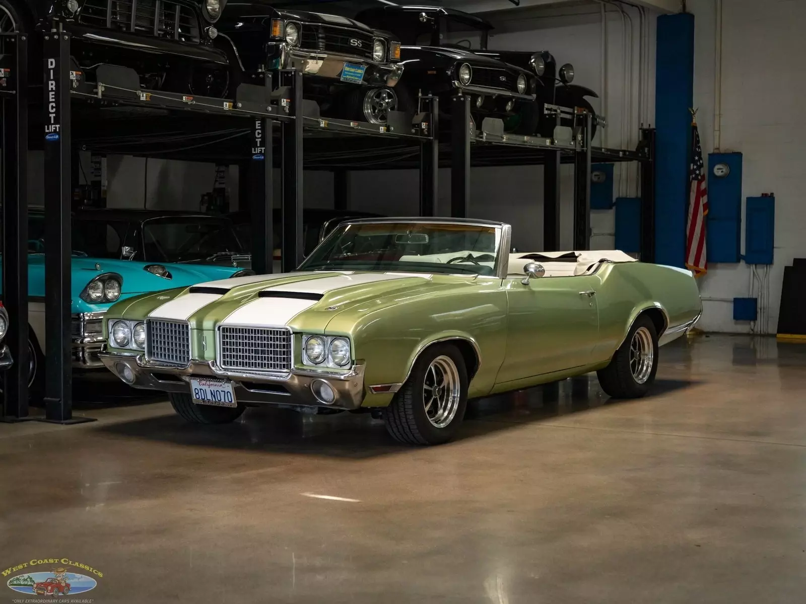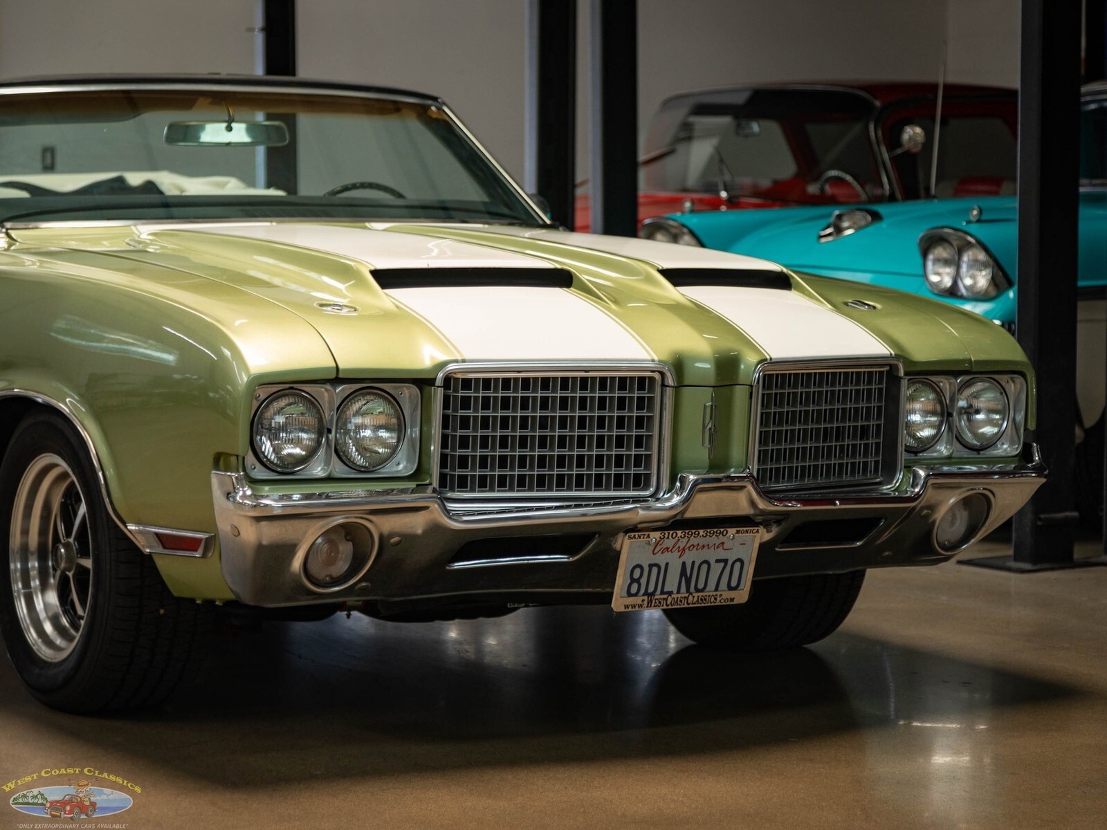 West Coast Classics are proud to present a beautiful example of this 1971 Oldsmobile Cutlass Supreme Convertible with it's original specifications and matching #'s 350 V8 Rocket engine & desirable factory 'Palm Green' (factory color code 42) paint with White Sports stripes and rare rally wheels which were optional. The car has its original factory 'White' (color code A) power soft top and original 'White' bench seat interior (Trim code 987) and significant factory options include: