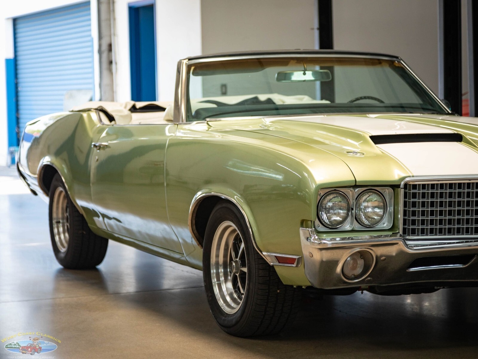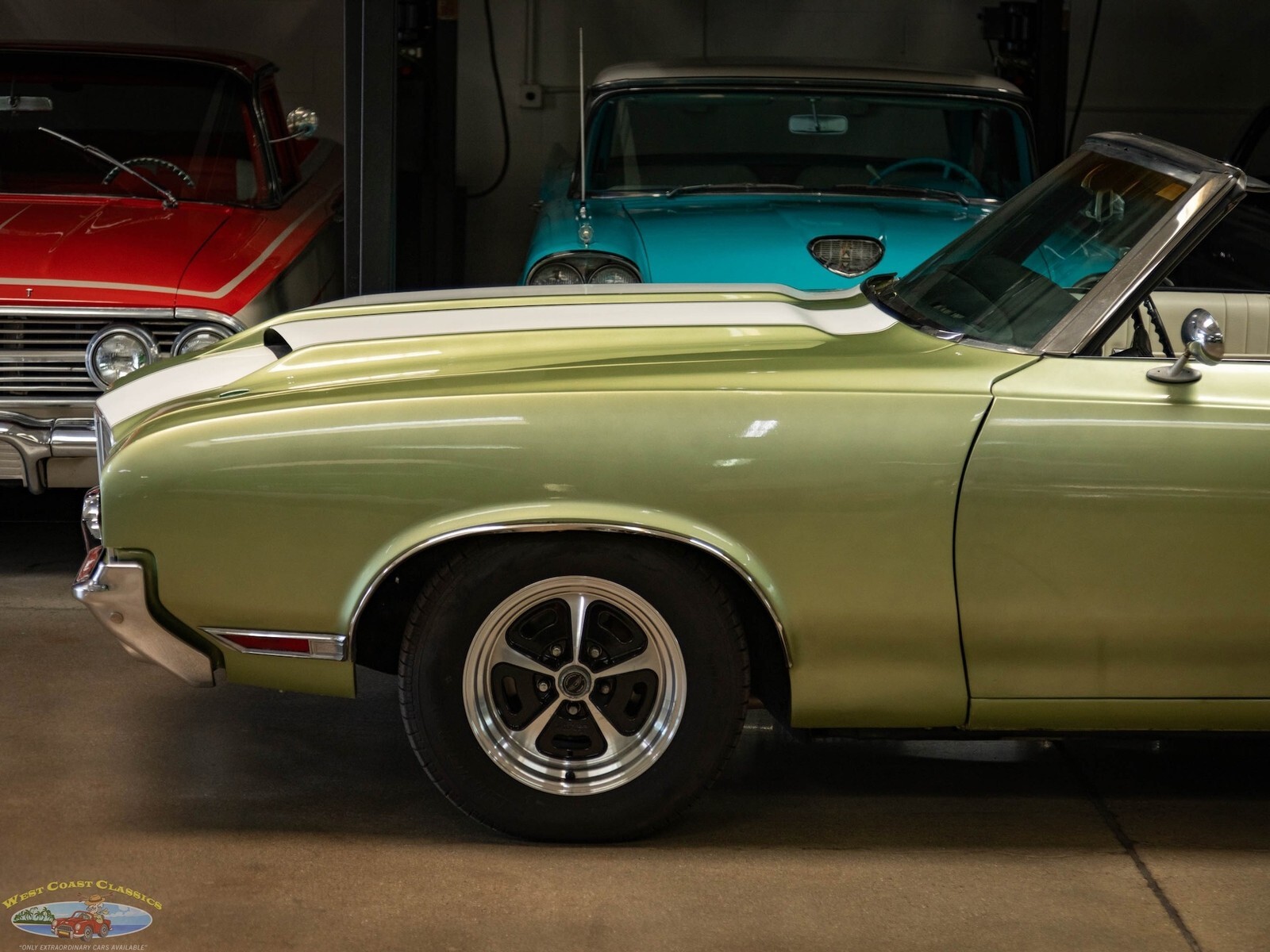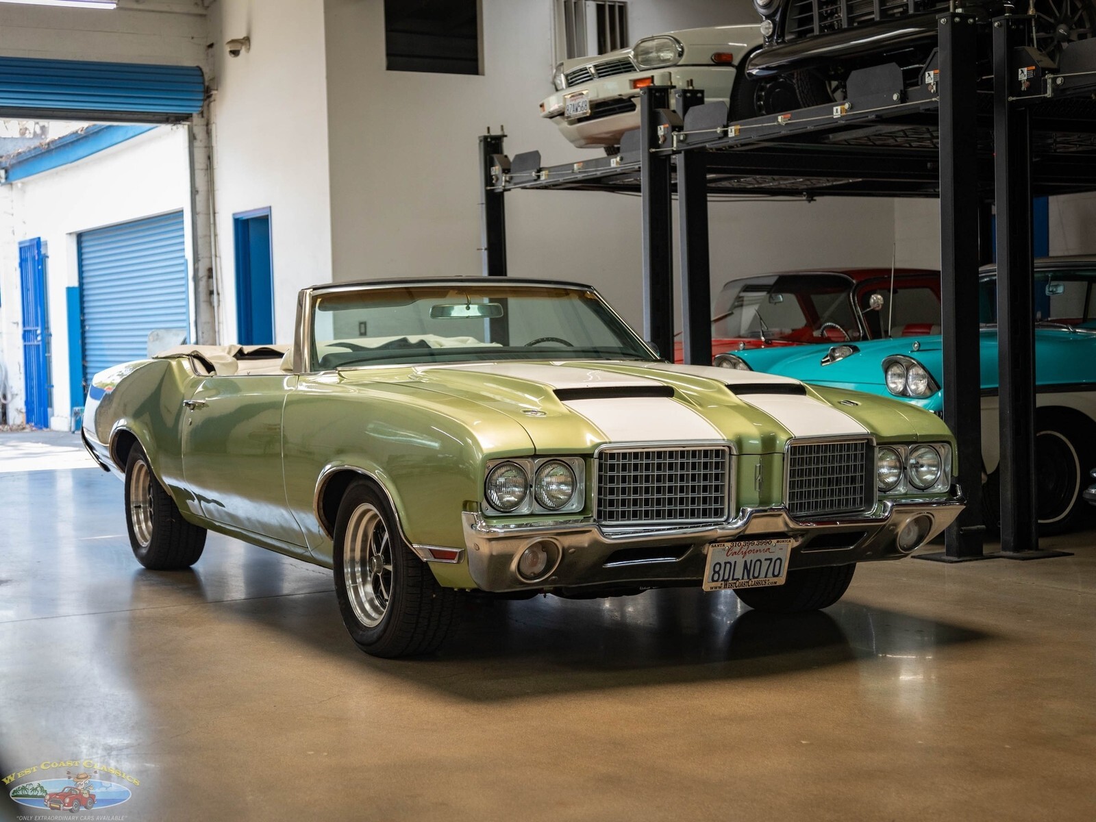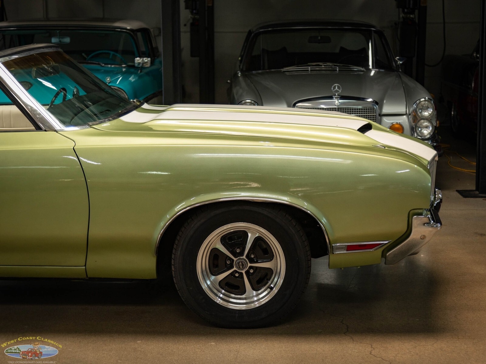 West Coast Classics are proud to present a beautiful example of this 1971 Oldsmobile Cutlass Supreme Convertible with it's original specifications and matching #'s 350 V8 Rocket engine & desirable factory 'Palm Green' (factory color code 42) paint with White Sports stripes and rare rally wheels which were optional. The car has its original factory 'White' (color code A) power soft top and original 'White' bench seat interior (Trim code 987) and significant factory options include: