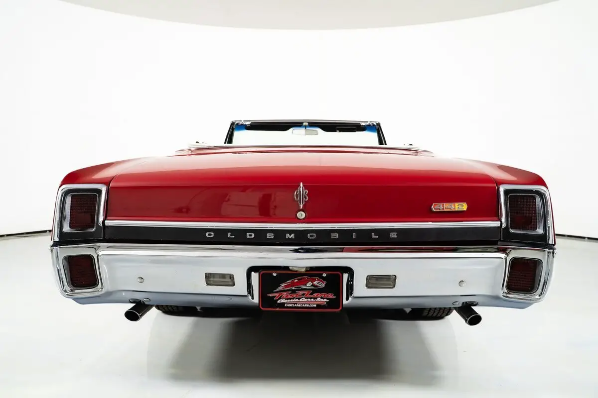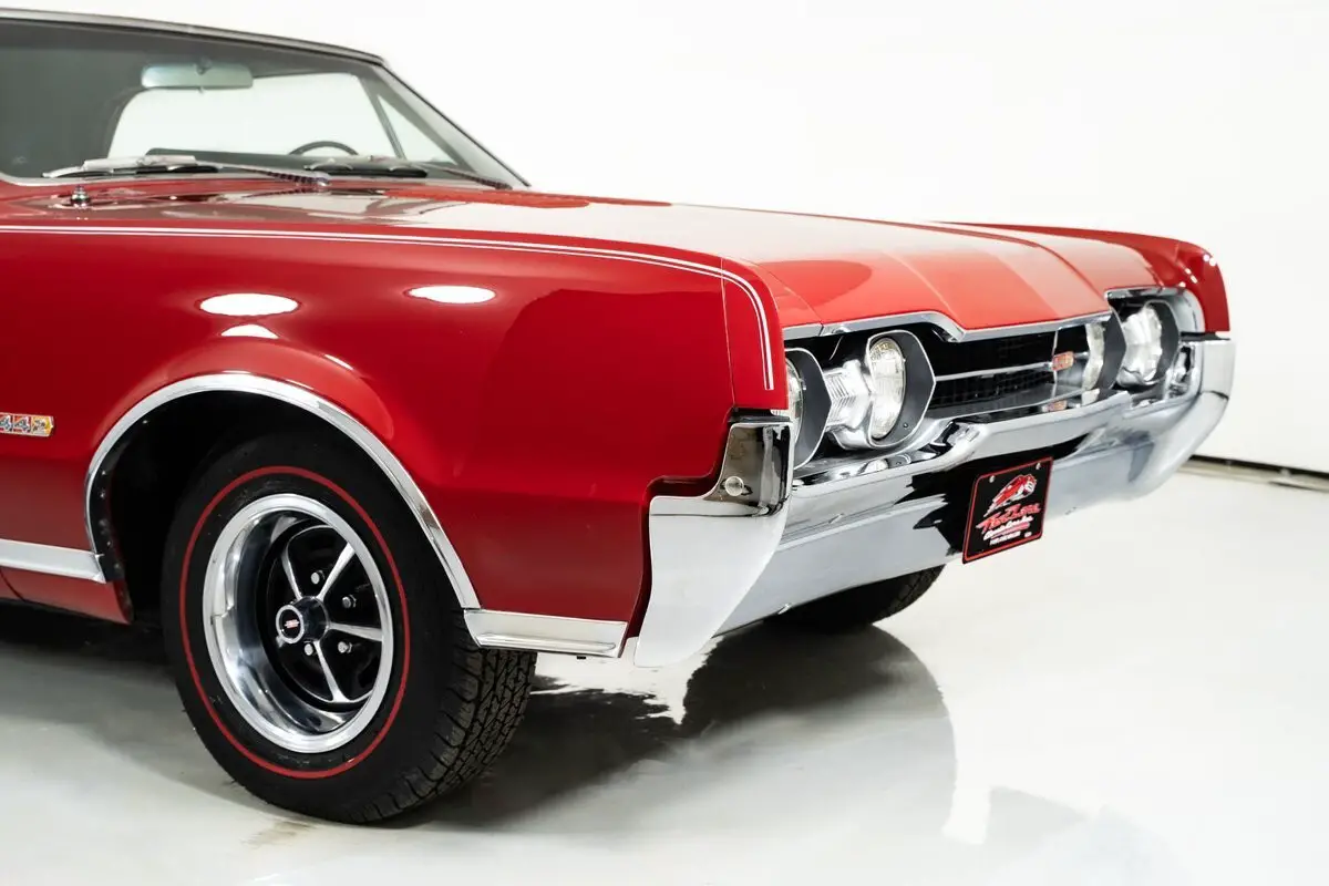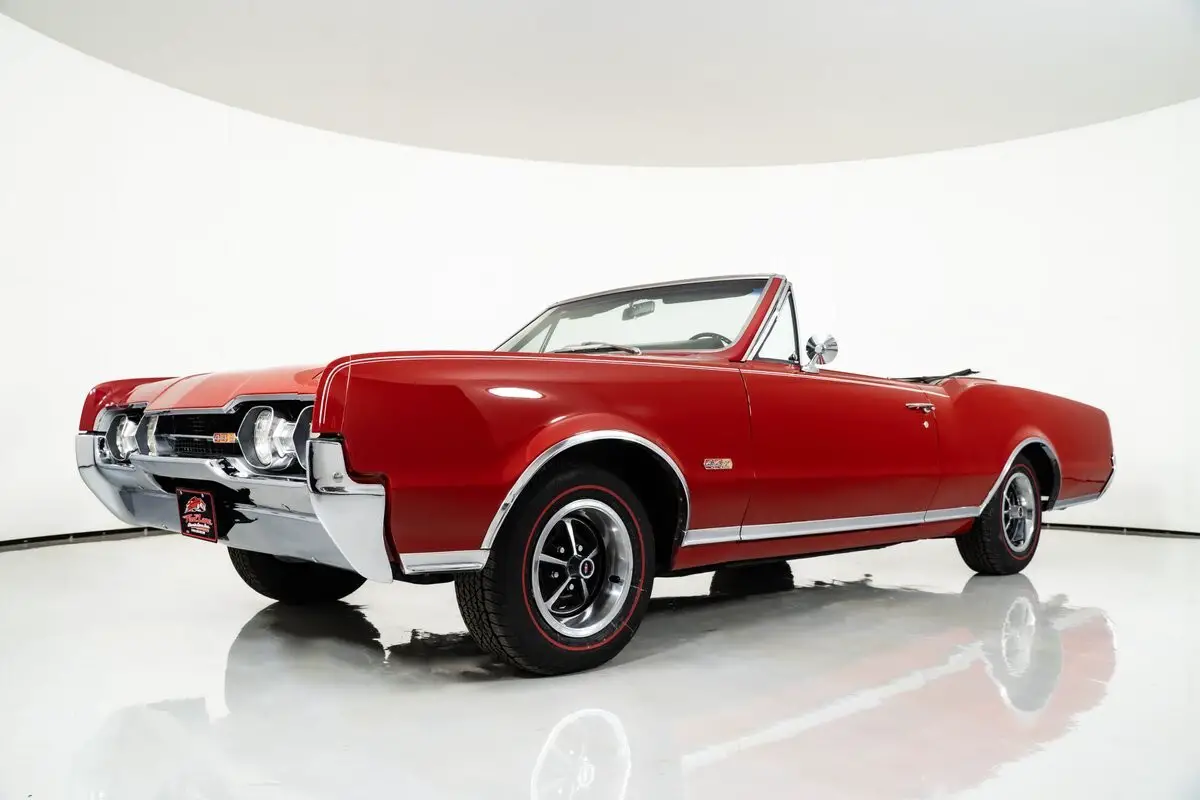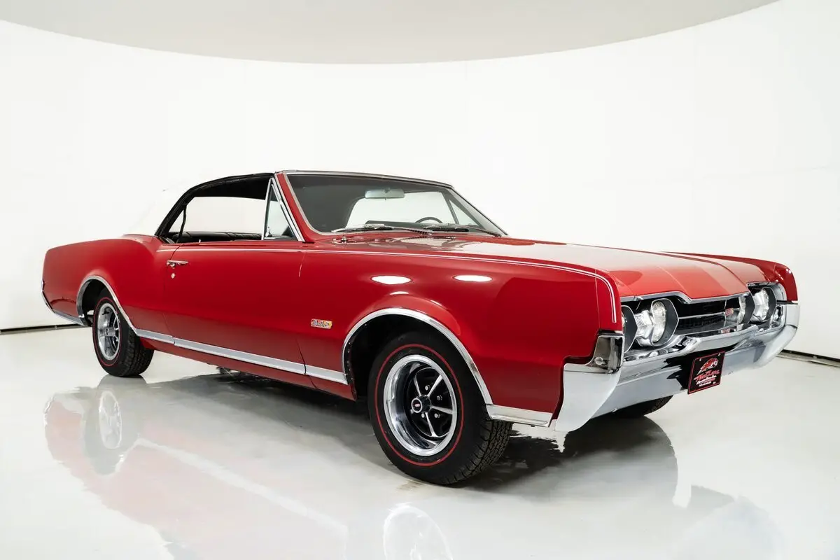 Finished in striking Spanish Red with a white power convertible top, this 442 stands out wherever it goes. The black vinyl bucket seat interior, complete with a center console, provides a comfortable and sporty driving experience. Rolling on 14-inch Rally wheels wrapped in brand-new red line radial tires, this classic Oldsmobile also features power steering and 4-wheel power brakes for easy handling.