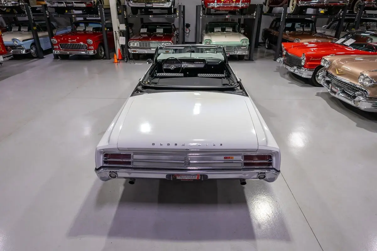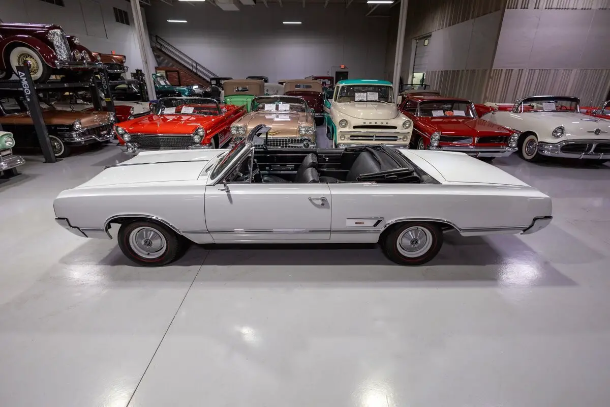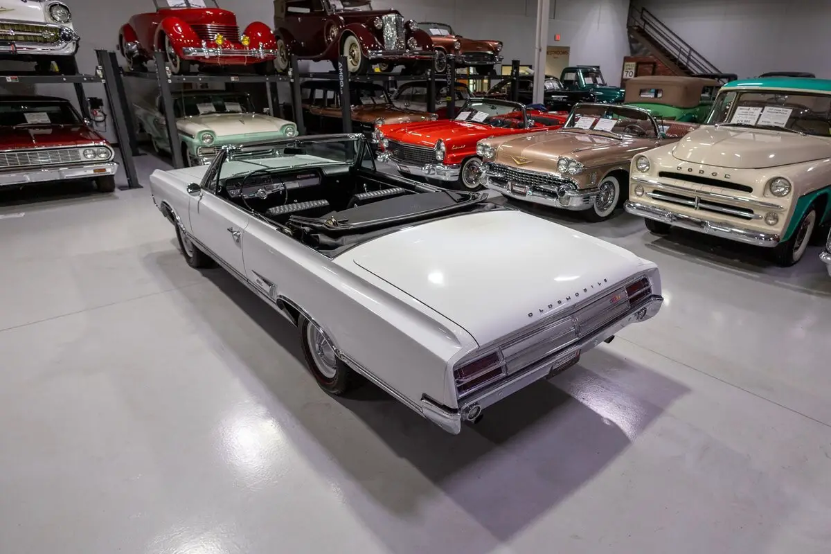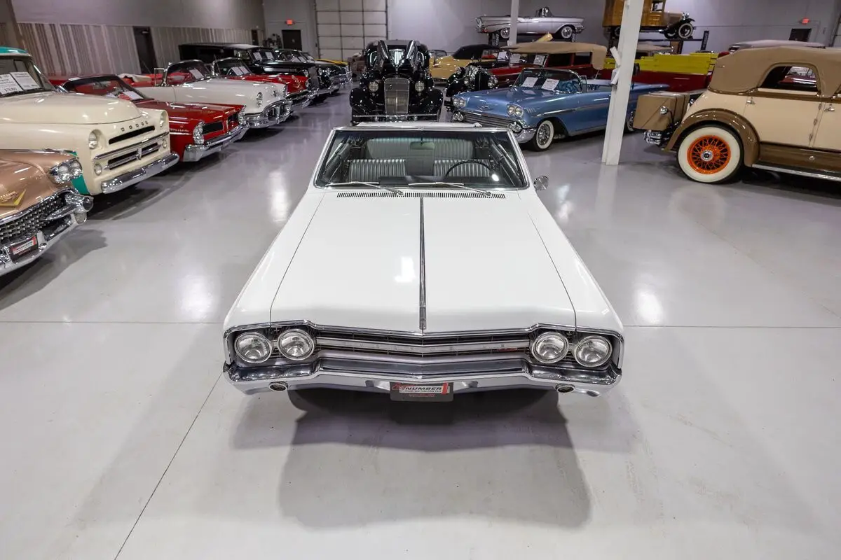 This 1965 Oldsmobile Cutlass 442 Convertible is a wonderfully restored, well-documented Real Deal 4-4-2 convertible! In 1964, Oldsmobile's GM sister brand changed the course of automotive history when Pontiac released its performance-oriented GTO package and kicked off what would become the muscle car era. Of course, muscle car aficionados know that the muscle car was born when Pontiac took mid-size car and placed its large 389 cubic inch V8 into it with the GTO package. In an effort to stay on pace with Pontiac, Oldsmobile repackaged its lesser-known "Police Pursuit" package into its own new performance-oriented package, the "4-4-2" which was released in the middle of 1964 on the F-85/Cutlass midsize platform. In its initial year, 4-4-2 stood for a 4 barrel carburetor, 4 on the floor 4 speed manual transmission, and 2 (dual) exhausts. The 442 package also included a 330 cubic inch V8 along with heavier duty suspension and cooling components. The following year in 1965, Oldsmobile replaced the 330 V8 with a larger 400 cubic inch V8 and made an automatic transmission available in the 442. When Oldsmobile made these changes however, it was also changed what 4-4-2 stood for; so, in 1965, 442 stood for a 400 V8, 4 barrel carburetor, and dual exhaust. Style-wise, the 1965 442 was largely unchanged from the '64 model however Olds did add a pair of faux air scoops on the rear quarters, removed a piece of chrome trim at the beltline, and added a chrome air cleaner atop the new 400 CID V8. By 1965, muscle cars began to gain traction among consumers and Oldsmobile ended up building 25,003 models with the 4-4-2 performance package in '65. This particular example comes to us from a southern-based owner along with the window sticker and protect-o-plate. Powering this '65 Cutlass 442 is a 400 cubic inch V8 engine fed by a single 4 barrel carburetor that together were said to have created a whopping 345 horsepower when new. The 400 V8 is backed by a 4 speed manual transmission that makes this Olds muscle car an absolute blast to drive! Exhaust exits this 442's powerplant via a dual exhaust setup that generates a fantastic throaty sound out of the rear tailpipes. Riding on a set of redline radial tires mounted on white painted steel wheels finished off with chrome wheelcovers, this 1965 Oldsmobile has a great look and even better ride. A driver's side mirror is a welcome addition since it makes squeezing in or out of a tight parking space much easier. The black vinyl power convertible top looks great and it goes up and down with the simple flick of a switch. The exterior of this '65 Cutlass 442 has been correctly refinished in beautiful Provincial White paint completing the exterior look of this muscle car. The interior of this 1965 Oldsmobile Cutlass 442 Convertible is absolutely stunning! The front bucket seats and rear bench seat have been correctly reupholstered in beautiful black vinyl. The matching door panels, black carpeting, black padded dash, and steering wheel are all in great shape and all appear to remain in their stock configuration. The instrument cluster is equipped with a 120 MPH speedometer and fuel gauge, along with indicator lights for the generator, engine temperature, and oil pressure. The dash is finished off with a cigarette lighter, ashtray, and locking glovebox. Whether you're adding to your existing collection of muscle cars or you're buying your very first classic car, this 1965 Oldsmobile Cutlass 442 Convertible would make a wonderful choice. Give Ellingson's a call today at 763-428-7337!