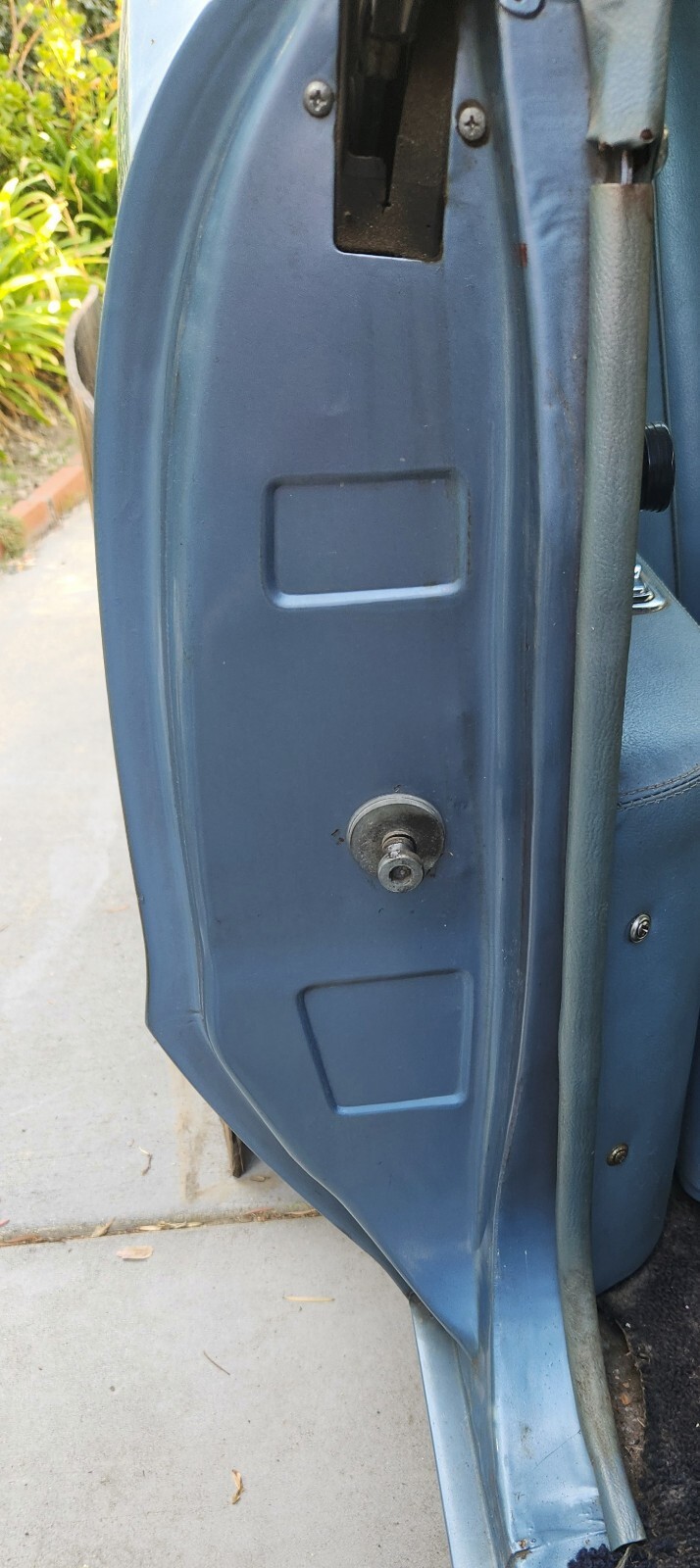The driver’s side front seat was amateurishly reupholstered about 1995 and now looks not-so-great. The rear seats look terrific, and so do the door panels. Included with the purchase of the car are brand new Legendary Auto front seats in the correct shade of blue, and brand new, correct 80/20 carpeting, front and back. We removed the carpet sill moldings to show how insanely rust free the floors are.