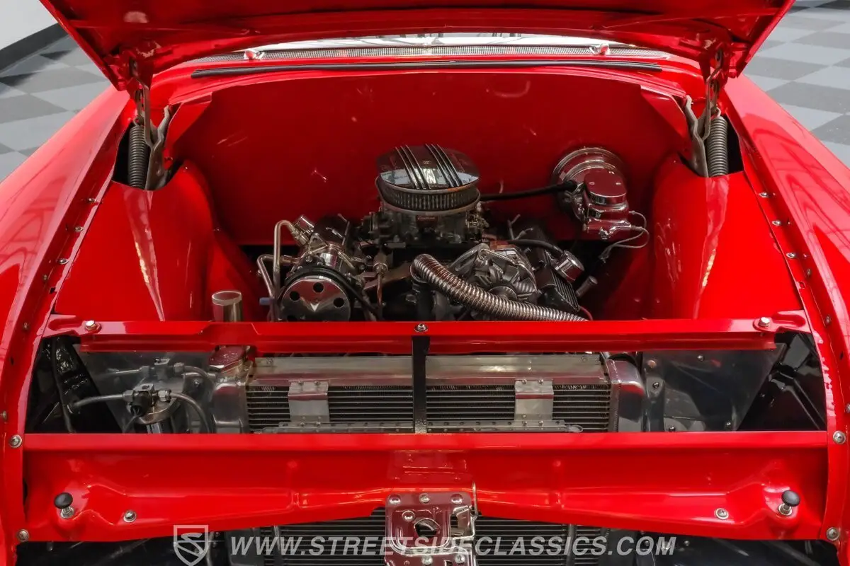 Inside, the cabin is a sanctuary of style and comfort. Fully customized with black leather bucket seats featuring red accent stitching, the interior boasts matching door panels and a red-painted dash that complements the exterior's bold palette. The custom center console houses aftermarket gauges, a Sony AM/FM CD player with USB aux input, and controls for the air ride suspension and Vintage Air A/C system. The black headliner and carpeting add a refined touch, while power windows, seat belts, and tilt steering with a leather-wrapped wheel enhance daily usability and driving pleasure.