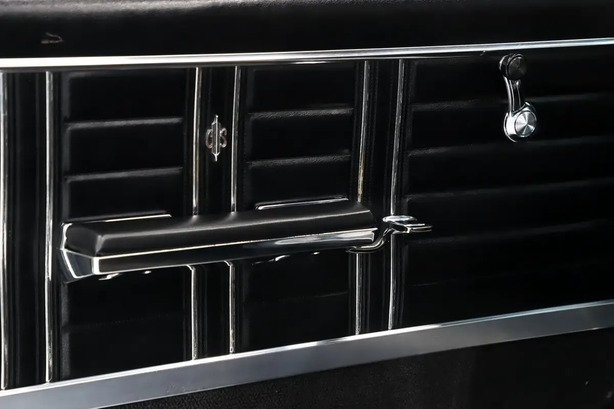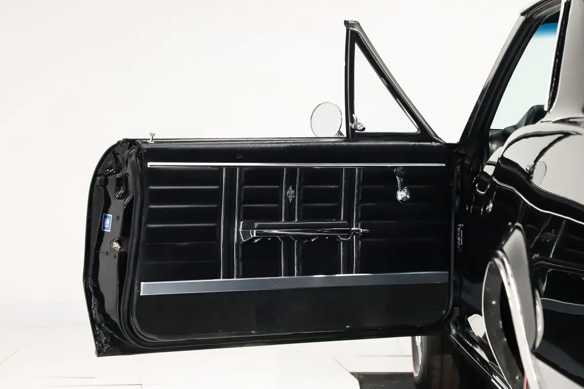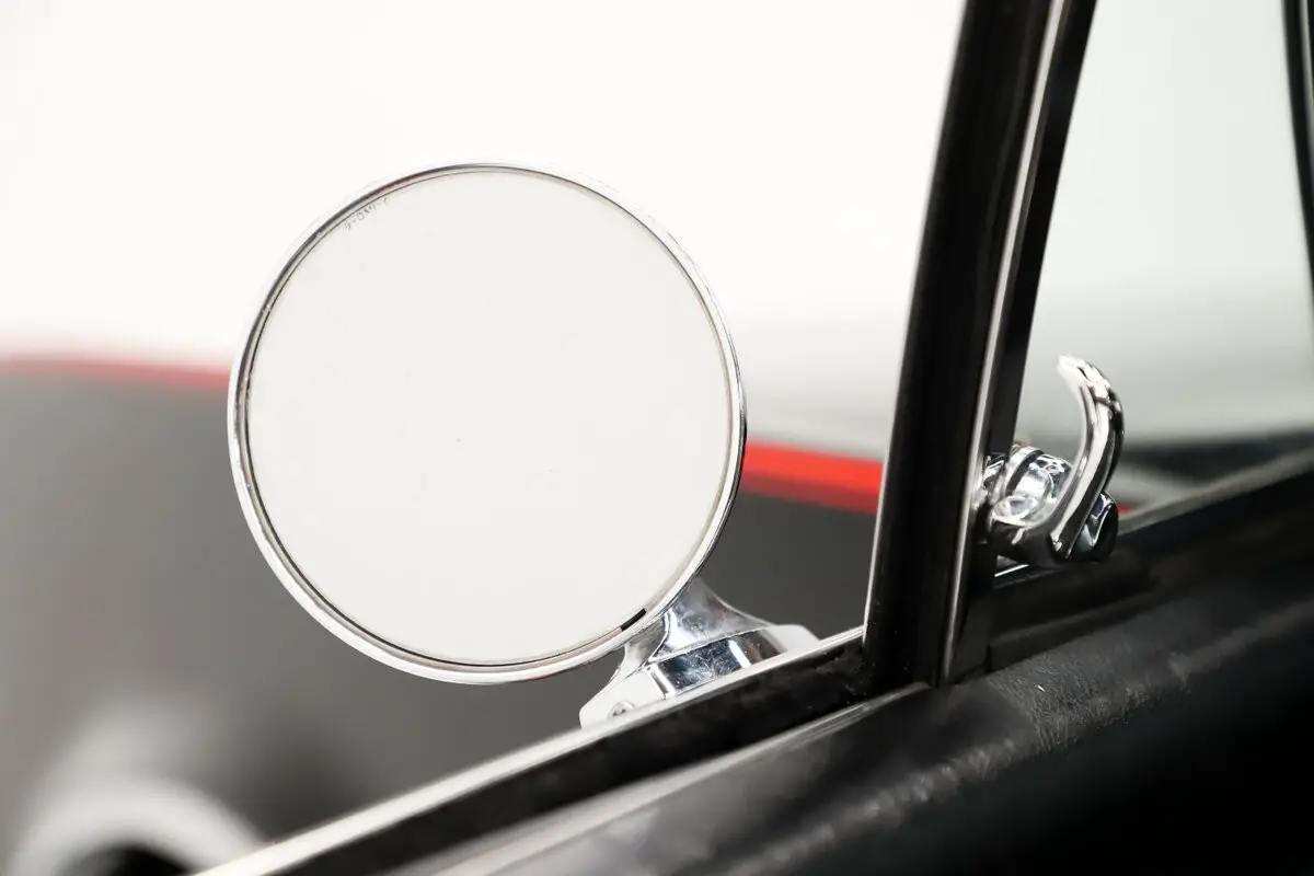 EXTERIOR: Striking combination of slick black paint with no vinyl top, red pinstripe, redline tires and the chrome SS-1 wheels! Looking down the sides of the car they're both laser straight. The body panel gaps are flush and square. No signs of any bubbling, cracking or issues. I am also noticing on how well the bumpers fit the body, where they line up against the quarter panels and fenders is about as good as they get. In back the bumper, tail panel, emblems