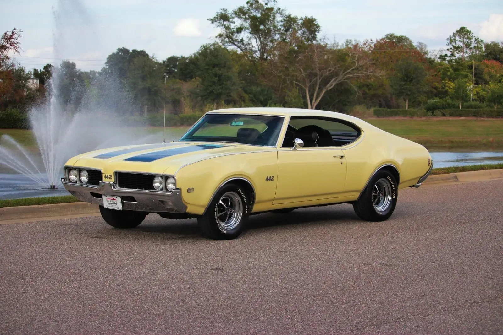 1969 Oldsmobile 442, Factory 4-Speed, Real 442, Believed to be Matching Numbers 400 V8 (350 HP), Fully Restored, Original Sheet Metal, Museum Display Car This 1969 Oldsmobile 442 is an authentic, real-deal 442 that delivers the full combination of pedigree, performance, and presentation enthusiast's demand. a believed-to-be matching numbers 400 cubic inch V8 rated at 350 horsepower and equipped from the factory with the highly desirable 4-speed manual transmission and console, this example represents Oldsmobile muscle at its peak. Restored from top to bottom approximately seven years ago and driven only about 3,000 miles since completion, the car remains exceptionally well-sorted and visually impressive. Equally important, it retains its original sheet metal, floors, and trunk pan, highlighting the solid foundation and careful approach taken during the restoration. Finished in striking Saffron Yellow over a