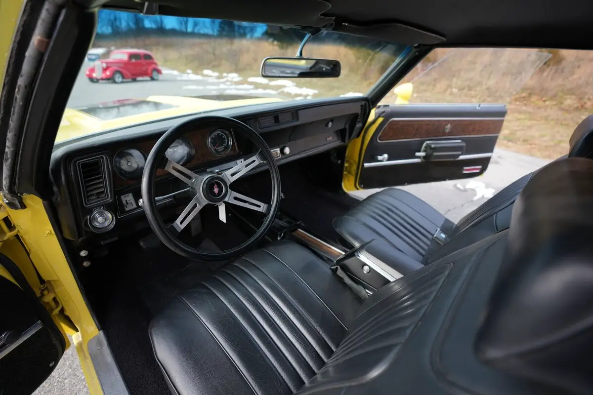 The body is finished in bright yellow with excellent shine and clean panel lines. The air-induction hood and pin locks add period-correct muscle flair, while the rear spoiler and trumpet-style dual exhaust complete the 442-tribute aesthetic. The yellow-coded steel wheels with trim rings and caps tie the look together, delivering a standout stance on the road or at shows.
