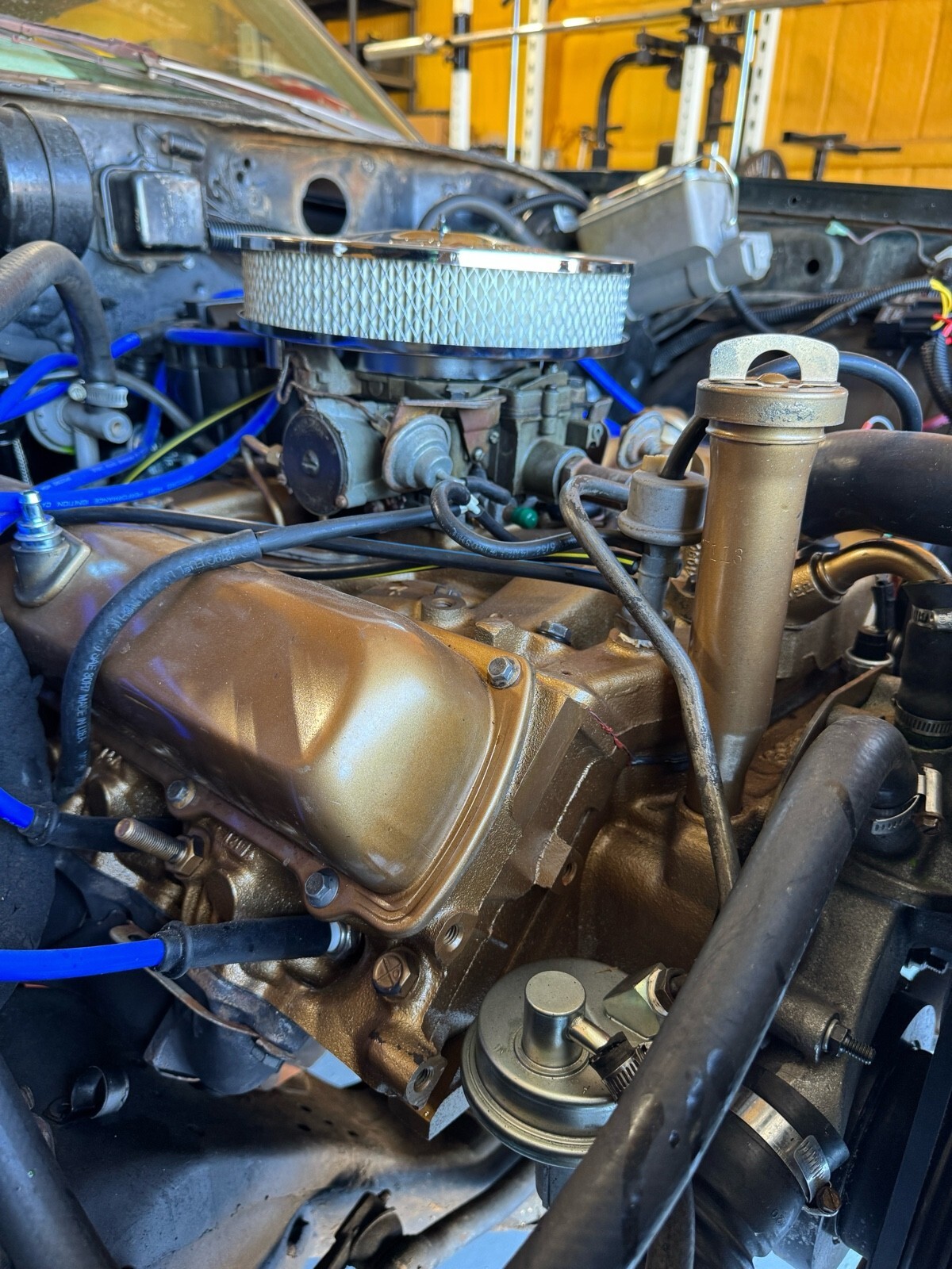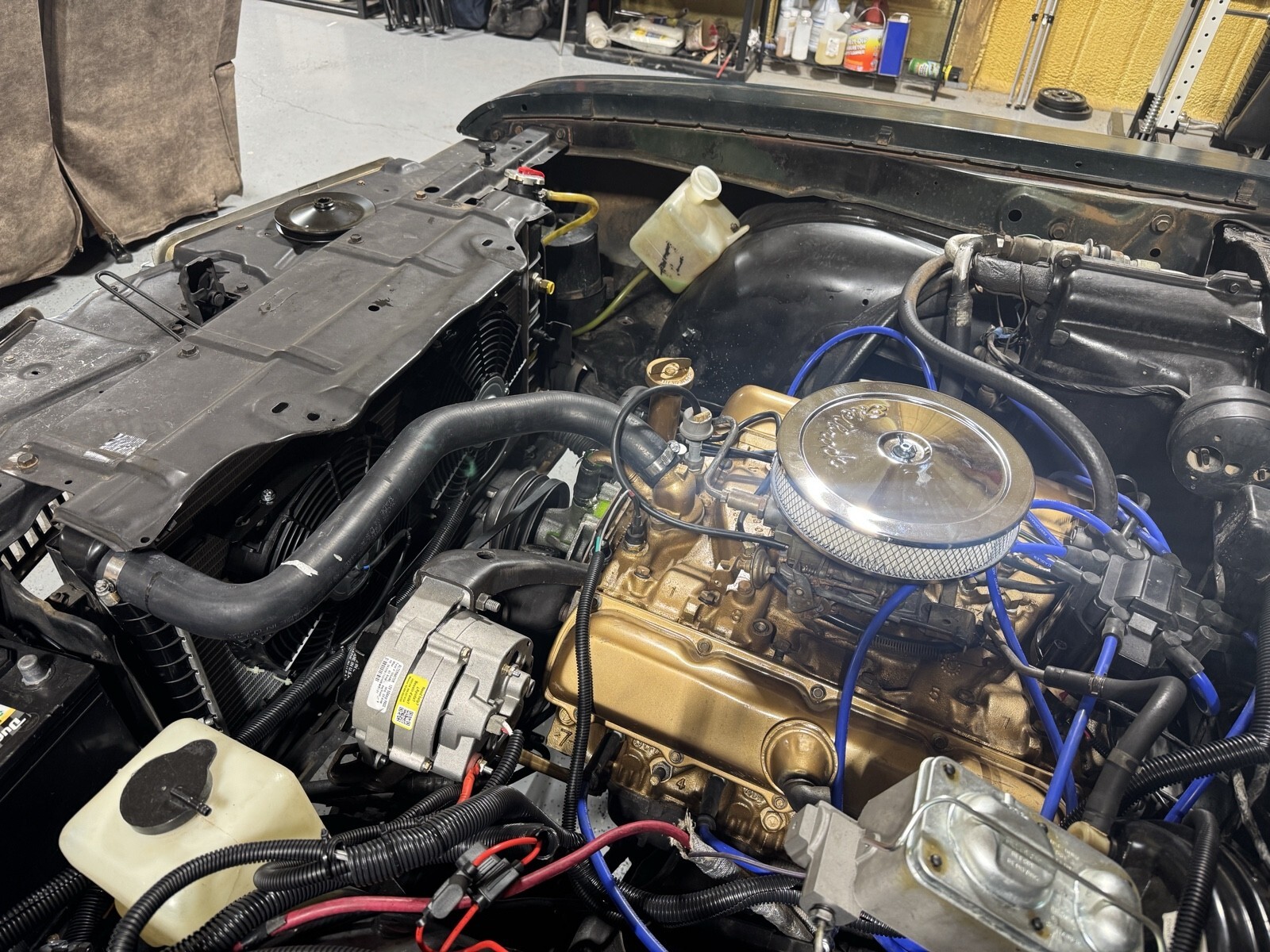 New engine and transmission. Engine professionally rebuilt.01 over on the cylinders. New cam and crank. Heads decked. Th350 transmission professionally rebuilt. New stall converter. Engine has new fuel pump,water pump,plugs,electric fan,radiator,and more. The interior is original except for carpet. Starts right up and I drive it around on the weekends. Tires look great and almost new. Remove this is a project car. I haven’t gotten to reattach the gauges or horn. I haven’t worked on the A/C but does come with all the brackets and hoses necessary. Just light surface rust underneath. New brake shoes for the back. New gas tank. The carb was rebuilt (rochester 4bb)but im thinking of getting a new one. It does have a hood. I just keep it off while I work on it. Honestly the only thing not restored is cosmetic suff. The body is in great shape. The interior is really nice. Bench seat brings back memories of whi was young. I have fun out of time and have to let it go.