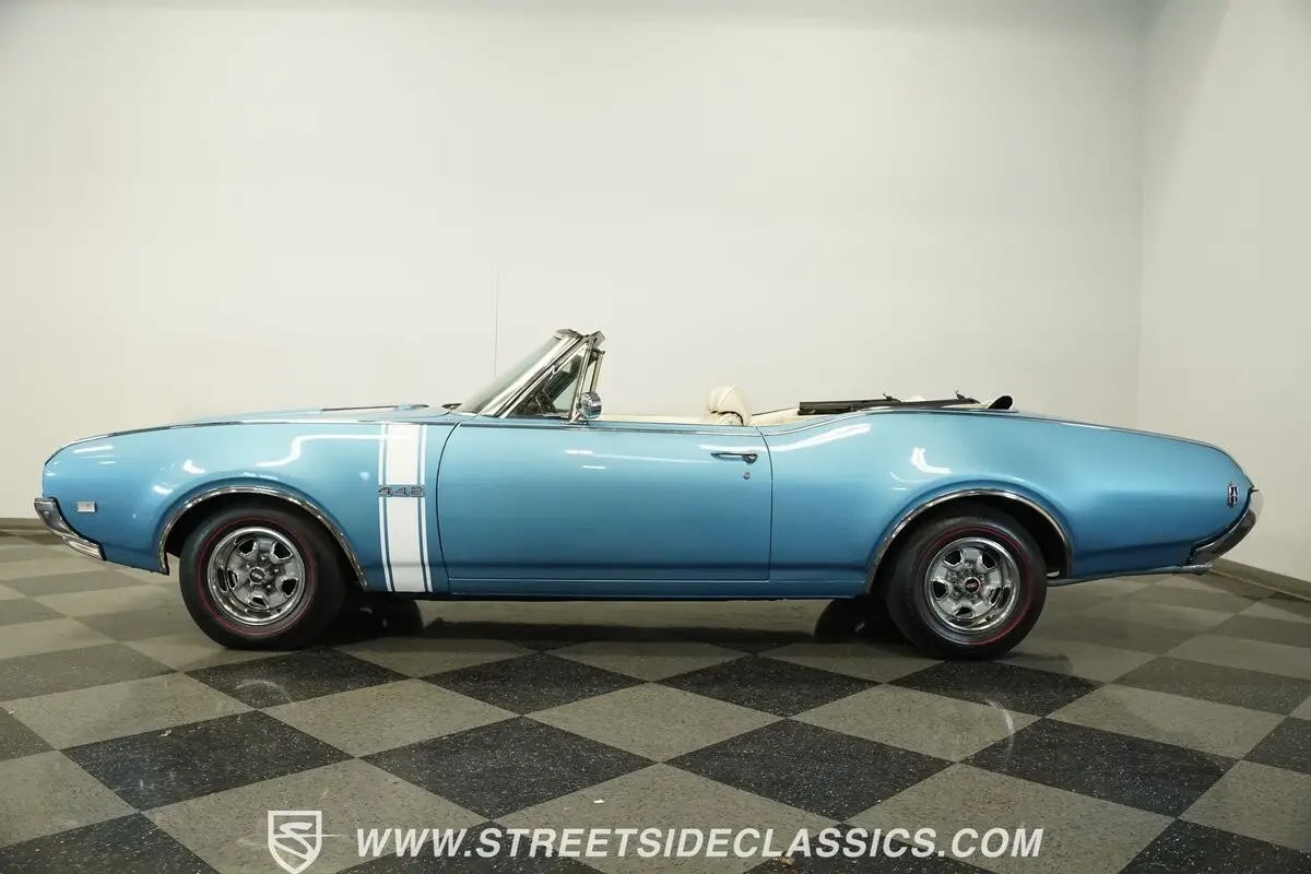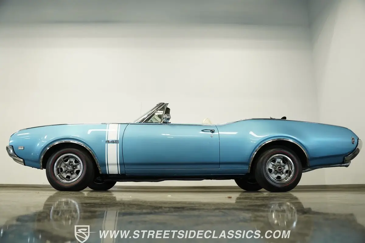 The 1968 Oldsmobile 442 Convertible is equipped with a suspension system featuring an independent front end and a live axle rear, complemented by coil springs and heavy-duty shocks at all four corners. Power brakes highlighted by a set of front discs stand ready to scrub off speed at a moment's notice. With its original engine and transmission intact, this beautiful baby blue boulevard bruiser has plenty of life left for its new owner to enjoy. But don't wait, call today!