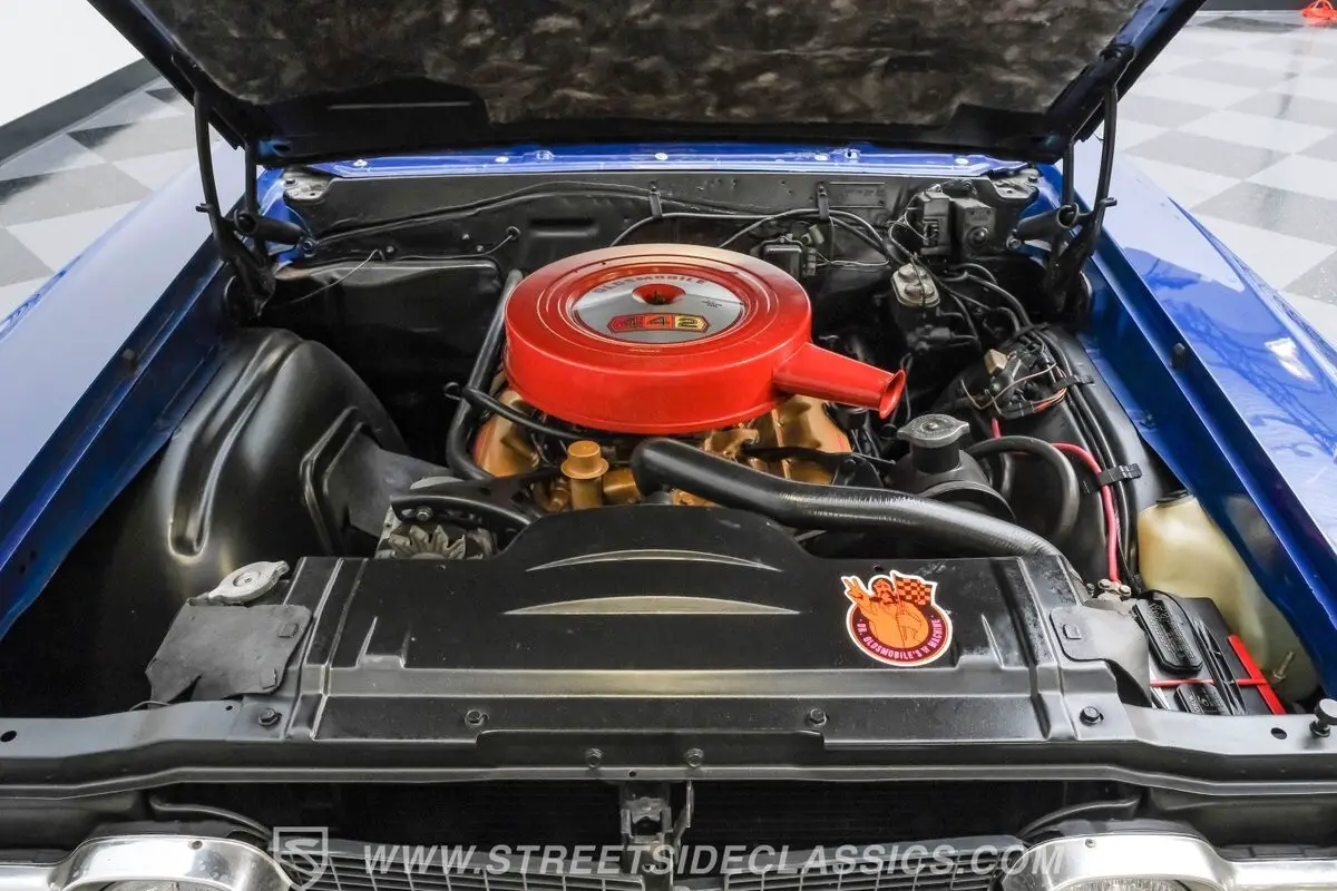 Under the hood, this Cutlass houses a period-correct 330 cubic inch V8 engine equipped with an Edelbrock 4-barrel carburetor. The engine bay is clean, organized, and proudly displays the 442 numbers on the air cleaner. Power is delivered through a smooth-shifting two-speed automatic transmission with a column shifter. The drivetrain offers strong acceleration and a nice cruising experience, enhanced by power steering for easy handling.