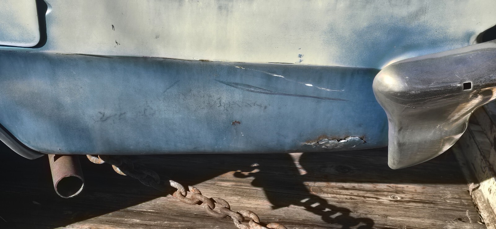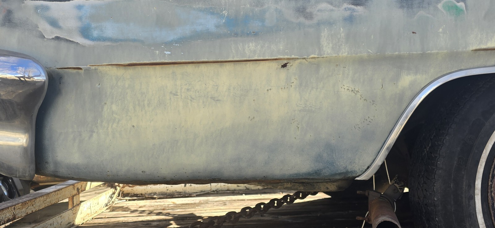 The car was repainted a light metallic blue at some point, with other sanding/primering on the hood. All glass is in great condition except the windshield, which is cracked.