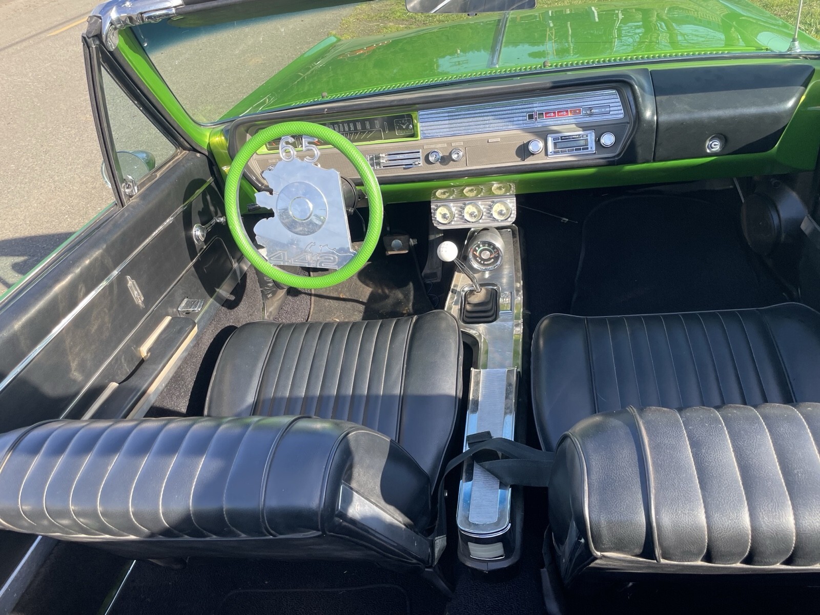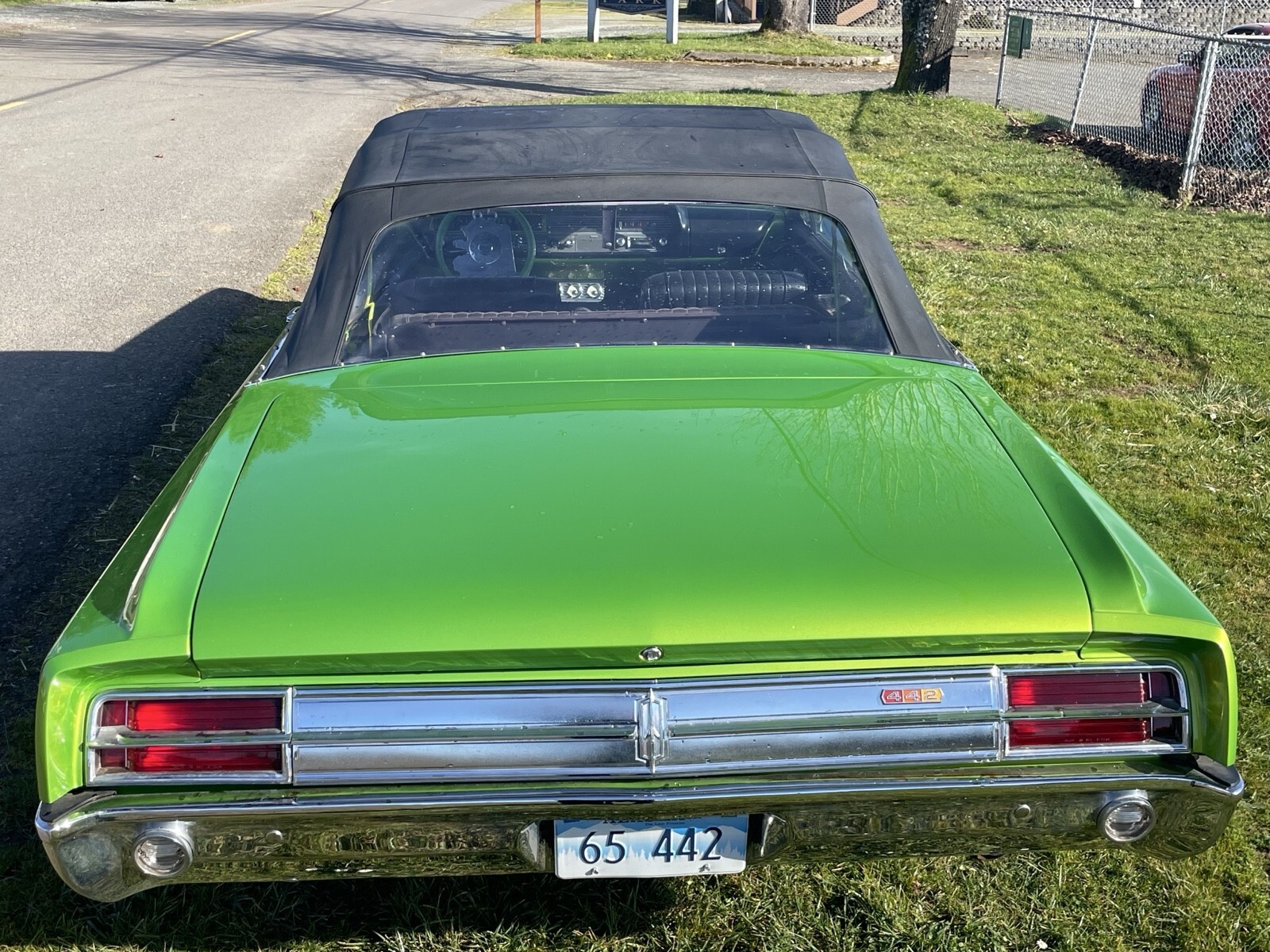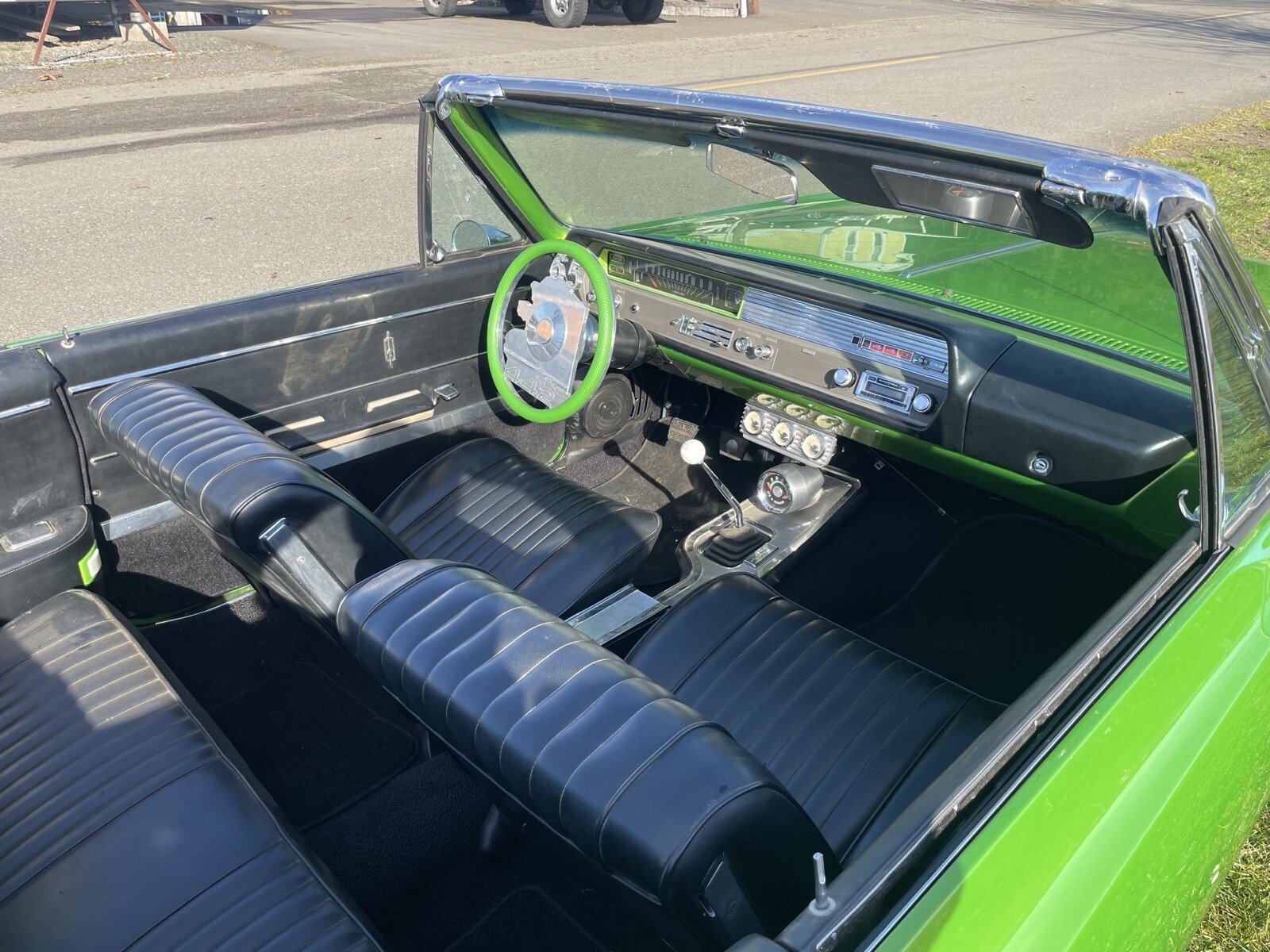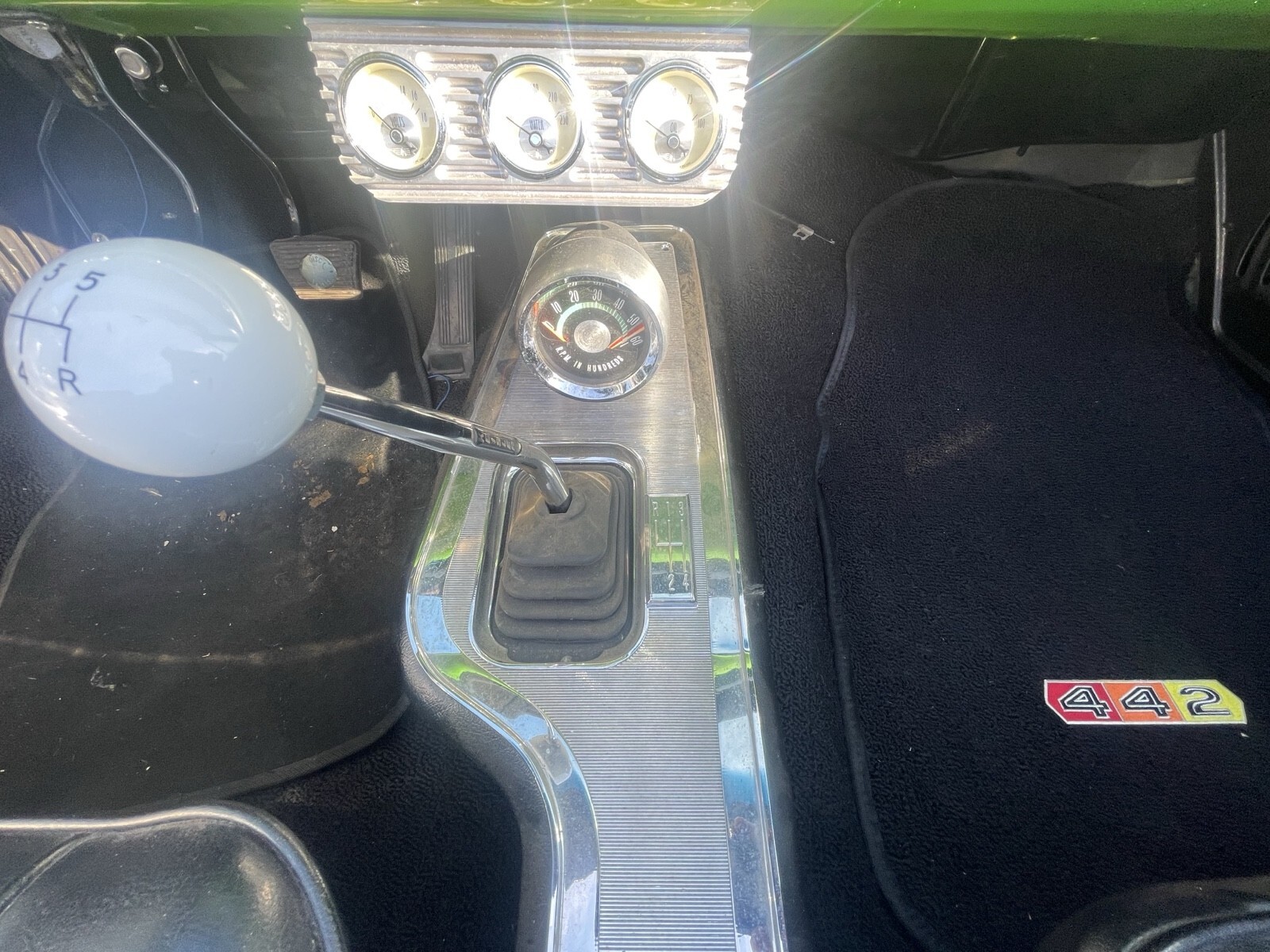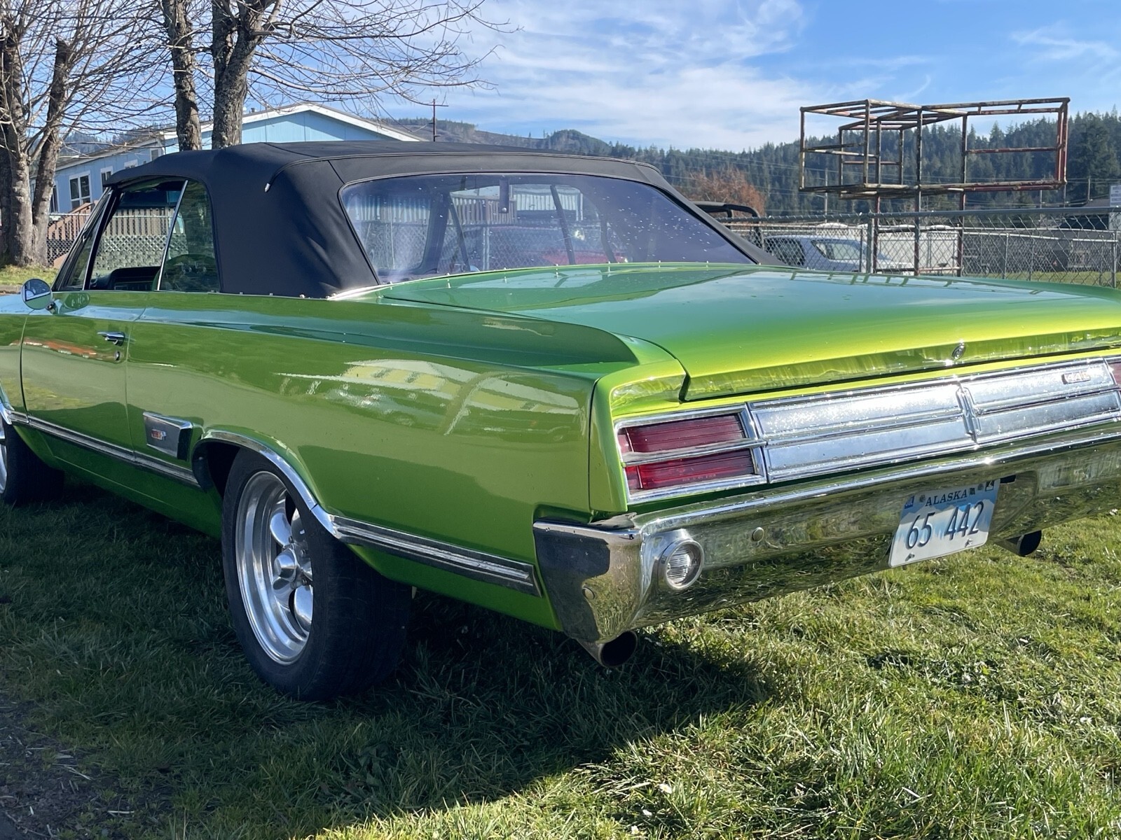 In 1964, Oldsmobile's GM sister brand changed the course of automotive history when Pontiac released its performance-oriented GTO package and kicked off what would become the muscle car era. Of course, muscle car aficionados know that the muscle car was born when Pontiac took mid-size car and placed its large 389 cubic inch V8 into it with the GTO package. In an effort to stay on pace with Pontiac, Oldsmobile repackaged its lesser-known "Police Pursuit" package into its own new performance-oriented package, the "4-4-2" which was released in the middle of 1964 on the F-85/Cutlass midsize platform. In its initial year, 4-4-2 stood for a 4 barrel carburetor, 4 on the floor 4 speed manual transmission, and 2 (dual) exhausts. The 442 package also included a 330 cubic inch V8 along with heavier duty suspension and cooling components. The following year in 1965, Oldsmobile replaced the 330 V8 with a larger 400 cubic inch V8 and made an automatic transmission available in the 442. When Oldsmobile made these changes however, it was also changed what 4-4-2 stood for; so, in 1965, 442 stood for a 400 V8, 4 barrel carburetor, and dual exhaust. Style-wise, the 1965 442 was largely unchanged from the '64 model however Olds did add a pair of faux air scoops on the rear quarters, removed a piece of chrome trim at the beltline, and added a chrome air cleaner atop the new 400 CID V8. By 1965, muscle cars began to gain traction among consumers and Oldsmobile ended up building 25,003 models with the 4-4-2 performance package in '65. This particular example comes to us from a west coast based owner. Powering this '65 Cutlass 442 is a 455 cubic professional redone inch V8 engine fed by a MSD fuel injection. The 455 V8 is backed by a 5 speed manual overdrive transmission that makes this Olds muscle car an absolute blast to drive! Exhaust exits this 442's powerplant via a dual exhaust setup that generates a fantastic throaty sound out of the rear tailpipes. This 1965 Oldsmobile has a great look and even better ride. A driver's side mirror is a welcome addition since it makes squeezing in or out of a tight parking space much easier. The black vinyl power convertible top looks great and it goes up and down with the simple flick of a switch. The exterior of this '65 Cutlass 442 has been refinished in beautiful Viper green paint completing the exterior look of this muscle car. The interior of this 1965 Oldsmobile Cutlass 442 Convertible is absolutely stunning! The front bucket seats and rear bench seat have been correctly reupholstered in beautiful black vinyl. The matching door panels, black carpeting, black padded dash, and steering wheel are all in great shape and all appear to remain in their stock configuration. The instrument cluster is equipped with a 120 MPH speedometer and fuel gauge, along with indicator lights for the generator, engine temperature, and oil pressure. The dash is finished off with a cigarette lighter, ashtray, and locking glovebox.