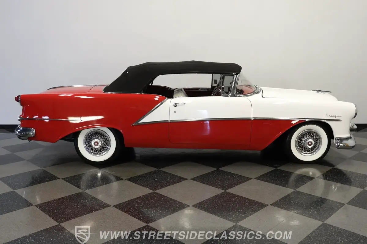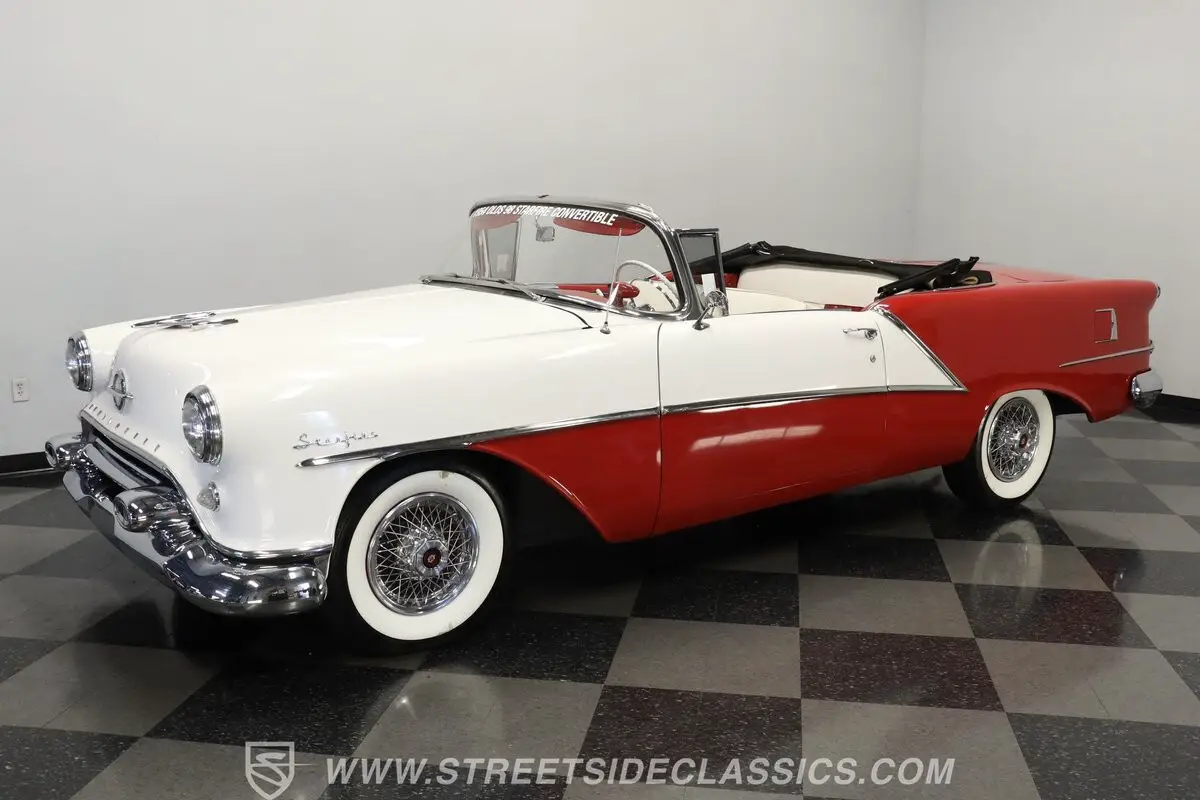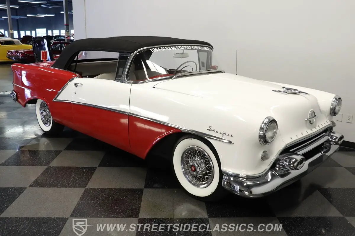 Marking the debut year for the Starfire nameplate, this 1954 Oldsmobile Starfire Convertible represents the top-tier, highest-priced, and lowest-volume Oldsmobile produced that year. The striking two-tone Red and White exterior creates a bold visual contrast that defines this classic American convertible. A black power-operated convertible top with rear plastic window adds versatility to the open-air driving experience. Front and rear chrome bumpers along with elegant trim work appear in good condition, complementing the car's flowing lines. The 15-inch wheels with chrome spoke hub caps and 235/75R15 whitewall radial tires complete this Starfire's road presence.