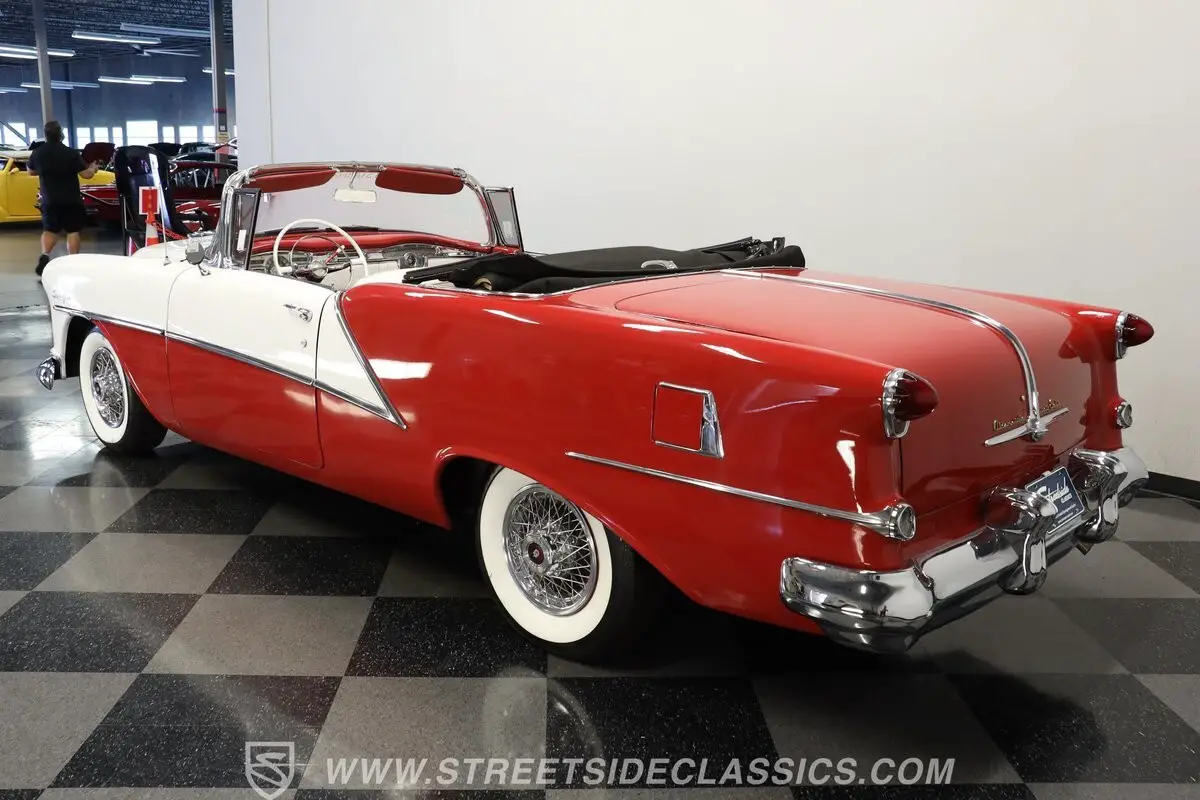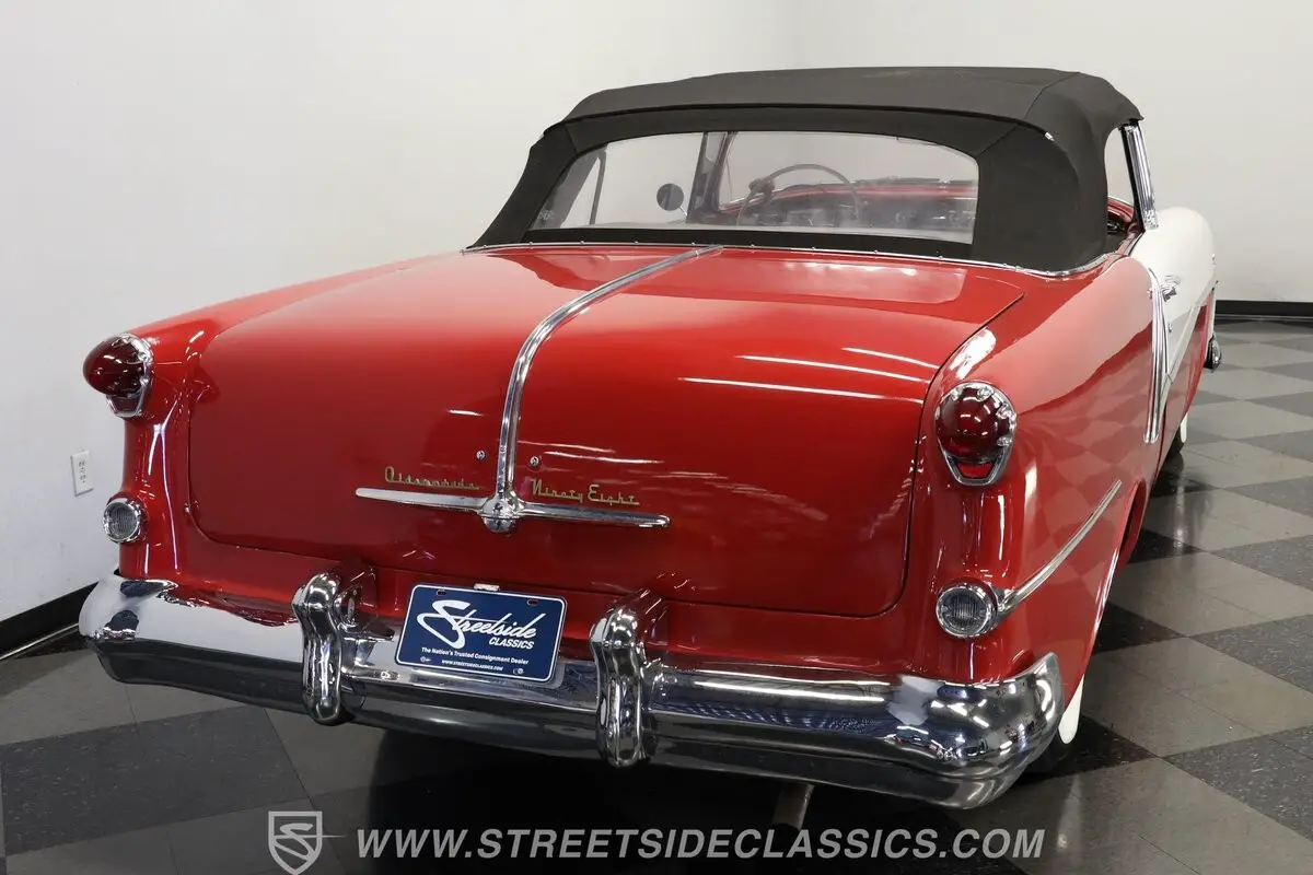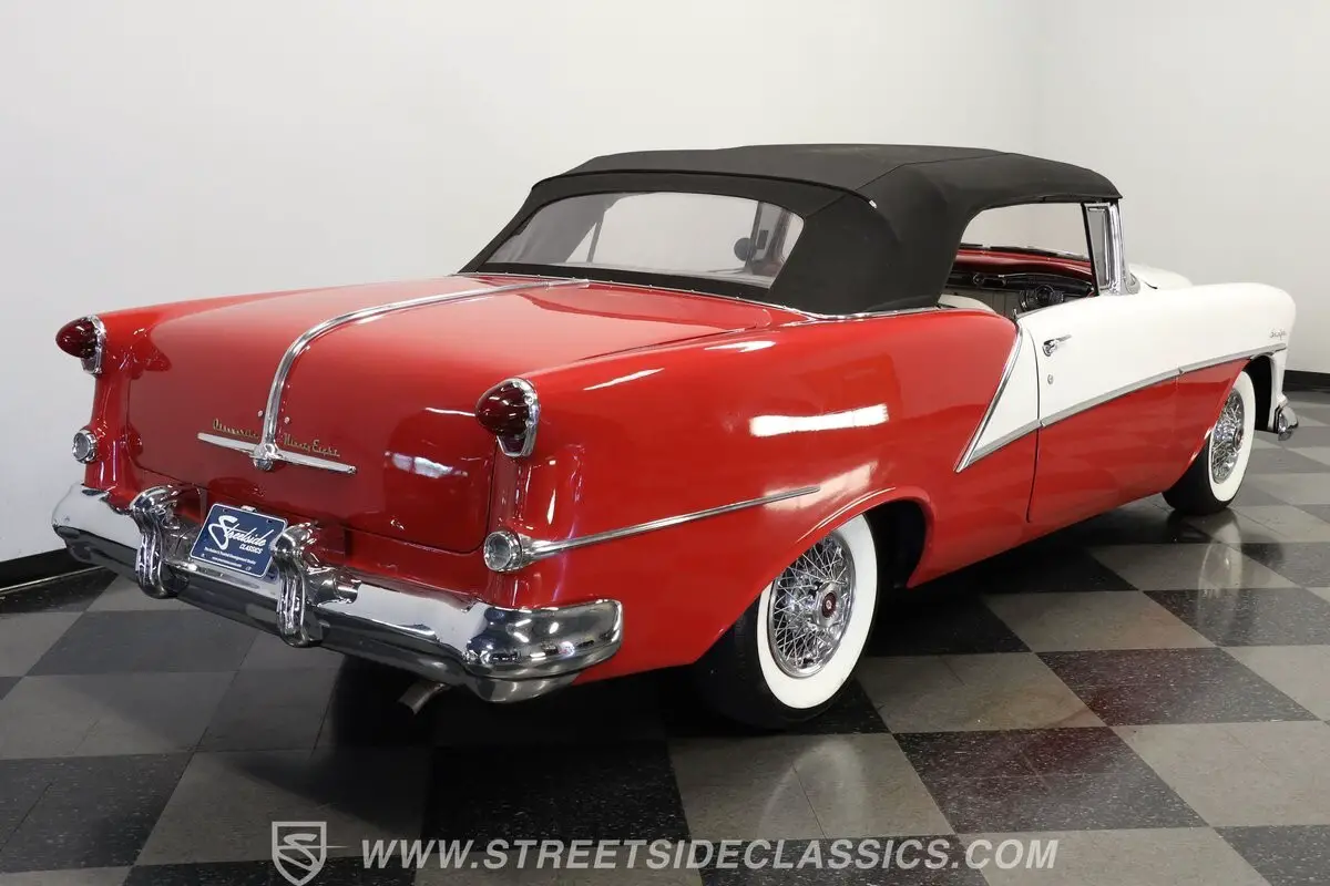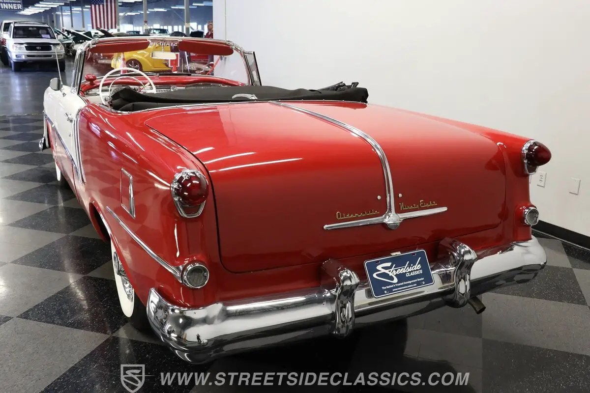 Marking the debut year for the Starfire nameplate, this 1954 Oldsmobile Starfire Convertible represents the top-tier, highest-priced, and lowest-volume Oldsmobile produced that year. The striking two-tone Red and White exterior creates a bold visual contrast that defines this classic American convertible. A black power-operated convertible top with rear plastic window adds versatility to the open-air driving experience. Front and rear chrome bumpers along with elegant trim work appear in good condition, complementing the car's flowing lines. The 15-inch wheels with chrome spoke hub caps and 235/75R15 whitewall radial tires complete this Starfire's road presence.