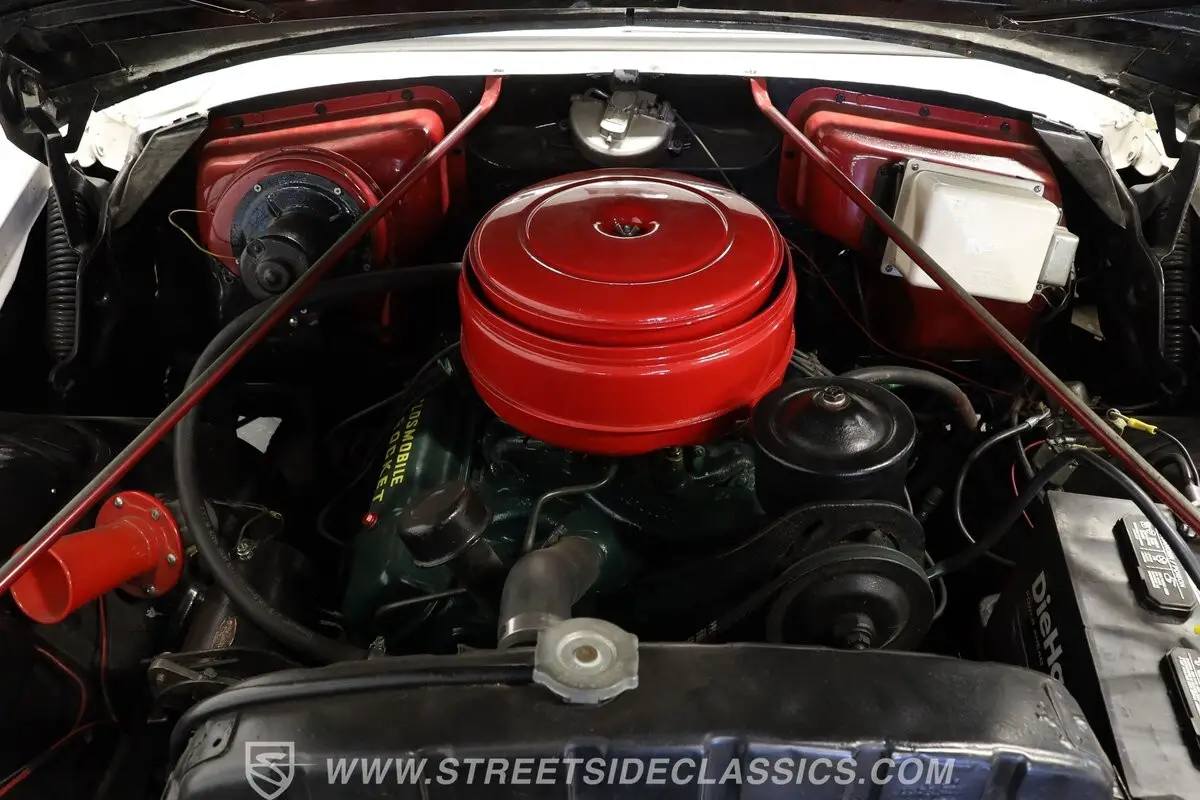 Mechanical specifications showcase Oldsmobile's engineering prowess with the 324 Rocket V8 engine. This powerplant breathes through a 4-barrel carburetor with oil bath breather, while a vacuum advance distributor manages ignition timing. The 4-speed Hydramatic automatic transmission handles power delivery to the rear wheels. Driving ease comes courtesy of power steering, while standard drum brakes provide stopping power. The cooling system features a standard radiator with belt-driven fan. The period-correct engine bay maintains this Starfire's authentic appearance.