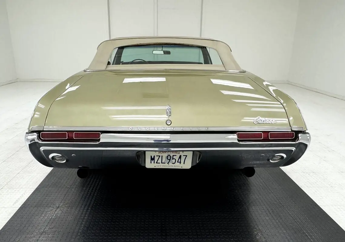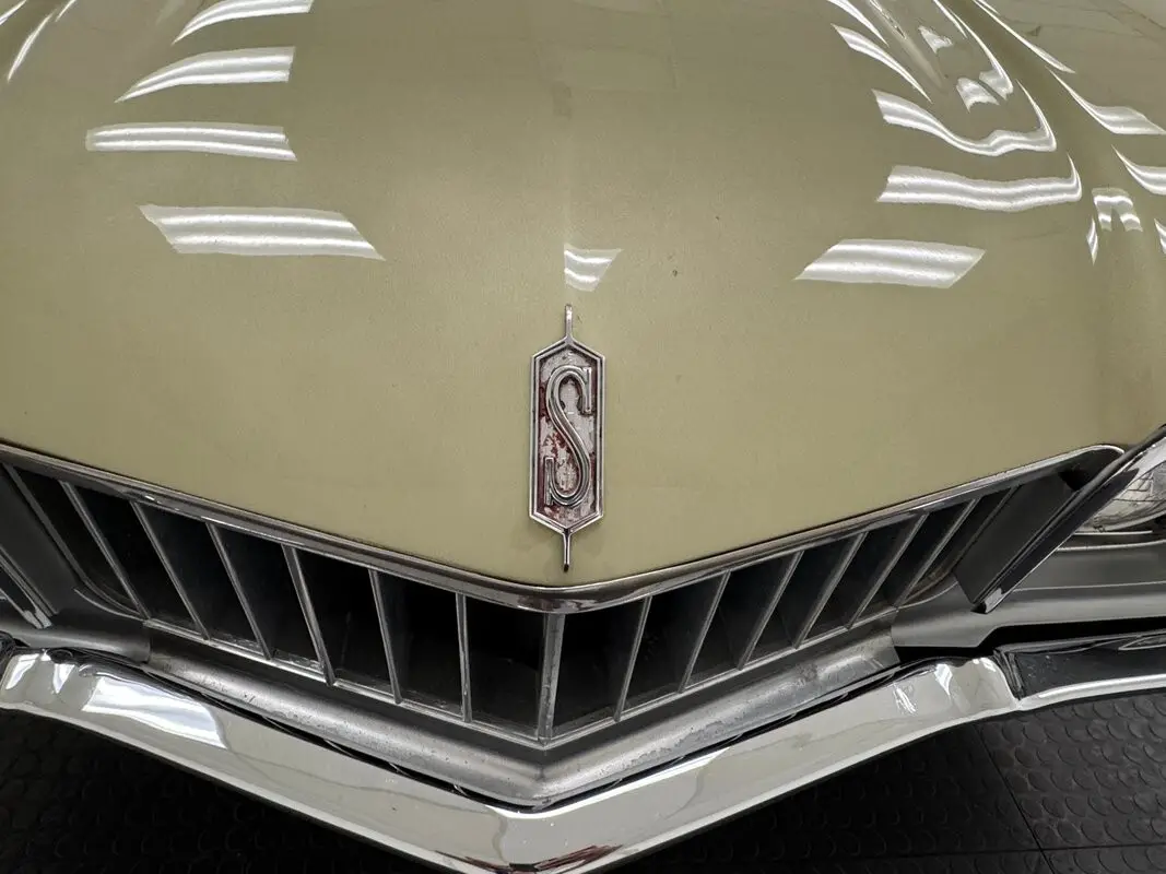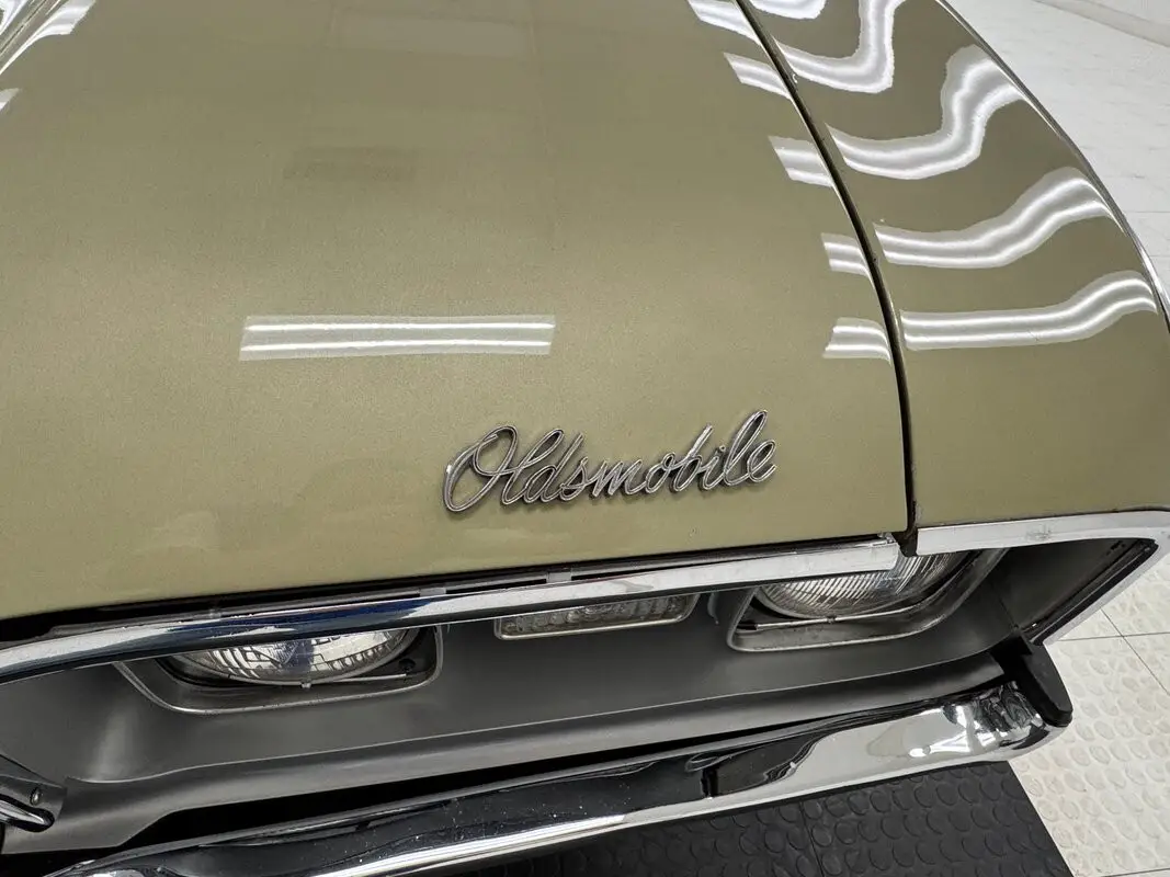 Wearing its original color in now two stage application, the Willow Gold is a welcome change of direction from your typical palette of colors and as result, stands out. The grille and headlight configuration are a one year only design adding even more uniqueness to this beautiful A-body. Chrome bumpers shine bright with the rear panel taking in the narrow horizontal tail lights at the base of a broad decklid over dual exhaust. A beige canvas room adds a subtle contrast to the greenish gold paint, and 14-inch Oldsmobile Super Stock II also wears a lighter shade while trim rings and wheel opening molding dress things up. At a distance, this is a show ready car. Closer examination reveals some imperfections included areas of chipped paint, a rust hole on the hood, a rock chip in the windshield, some adhesive that's failed on the rear window, various chips, scratches, bubbling, emblem fading, rough surfaces under paint, and a dent on the front fender near the bumper.