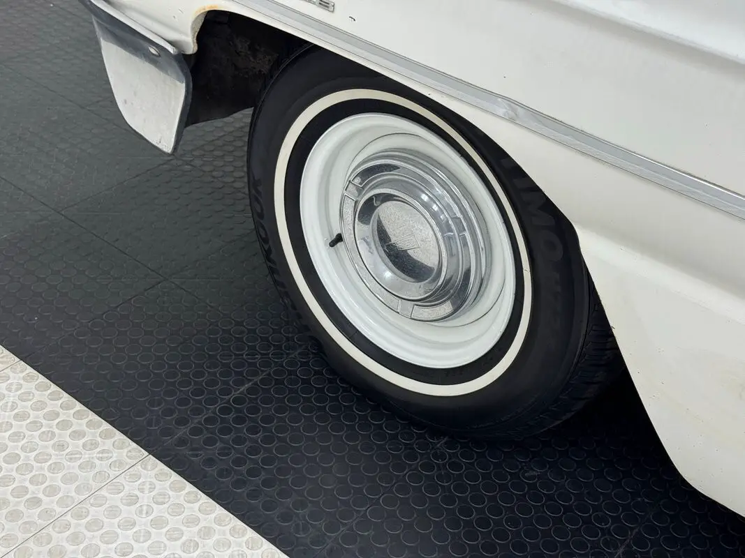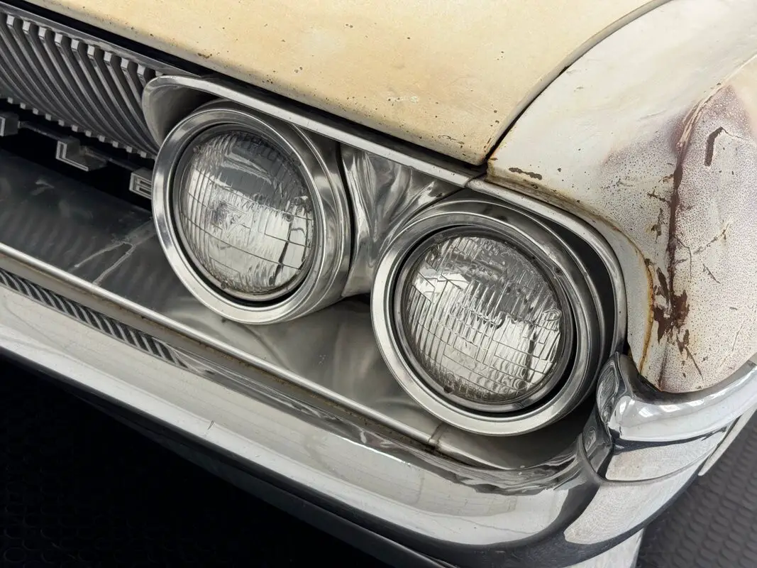 More work needed here as the green interior will need some restoration. That said, the door panels dressed in three shades of green in varying insert designs are actually in decent condition and inspiration for bringing the car up to par. The driver's side of the vinyl and cloth split bench is torn badly and is compressed deeply, while the passenger side is stained but not torn. The back bench also has its share of stains and a rip or two and the carpet is worn through in back and to a lesser extent in front. A green steering wheel with attractive slim central spoke shows some cracks and frames a fantastic dashboard that blends the ornate 50's with the linear 60's, elongated oval gauges below a horizontal speedometer, both rimmed in chrome trim over a green base. The lower panel is ribbed metal and holds two push button panels for the air conditioning and heater. An AM radio is central under a dash pad that is cracked and detached at the side. Above us, the headliner is in decent shape but the driver's visor material is split. The trunk is barren and uncovered.