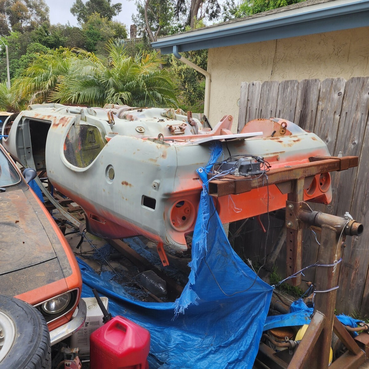 1974 Opel Manta parts car. For body panels only, or complete ground up restoration. Body/frame need minor rust repair (progress was started but not complete on all the rust damage underneath). Vehicle is currently on a rotisserie, which is included in the sale. Buyer will need to transport the vehicle and rotisserie together, or deal with taking it off and determining how to move it.Needs to be out by May 26