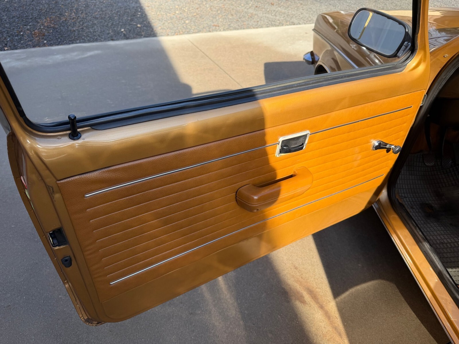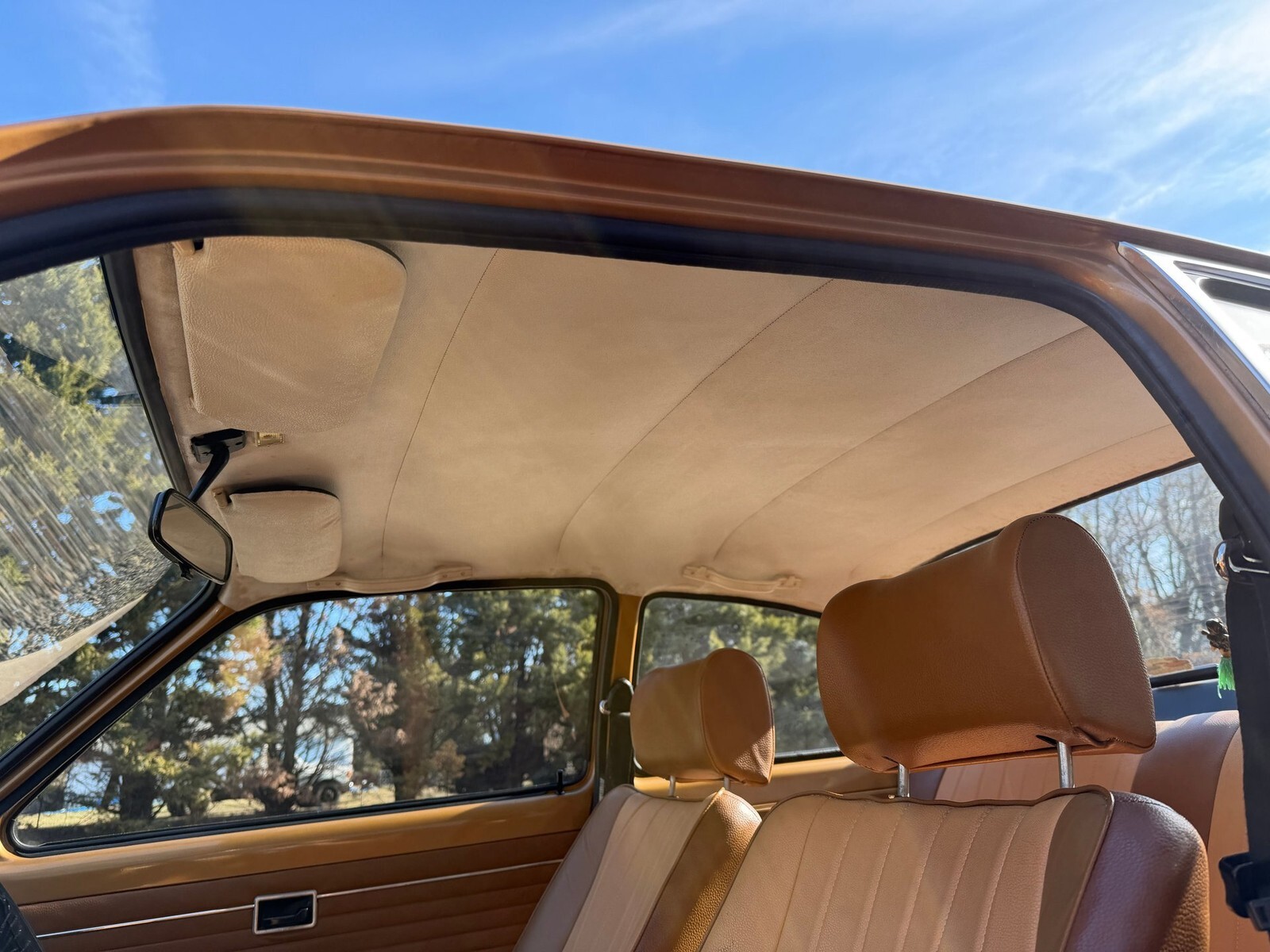 Inside, the cabin maintains its authentic European character with two-tone bucket seats, rubber floor mats, and a German stereo player. The interior layout is simple, functional, and very much in line with the lightweight driver-focused design philosophy of the era. The trunk area remains completely stock and includes the correct trunk mat, board, and spare tire, further reinforcing the originality of the car.