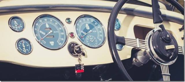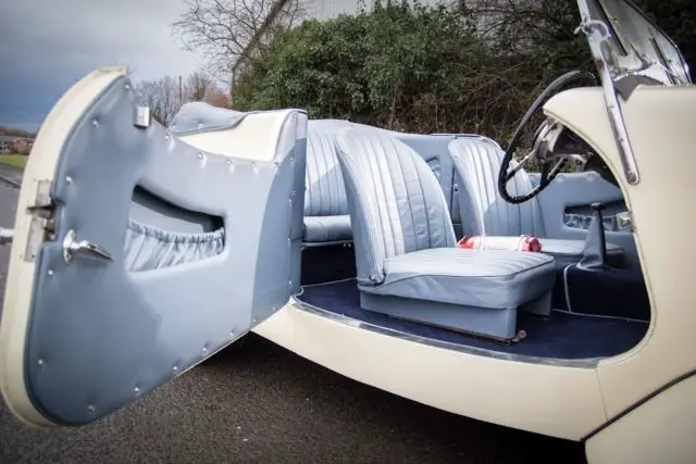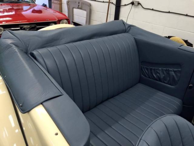 The contrasting navy/beige lined mohair fold down roof is easily erected if required as arethe side screens which have their own storage boxesbuilt intothe rear side leather panels which is another wonderful design feature and the blue faced instrument dials match the " Bira " blue radiator.