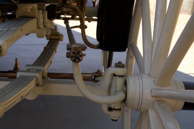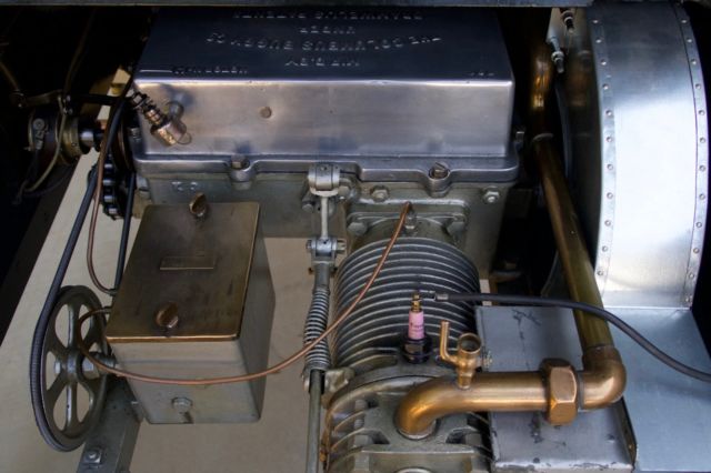 The Firestone-Columbus has a two cylinder air-cooled engine. The fenders are leather, and were replaced during restoration. The tires are old and hard, and do need replacing, but everything else has been fully restored and is in beautiful condition.
