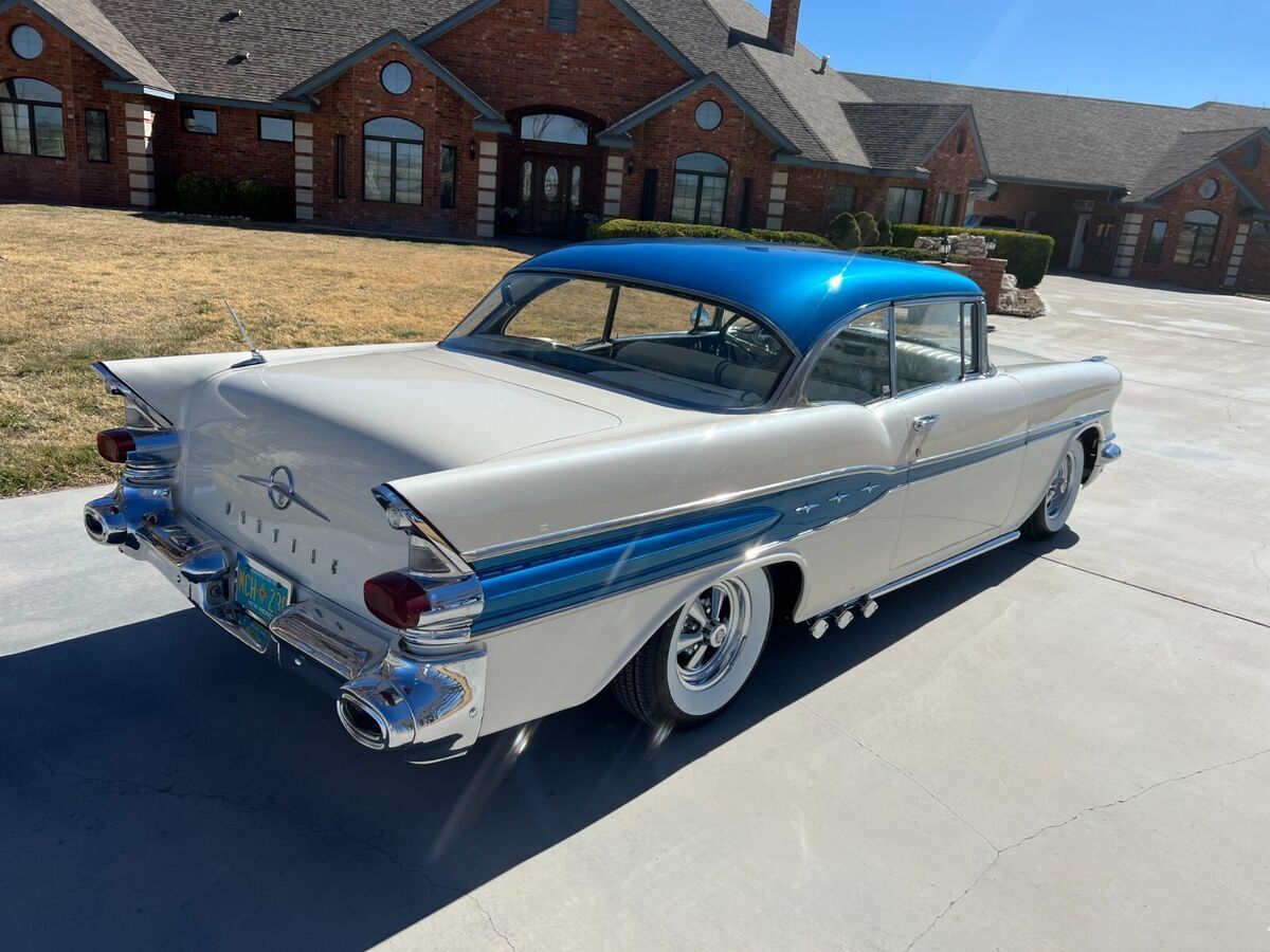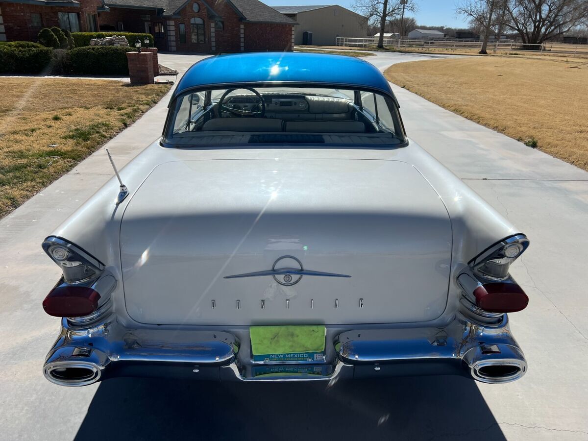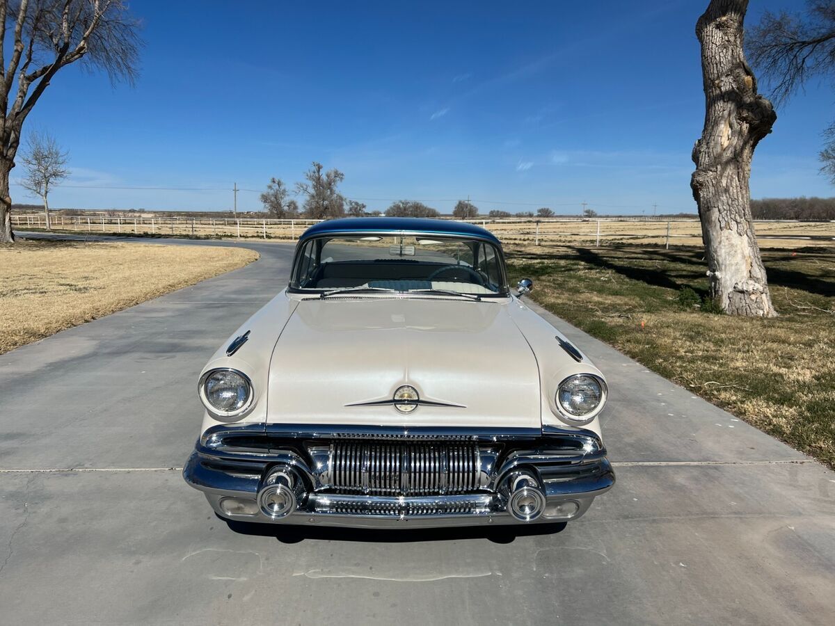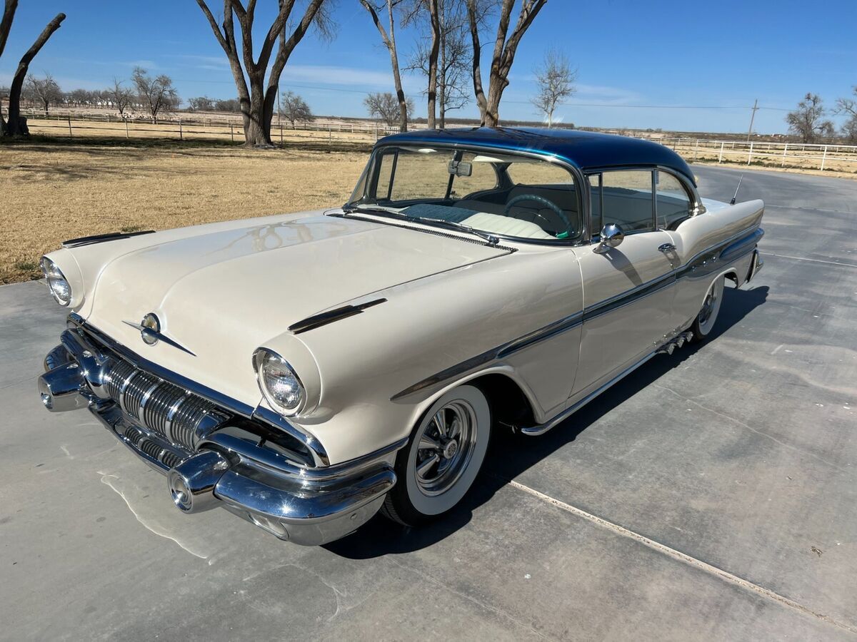 57 Pontiac Super Chief, 389, Hydro trans, Very Clean cruiser. New tires, recent paint in pearl white and metalic blue. New fuel tank. Still has drum brakes and arm strong steering, But a fun cruiser! Chome everywhere on this car and all in Great shape. There is an old school style tonneau cover for the back seat, and a fitted car cover that come with it. Come drive it home or I can work with you or your shipper to pick it up. Feel free to ask any questions, I'll reply as soon as possible.