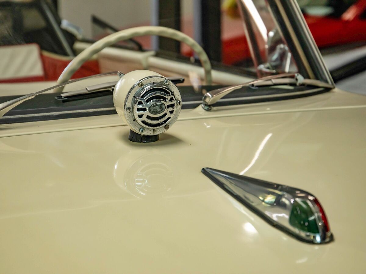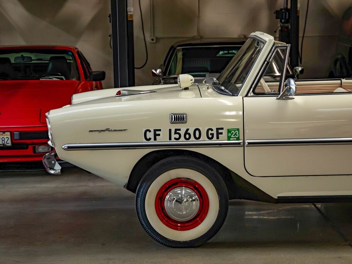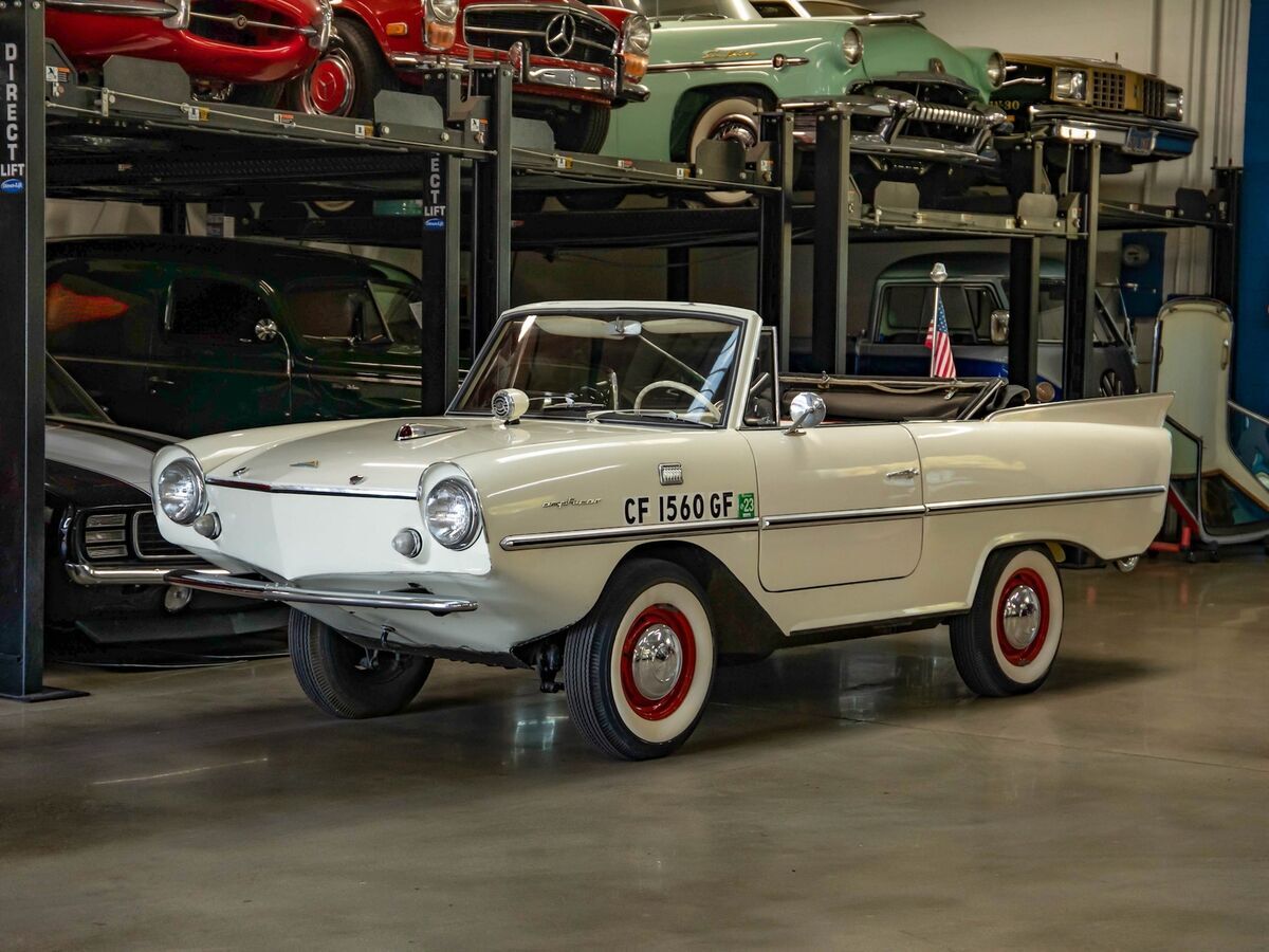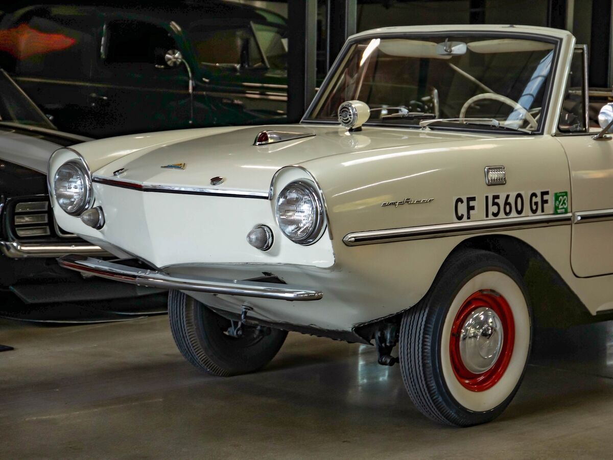 The Amphicar was launched at the 1961 New York Auto Show and was marketed in Germany from 1961-1965 with production of only some 3,878 units ending in 1965. As later mandated for the U.S. Coast Guard it featured navigation lights and a flag. The car features a foldable top which classifies the car as a cabriolet. Its propelled on water by twin propellers mounted under the rear bumper and is built from mild steel with rubber gaskets sealing the doors and with a bilge pump that could be actuated if the scupper level rises!
