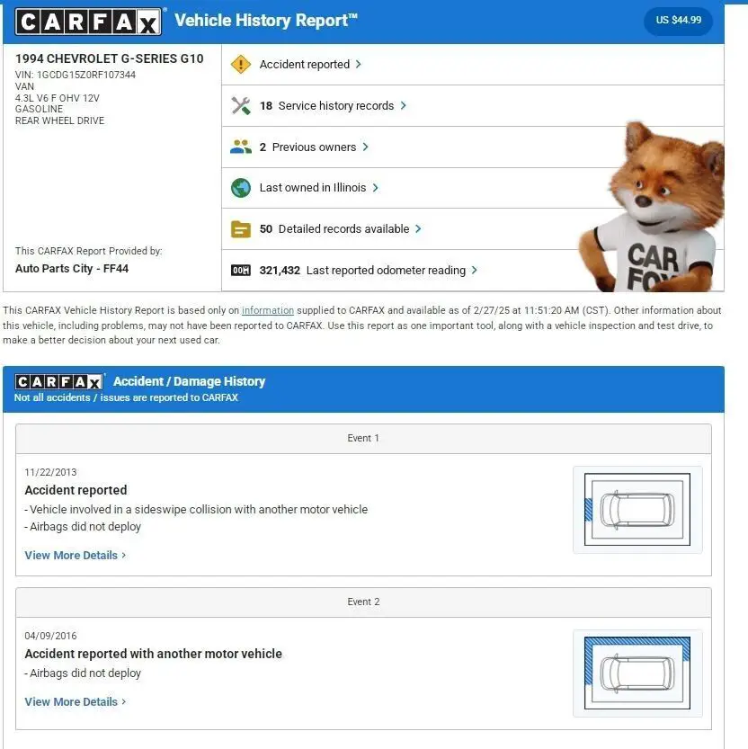 AUTO PARTS CITY / CLASSIC CAR CITY / CITY AUTO SALESGURNEE, ILLINOIS AND PARK CITY, ILLINOIS847-890-8100 - VEHICLE QUESTIONS / INFO1994 CHEVY G10 VANRUNS AND DRIVES CLEAN TITLE - WE SHIP !WE SHIP NATIONWIDE !