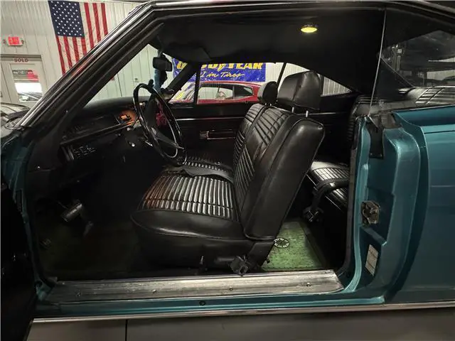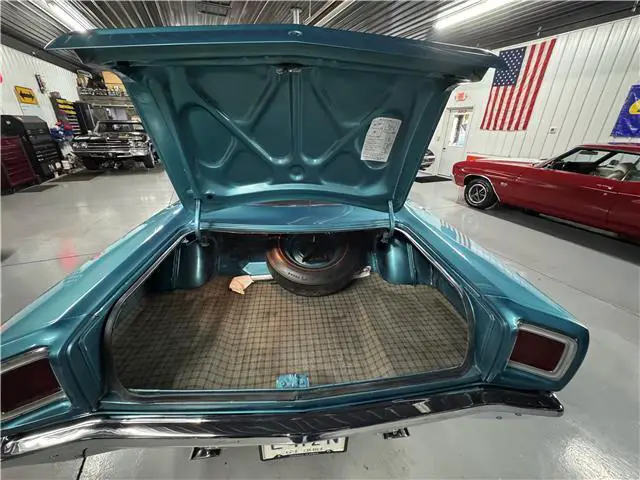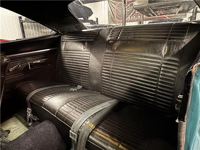 This is one neat Road Runner! It looks amazing with its original color Q5 Seafoam Turquoise, on a clean and rust free body. It is a very straight car from every angle. All body panels are aligned very well and the door jambs are really nice. The finish on this car is smooth and glossy. All the chrome and brightwork are in good shape. The taillights look good (no cracks), the rear bumper has been rechromed and it is very shiny. The door handles are nice, the front grill is original and in nice shape, the front bumper was rechromed and is like new, the turn signal lenses are nice. It has the correct style antenna. The factory glass is in good shape. It rides on a set of original steel wheels painted in the exterior color with nice original hubcaps, wrapped with a set of bias ply red line tires, for that is what it had on it when new.