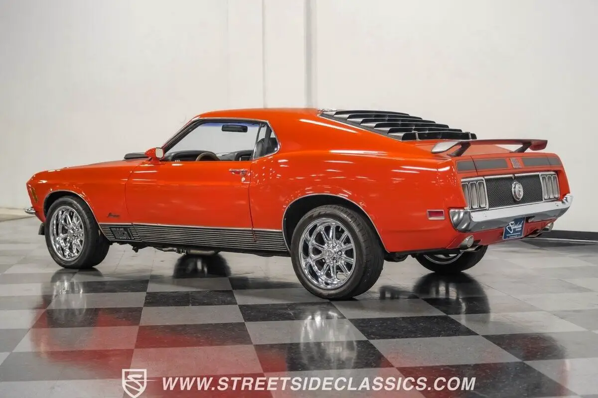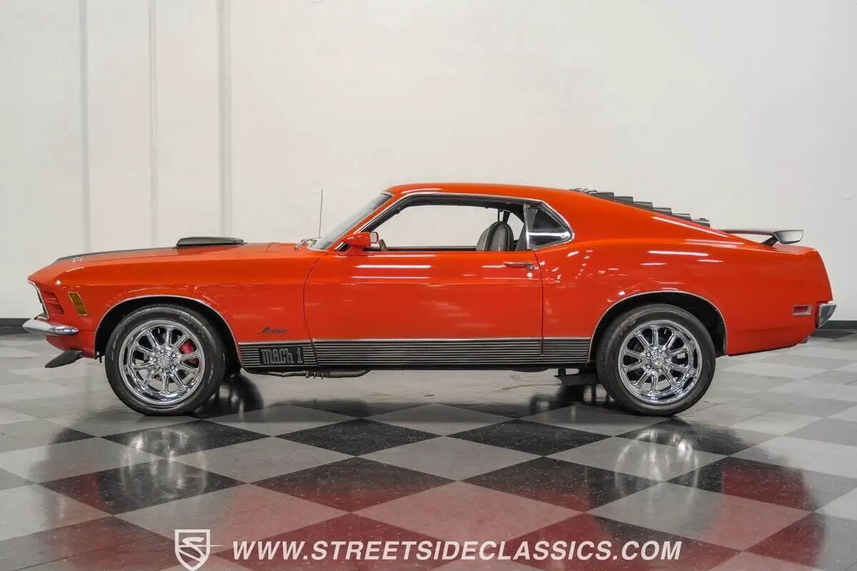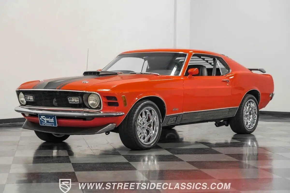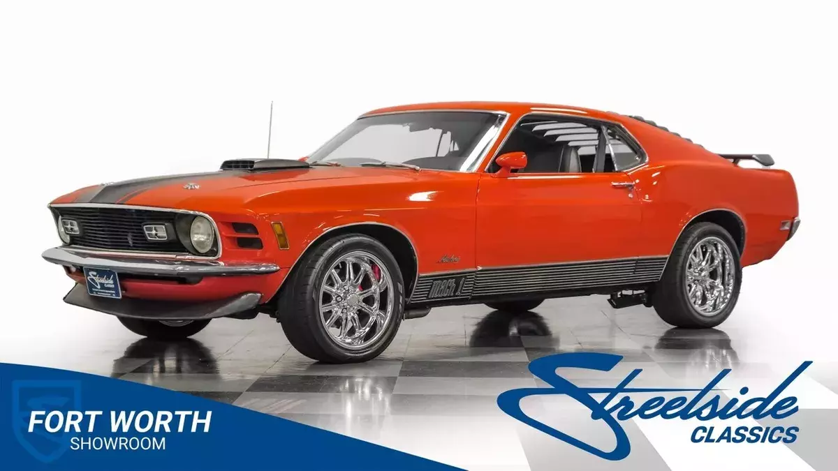 Vehicle Original VIN : 0T05M157308This 1970 Ford Mustang Mach 1 sports a full performance makeover in brilliant Code 1 - Calypso Coral, its factory correct color. Every detail is dialed in, from the race-inspired shaker hood with twin hood pins to the competition-ready black stripes. The menacing stance comes from 17-inch U.S. Mags wrapped in 245/45R17 rubber on all four corners. A curved rear wing and aggressive chin spoiler nail the street-race look, while the rear window louvers add that pure muscle car profile. The black cabin features factory-correct knit vinyl bucket seats anchored by a center console with Hurst shifter. A performance-minded wood steering wheel puts control in your hands, complemented by a modern Holley Sniper EFI display mounted left of the gauges. Vintage Brand air conditioning blasts cold air when you need it, while the AM/FM/AUX stereo brings the tunes. Power steering makes maneuvering this muscle machine a breeze, and new seat belts keep everything secure. The 351 Cleveland V8 was rebuilt just 2,000 miles ago, bored .020 over for extra muscle. A modern Holley Sniper electronic fuel injection system runs the show, while long tube headers feed into a growling FlowMaster dual exhaust. A T5 five-speed manual transmission puts total gear control in your hands. Performance upgrades include front disc brakes, subframe connectors, and street-tough traction bars. An aluminum radiator with both electric and engine-driven fans maintains ideal temps under any condition. HIGHLIGHTS: • 351 Cleveland V8 Engine (2k miles on rebuild) • T5 5-Speed Manual Transmission • Holley Sniper Electronic Fuel Injection • Long Tube Headers • FlowMaster Dual Exhaust • Front Disc Brakes • Subframe Connectors • Traction Bars • Aluminum Radiator with Dual Fans • New Steering Box • Calypso Coral Paint with Black Stripes • Shaker Hood with Hood Pins • Rear Window Louvers • Rear Wing • Chin Spoiler • 17" U.S. Mags with 245/45R17 Tires • Black Interior with Bucket Seats and Console • Power Steering • Vintage Brand Air Conditioning • AM/FM/AUX Stereo • Build Sheet • Marti Report Well documented with the Marti Report, Factory Buildsheet and Dealer Invoice, this 1970 Ford Mustang Mach 1 combines classic muscle with modern performance. The built 351 Cleveland, five-speed manual, and fuel injection deliver pure street performance. Call today!