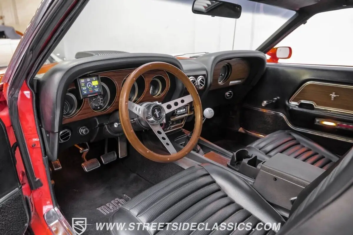 This 1970 Ford Mustang Mach 1 sports a full performance makeover in brilliant Code 1 - Calypso Coral, its factory correct color. Every detail is dialed in, from the race-inspired shaker hood with twin hood pins to the competition-ready black stripes. The menacing stance comes from 17-inch U.S. Mags wrapped in 245/45R17 rubber on all four corners. A curved rear wing and aggressive chin spoiler nail the street-race look, while the rear window louvers add that pure muscle car profile.