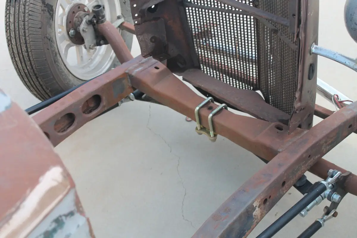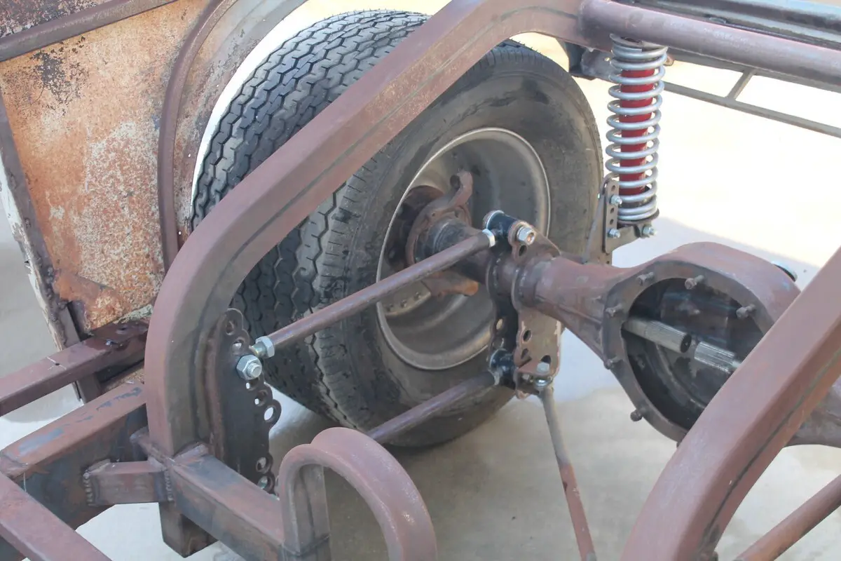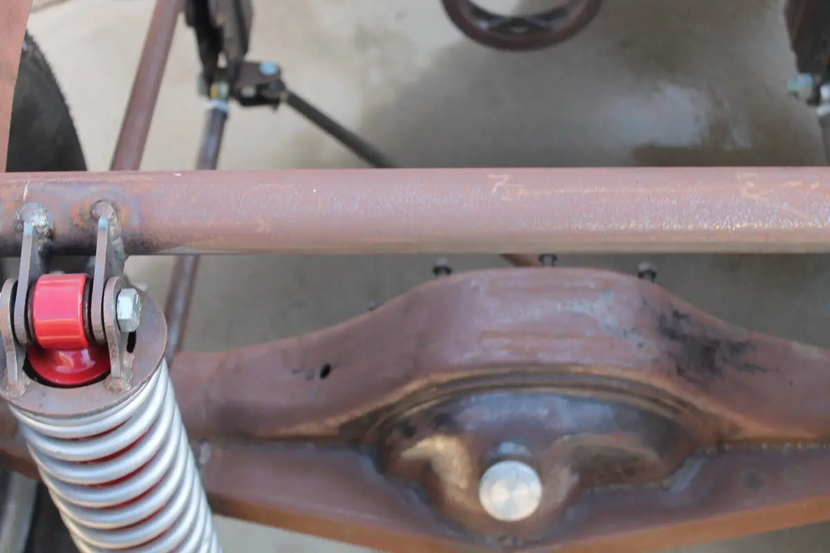 - 6" drop tube front axle with chevy spindles, lateral leaf springs. Radius rods, All by speedway motors.