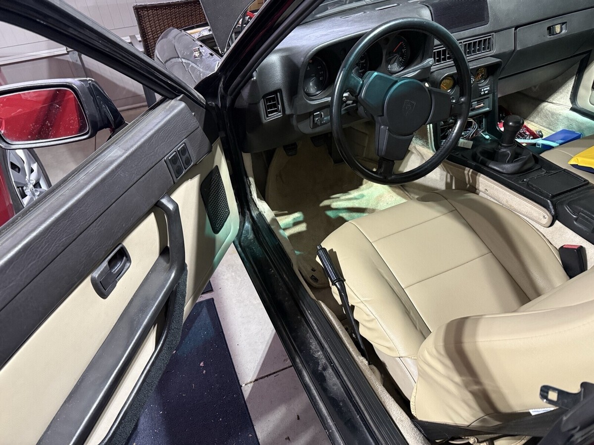 1988 Porsche 924s in black w tan interior. Odometer shows 120k & is inoperable. No service records. Belts look newer. Manual & maintenance book included.