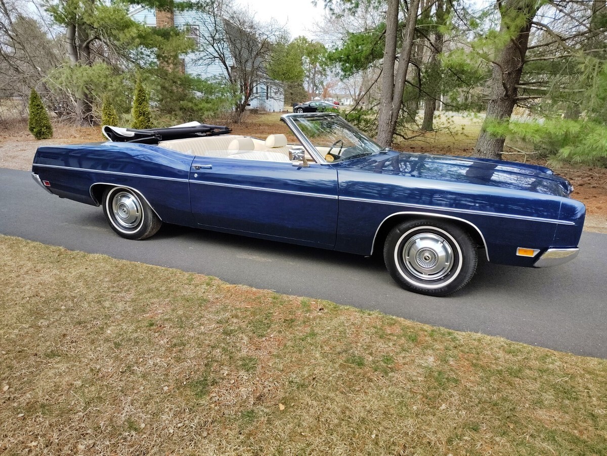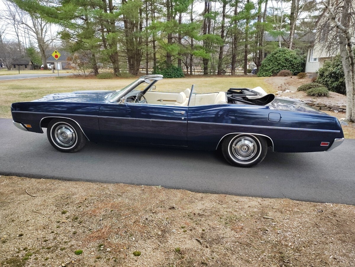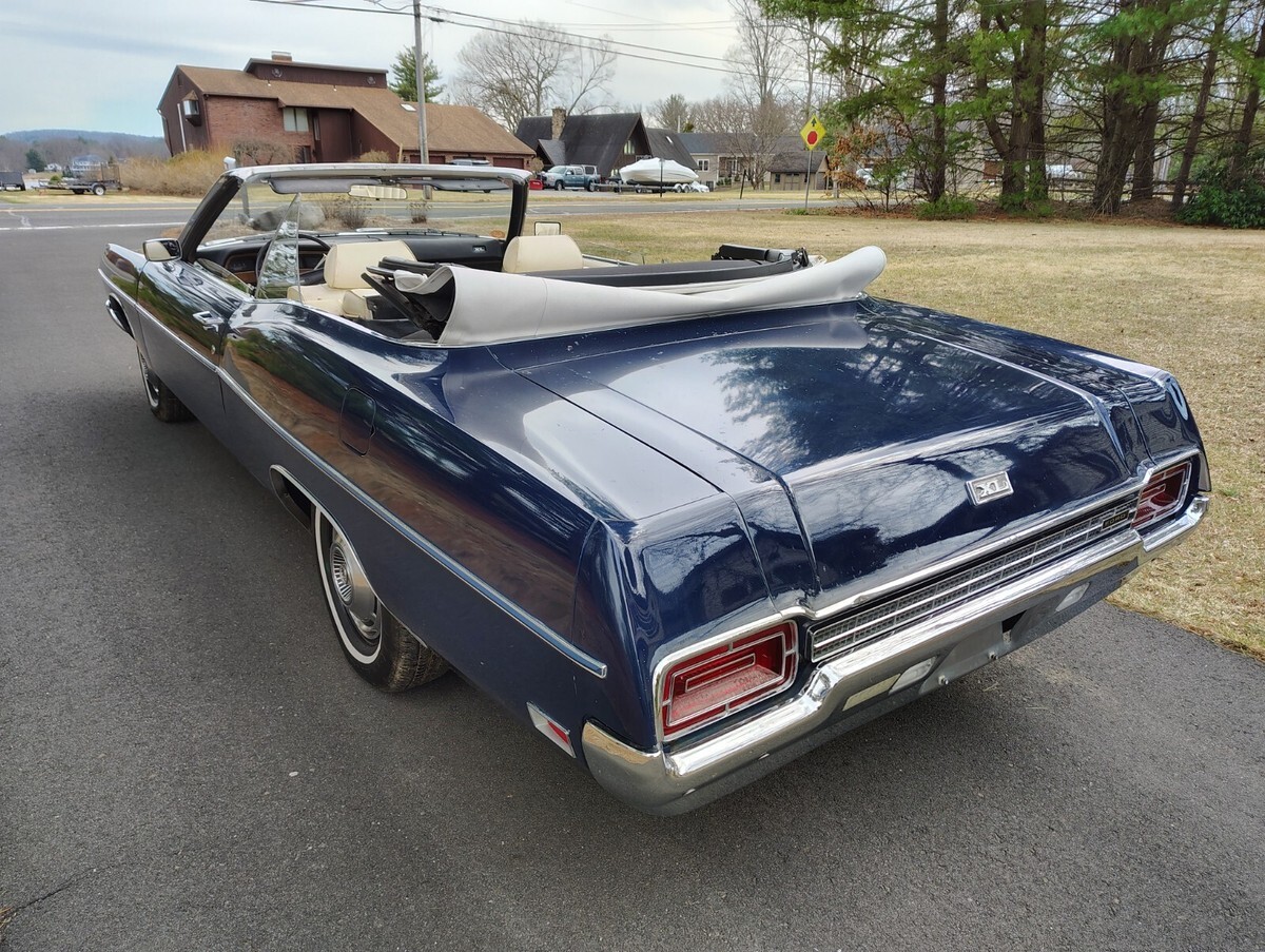 1970 Ford XL Convertible 351w, automatic, one family owned 16,300 original mile survivor purchased brand new at Crailo Ford by Mrs Bender on May 20, 1970. Rare car 1 of 44 built with this color trim code have Marti report, Dark blue with white power top and white interior, factory disc brakes, power steering, factory radio delete believed to be the only one built with radio delete. Have original Ford dealership sales booklet, protecto plate, and service records, original paint, interior, spare tire, single exhaust, engine bay original hoses, clamps, no spray can touch ups, has factory OK stamped on block, interior all original normal cosmetic wear split on seat, crack on dash, drives great, tires look like brand new but were put on in 1988 when car had 14,000 miles, original paint has some patina spots as expected on a 55 year old car and has a small imperfection on the passenger door, convertible top is excellent condition was replaced 15 years ago due to age discoloring top works but goes up slow needs hydraulic fluid added, original power headlights open as they should. Owned by one family since new until I purchased it last year have clean title in my name, ready for summer cruising and car shows.