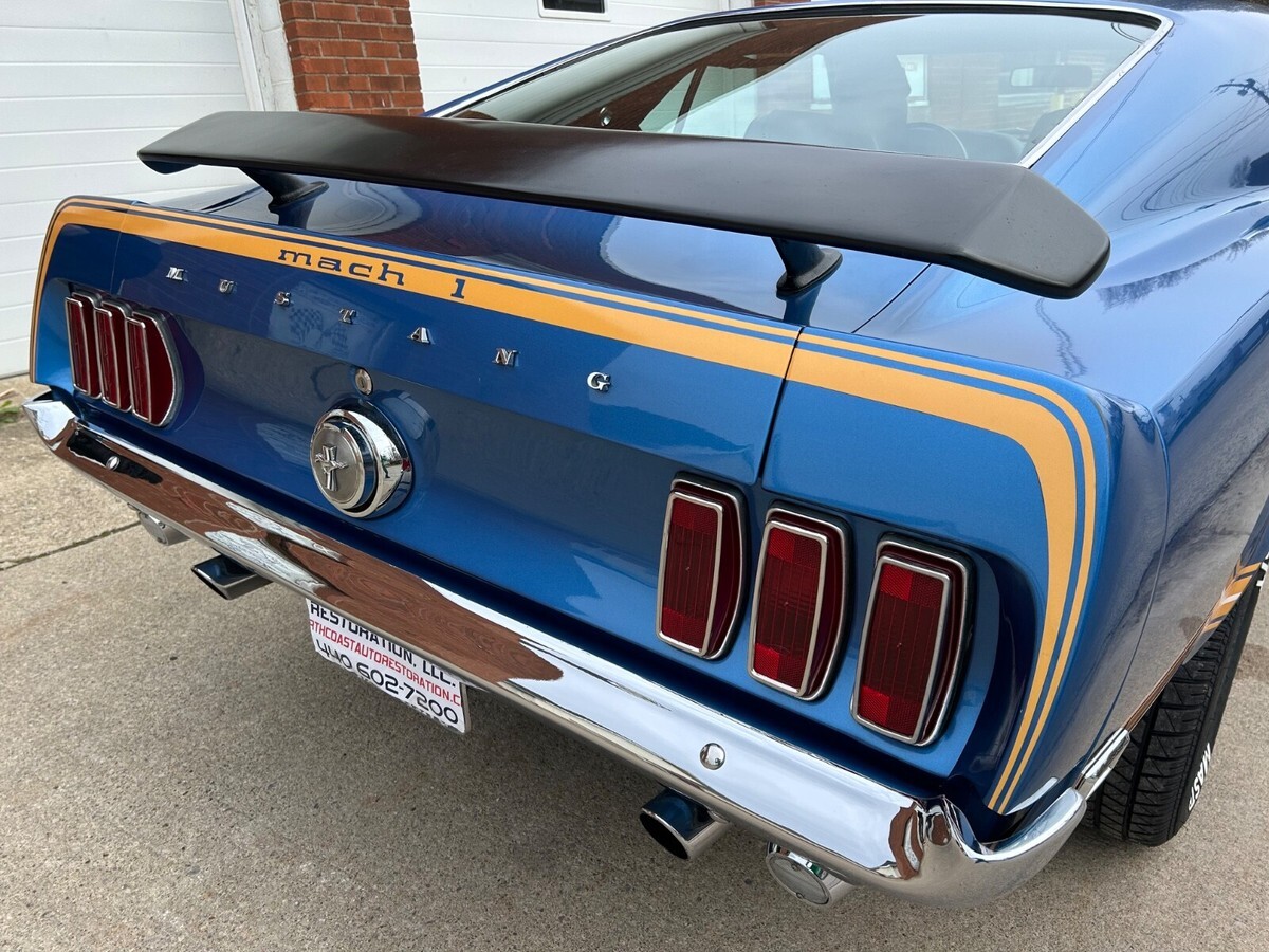 BODY/FRAME/PAINT..Vehicle has original frame in perfect rust free condition.The undercarriage is in outstanding rust free condition. This vehicle sports all of its original Ford sheet metal. The body is straight all panels, line up exceptionally well, and during the thorough restoration this vehicle was refinished in its original Acapulco blue color code 6. Despite being an older paint job, the finish presents almost like a new paint job. It has a straight, flat, very glossy, high end finish. There are a couple minor chips that have been brush touched. Again, there is no damage, these are simply minor blemishes consistent with an older paint job. This car is stunning and would look amazing at any car show.Duringthe comprehensive restoration almost all of the chrome and exterior trim was replaced with new, and since this car wasn’t driven much, everything still appears essentially as new. This Mustang has also received new weatherstripping throughout, along with a brand, new front chin, spoiler. The mach-1 decals still look great, and the black out treatment still looks new as well.Inside, outside, underneath, and mechanically this mustang looks much more like a fresh restoration than not. Everything looks pretty much new throughout.Please see pictures and check out YouTube videos, at the links below.