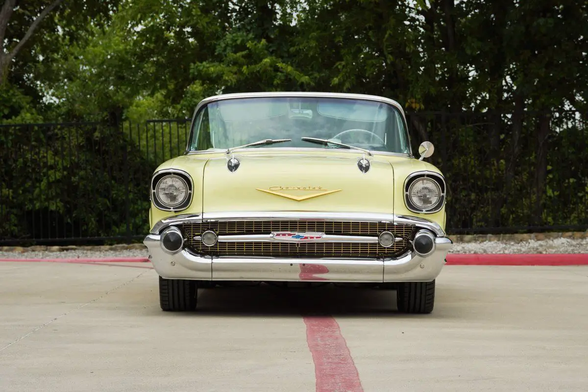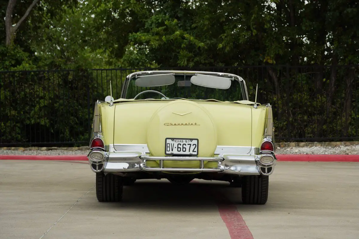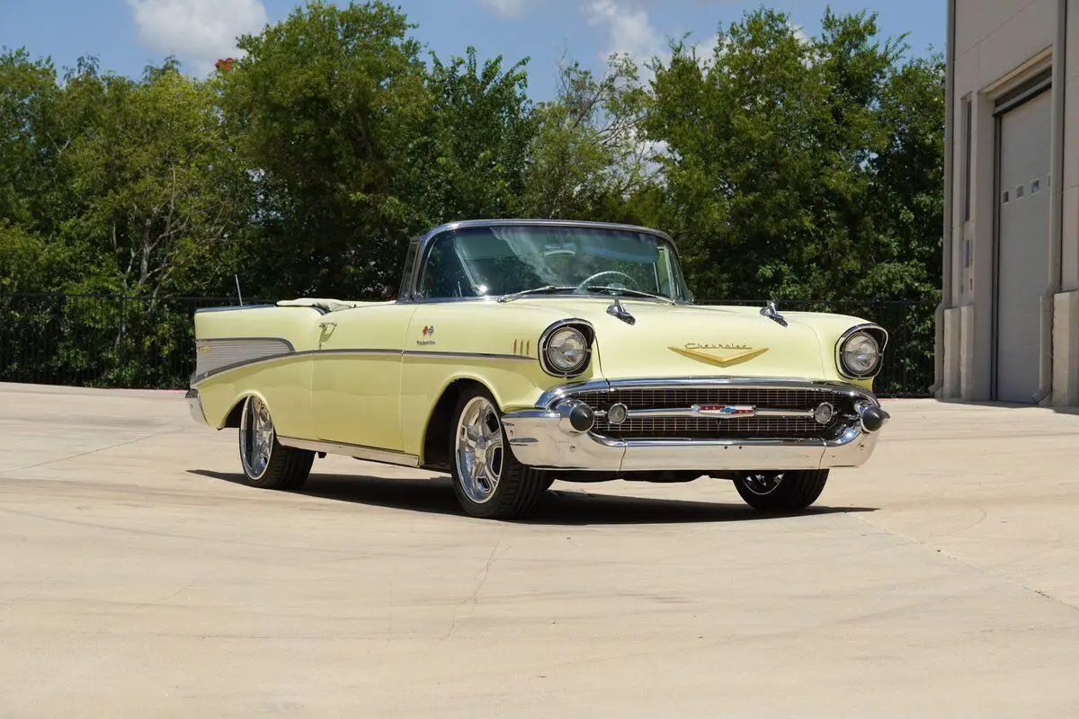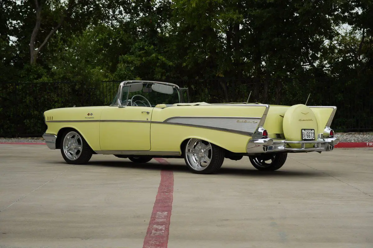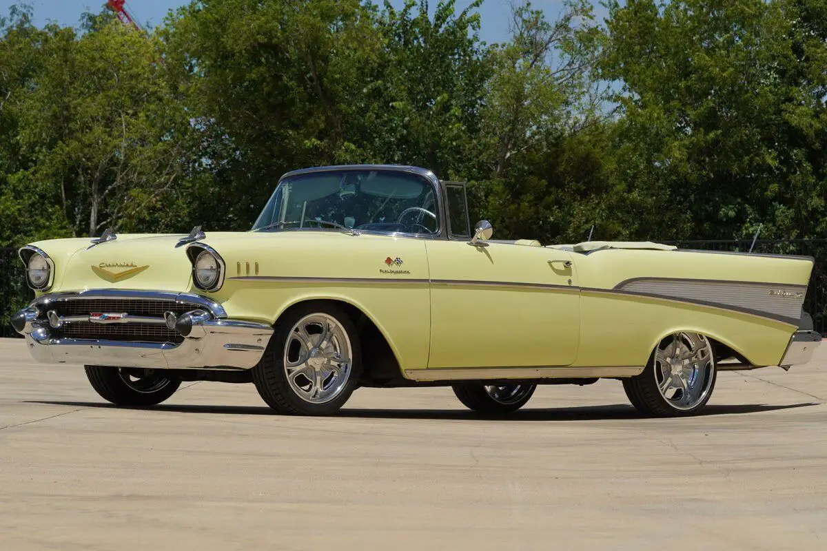 Vehicle Original VIN : VC57J151777See tis car on Hotrodcollection .com We Welcome Trades Factory-type wheels, tires, and spinner hubcaps come with the car (the only modifications!) Built in Janesville, WI Drive-train:?Original "EK" engine designation 283ci/283HP solid lifter Ramjet fuel injected?Fuel injection rebuilt Viton seals. Original 3731539 heads, M56 Radiator, 6L28 Generator, #7014360 Fuel Injection system (which is the Early 1st generation fuel injection w/snowflake "winters" foundry mark on top of plenum unit), and a #3731548 block, exhaust manifolds are #3733976 RH and #3733975 LH, transmission is numbered #3845122 with date code 107 GM 3 speed manual?Stock 3 on the column configuration with a HD clutch Rear differential #3725899 (equals open axle date coded L106 - Dec. 10, 1956). Stock brakes & stock suspension w/HD springs. Interior: Correct Yellow & Silver upholstery Period correct orange needle gauges?AM push button radio w/optional Wonder-bar radio Electric clock, power top, heater & defroster, courtesy lights, glove box light, cigarette lighter, vanity mirror, & dash prism "trafficator Exterior: Paint Colonial Cream, continental kit, chrome spinner hubcaps, dual rear mount antenna, wide white wall nylon bias ply square tires, E-Z eye tinted glass, cushion-air bumper guards, SS chrome package (trunk trim and door handle guards), dealer installed radiator bug screen. Car comes with Factory original wheels and tires as wel as the Mounted Schott Front Custom 18 inch wheels and Schott Rear Custom 20 inch wheels. The biggest auto news of 1957 was the introduction of "Ramjet" fuel injection manufactured by GM's Rochester carburetor division and developed by John Dolza, E.A. Kehoe, Donald Stoltman and Corvette chief engineer Zora Arkus-Duntov. It was optional equip- ment on the 1957 Corvette engines, and could also be had on V-8's powering any other Chevrolet car. The first Rochester fuel injection unit was #7014360. Very early units did not have the familiar black Rochester Products I.D. tag, and the unit number (serial) was stamped into the lower front of the plenum vertical face. Early plenums had the "Winters Snowflake" cast in the ribbed area of the plenum. Research shows that in very early 1957, production with the 4360-fuel injection unit used the 1957 Corvette-style air cleaner. The passenger car F.l. air cleaner was not available early in the 1957 production year." As a result, assembly line workers installed the Corvette-style chrome air cleaner to this already special convertible. Purchased from an Automobile Museum Full frame off restoration in 1999 costing over $100,000 MATCHING NUMBERS DRIVETRAIN
