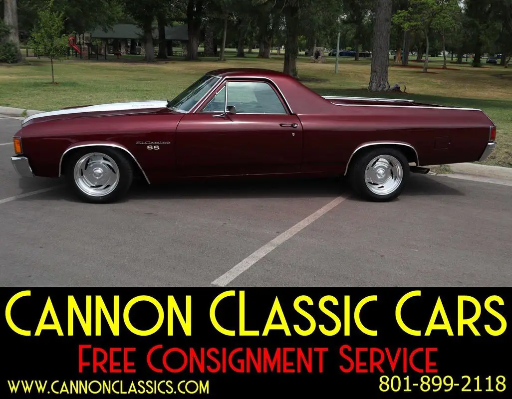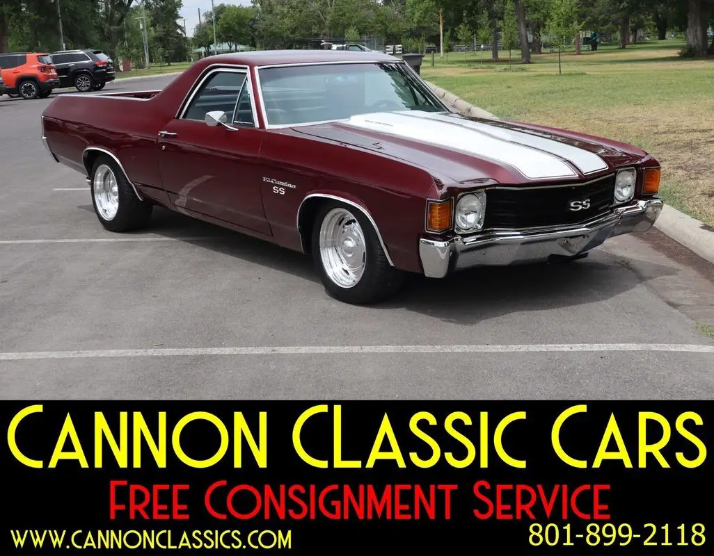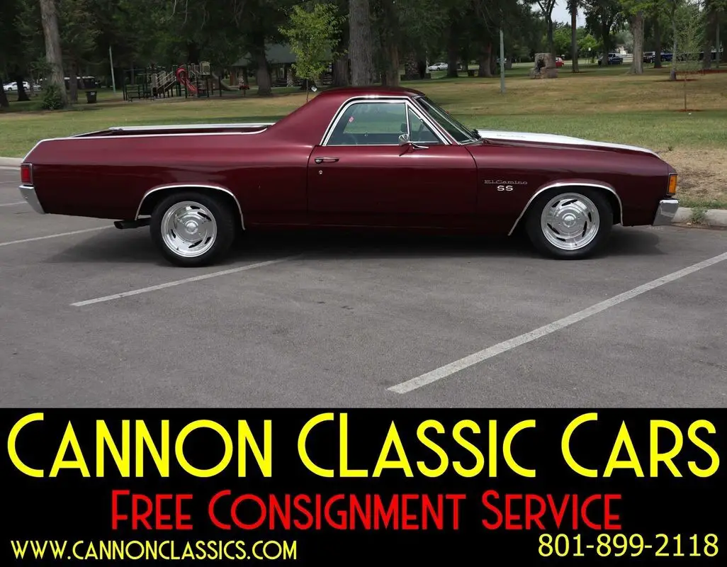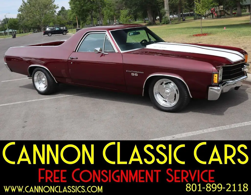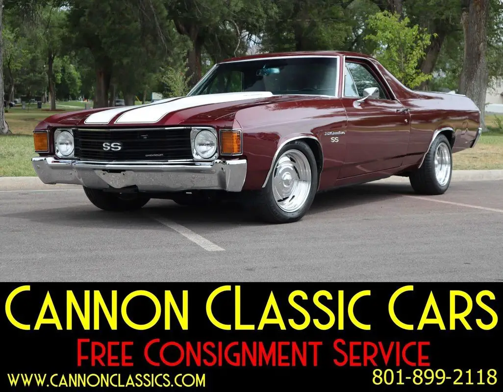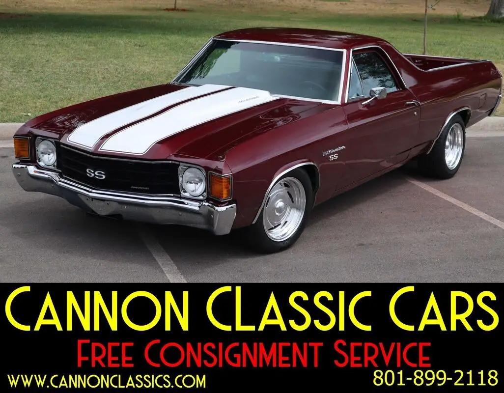 1972 Chevrolet El Camino -350cui Chevrolet V8 -TH350 3 Speed Automatic -Edelbrock Intake Manifold and 4 Barrel Carburetor -Aftermarket Dual Exhaust -Repainted Dark Maroon -Color Matched Spray-In Bed Liner -Black Leather Interior -Center Line Chrome Wheels -Working Heat -Power Brakes, Disc Front, Drum Rear -Chrome Brake Master, Polished Booster -Aftermarket Radio and Speakers -Rear Air ShocksDo you have a great consignment like this one? Let us sell it for you! We offer a zero-cost consignment service. Financing is available, so please call us for more information at 801-899-2118. We are a licensed and bonded dealership in the state of Utah, with Utah Dealer License #148B.This vehicle is available for viewing in our showroom at Cannon Classic Cars, located at 809 W 1700 S, Salt Lake City,Utah 84104. We would love to talk to you about this classic! You are always welcome and encouraged to visit the vehicle in person. You can also text us at 801-999-0513 with any questions.Please note that this vehicle is sold as-is, with no warranty expressed or implied, and is mileage exempt. The buyer is responsible for shipping arrangements and costs. Deposits are non-refundable.