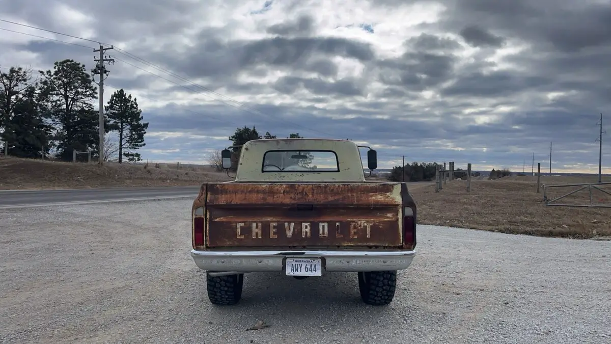327 engine, rebuilt th350 / np205 transfer case. 3.73 gear ratio, posi traction, front disc brakes, and power steering. 33/12.5/15 tires.