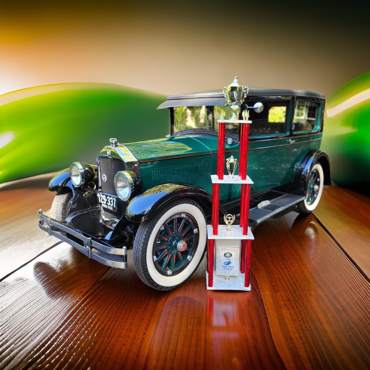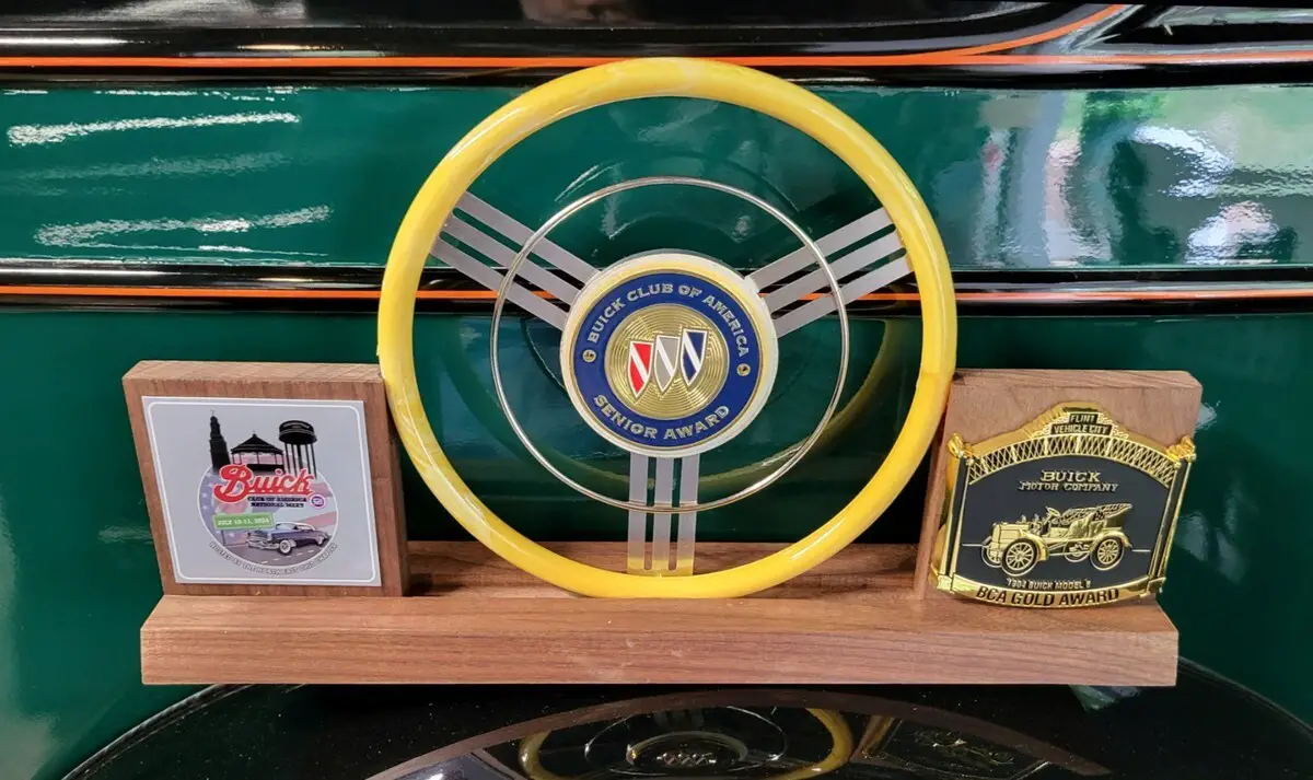 Wood floors and wood structures in the doors and roof are replaced with new solid oak parts using original templates obtained by the engineer. There is no soft wood. A complete set of tools including the hand crank starter, brass air pump and jack are stowed in the floor compartment. Extra parts include new Champion W16Y spark plugs, uncut interior fabrics, and a spare water pump impeller. This car won the six-foot trophy and a First Place Award from the Buick Heritage Alliance at the 41st Arthritis Foundation Charity Auto Show in Ohio. This car won a Senior Gold Medal at the Buick Nationals held in Cleveland, scoring 396 out of 400 possible points. Trophies, a BCA LED illuminated logo and many spare parts are included with this auction.