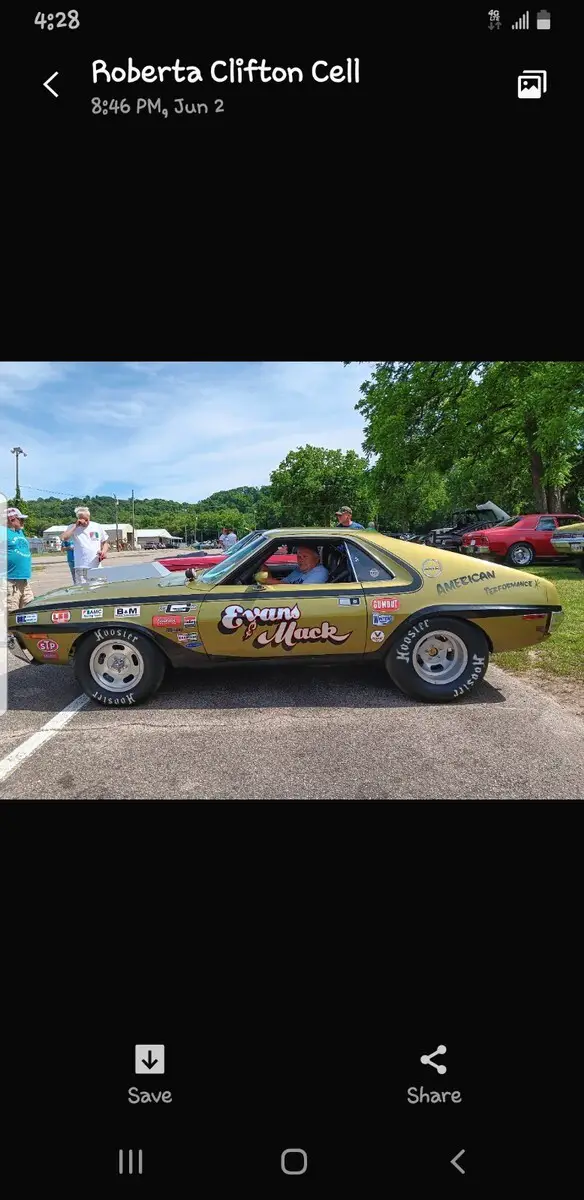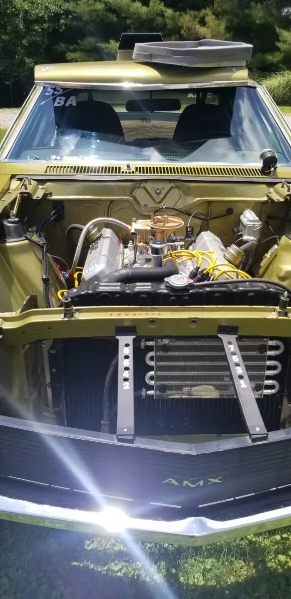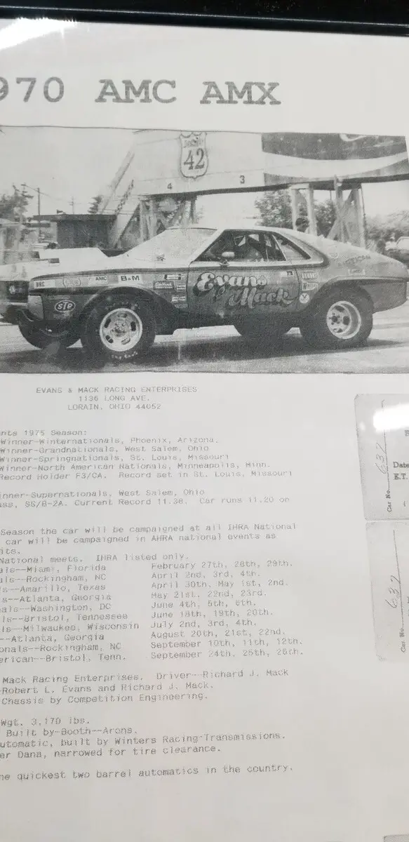 Taking car to Kenosha AMC shoe July 24th -26th.This1970 amx was converted to a drag car in the early 70s. Motor was build by Booth & Arons ( still has this motor in the car) motor made over 500 hp with the 2 barrel carburetor sitting sideways. The AMX was campaigned through out the 70s in the SS3BA class where it was the fastest 2 barrel drag car in the US in the mid 70s. Motor and transmission have been freshened up with 0 passes. Brakes have been upgraded to disc front and rear Dana 60 rear end with 5.57 gears. No longer have original 2 barrel carburetor. Recreated original set up with the 2 barrel. Have the 1050 Dominator set up to run on car also