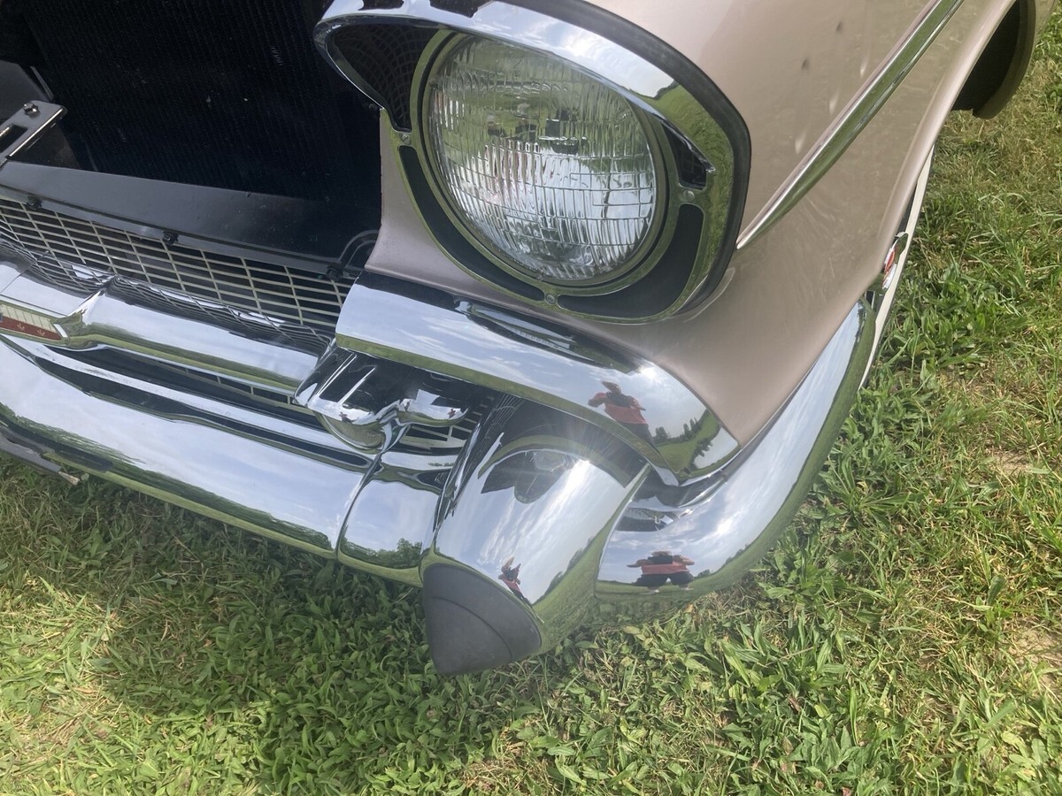 1957 Chevy 210. Yes, it’s a four-door and it’s a six cylinder but it’s the nicest four-door six-cylinder you’ll ever see with an automatic transmission runs excellent no rust no holes.No rust on frame or body mounts and frame mounts No dents. Interior is near. Perfect clock does not work. Radio is static underneath that a car is perfect very little surface rust all the body mounts are perfect. This car is in Forestville New York must see this vehicle is to be sold as is like any other Barrett Jackson car payment by cash or bank to bank money wire transfer with in 2 days this is the only way no paypal. Come and look at this car. It is perfect.No power steering or power brakes