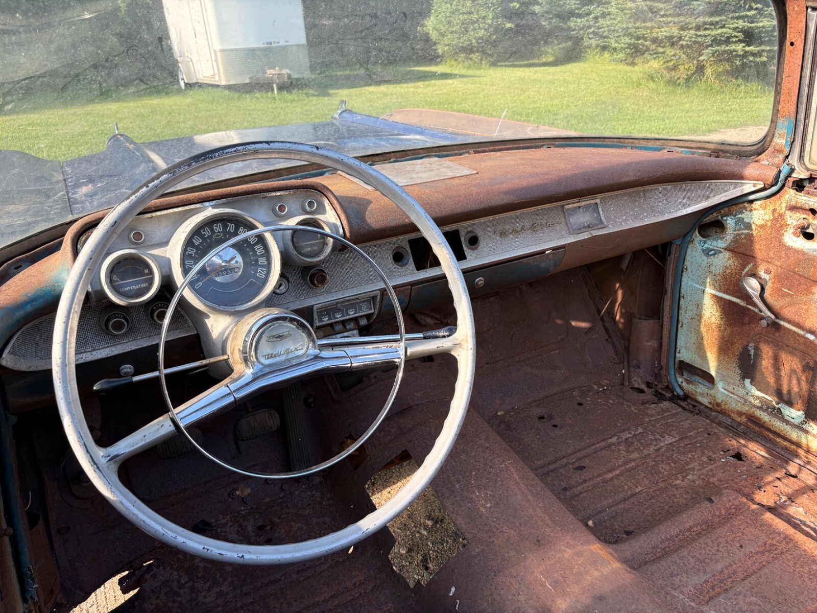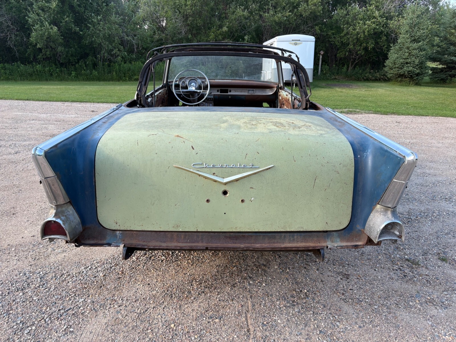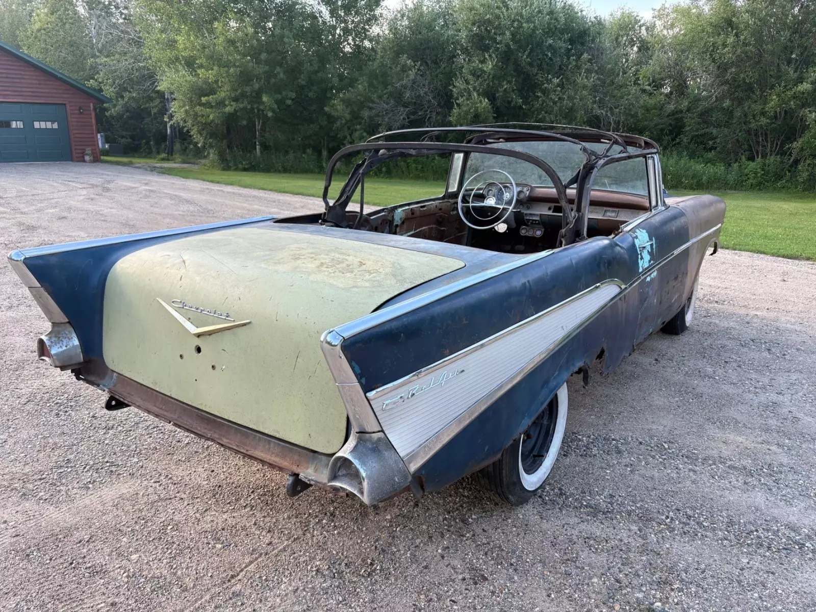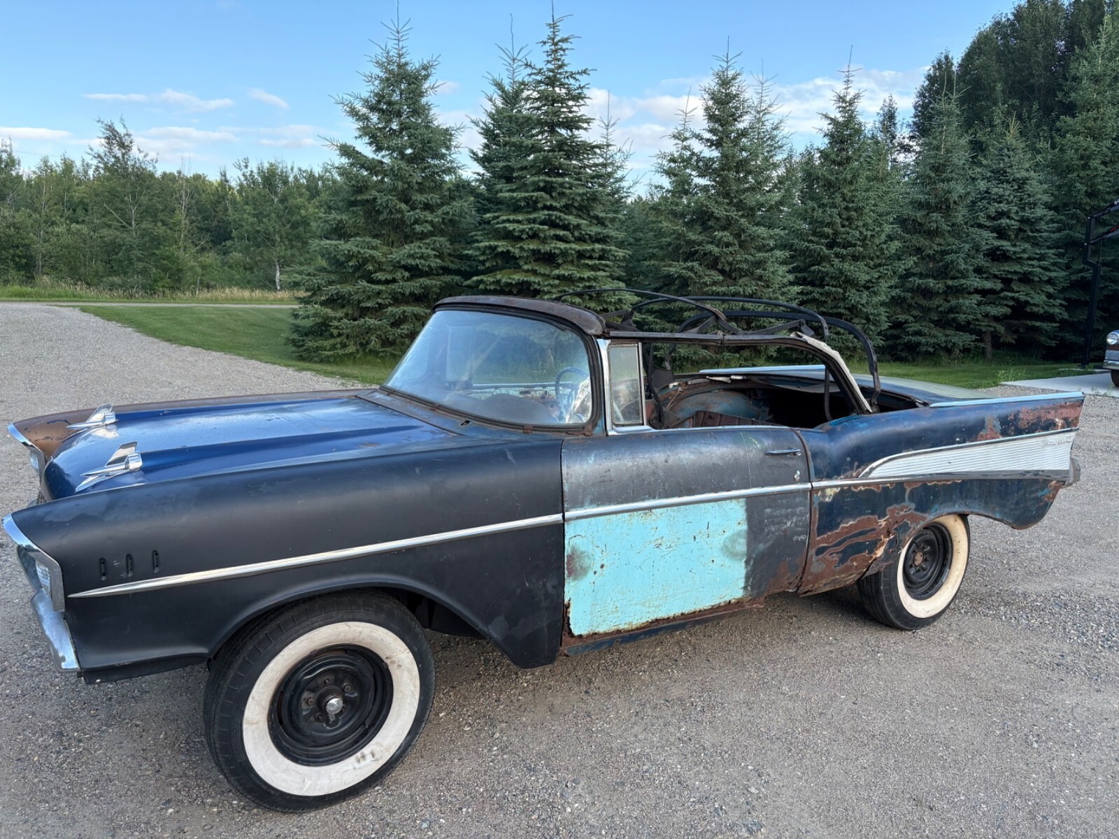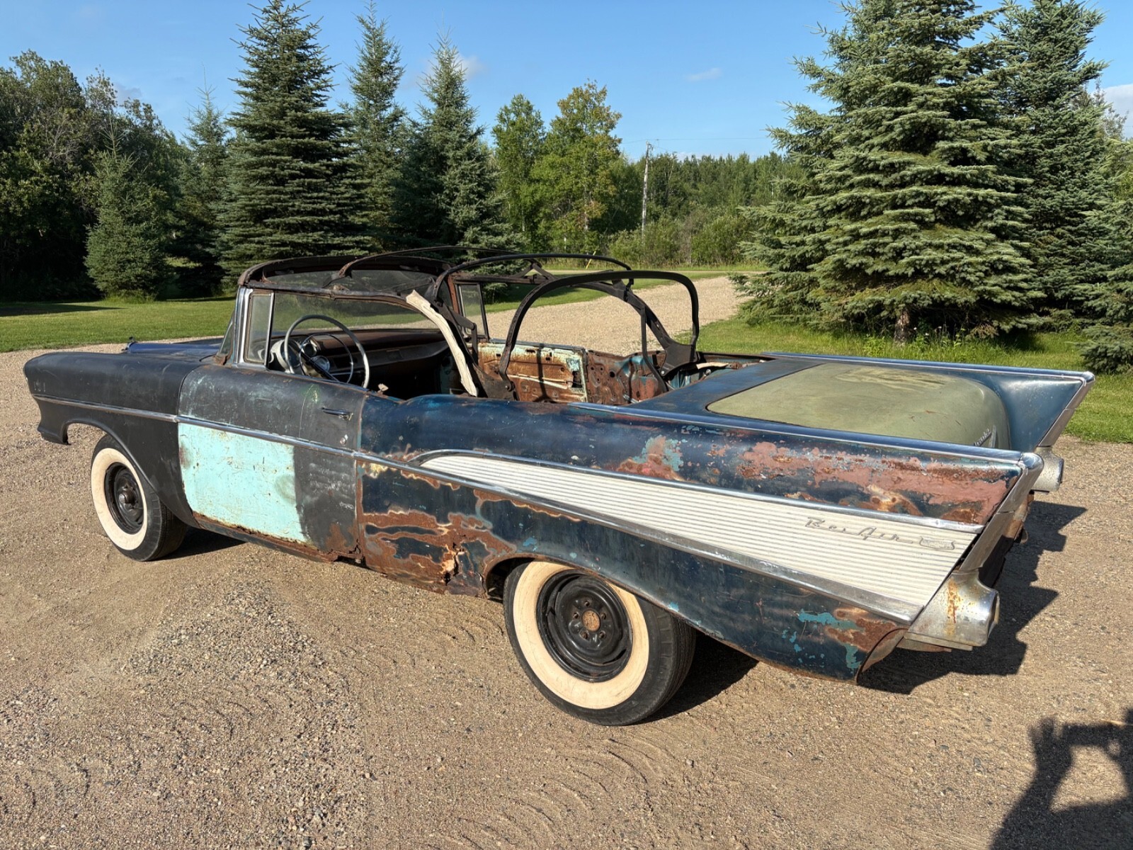 Up for sale is a 1957 Chevrolet Bel Air convertible project. This car was harbor blue from the factory. It still wears its original Vin tag and trim tag. The car has a clean title.This car needs a total restoration. What you see in the photos is what goes with the car and nothing more. The Floor and trunk pan is rusty. The rockers are rusted out. The convertible top frame is in usable condition. Car does not have any seats. Trunk lid is usable. Engine is an original 1957 Chevrolet 283 with two barrel carburetor. The engine turns over freely, but is not 100% complete. Missing exhaust manifolds and various unknown parts. This engine is a good rebuildable original 57 283.This car was a manual shift car but currently does not have a transmission. I have the front inner fenders and hooded fresh air vent/ducts that will go with the car.